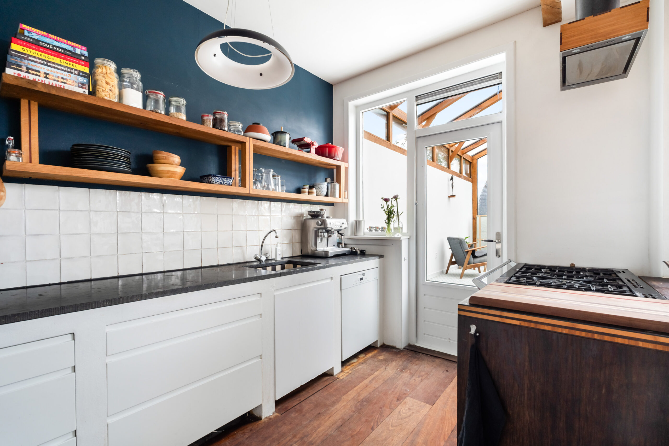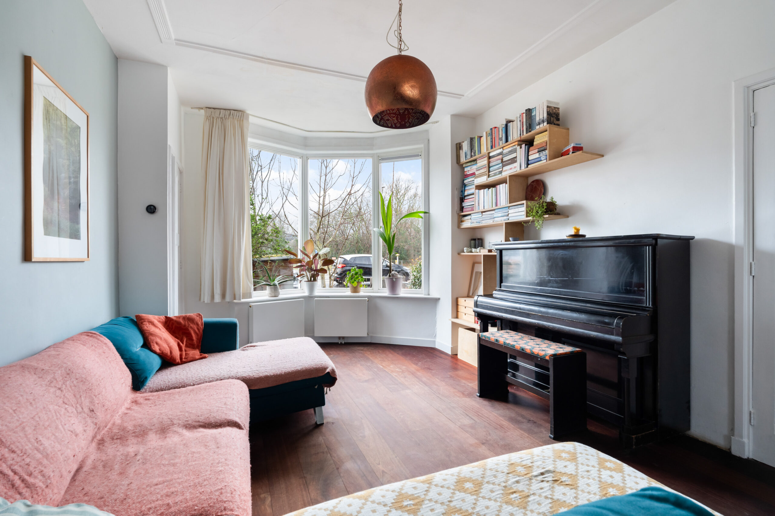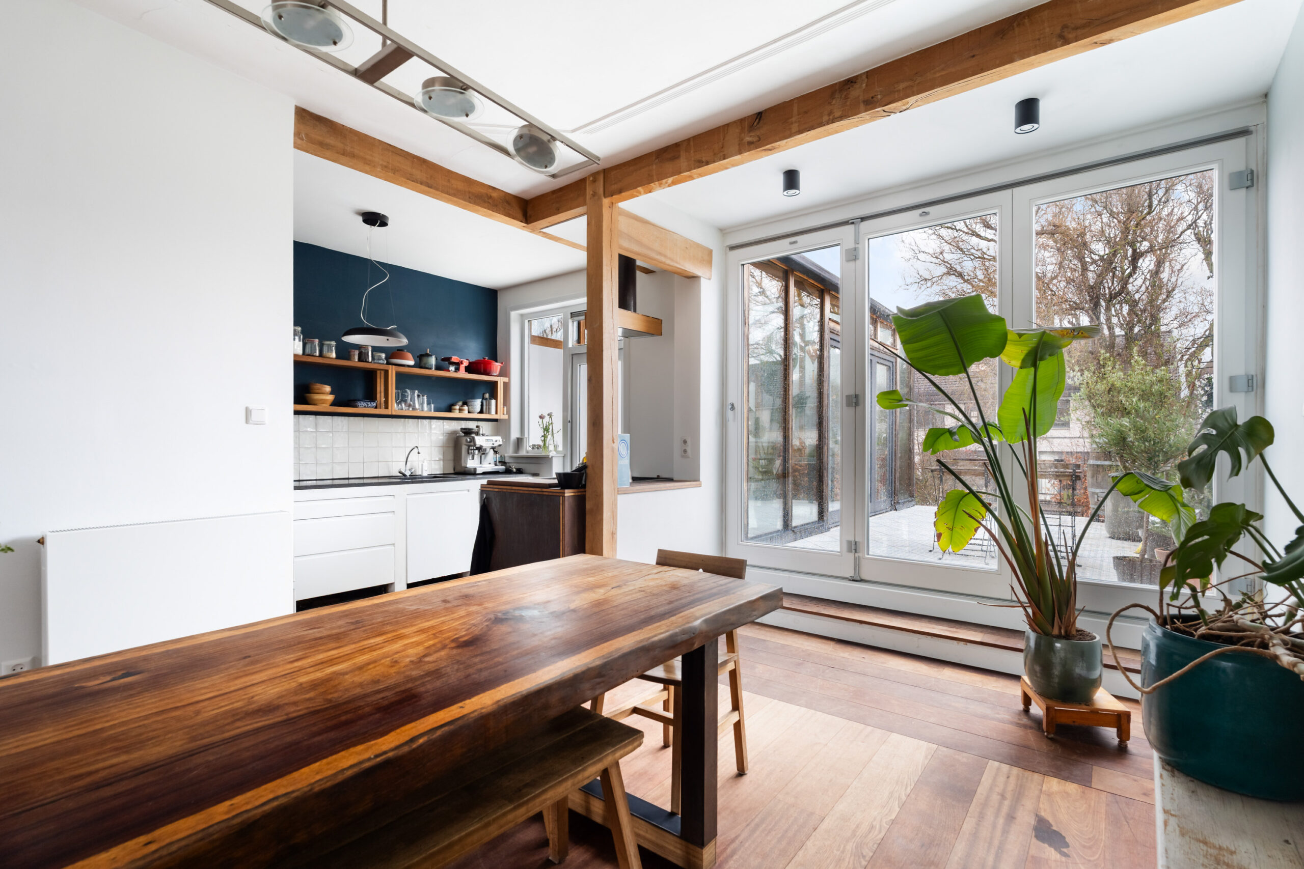 – In 2020 uitgebouwde woonkamer met sfeervolle erker aan de voorzijde en prachtig uitzicht op de Watertoren, houten vloerdelen van jatoba hardhout, gestuct plafond en harmonicadeuren naar het achterterras met een vrije opening van circa 3 meter