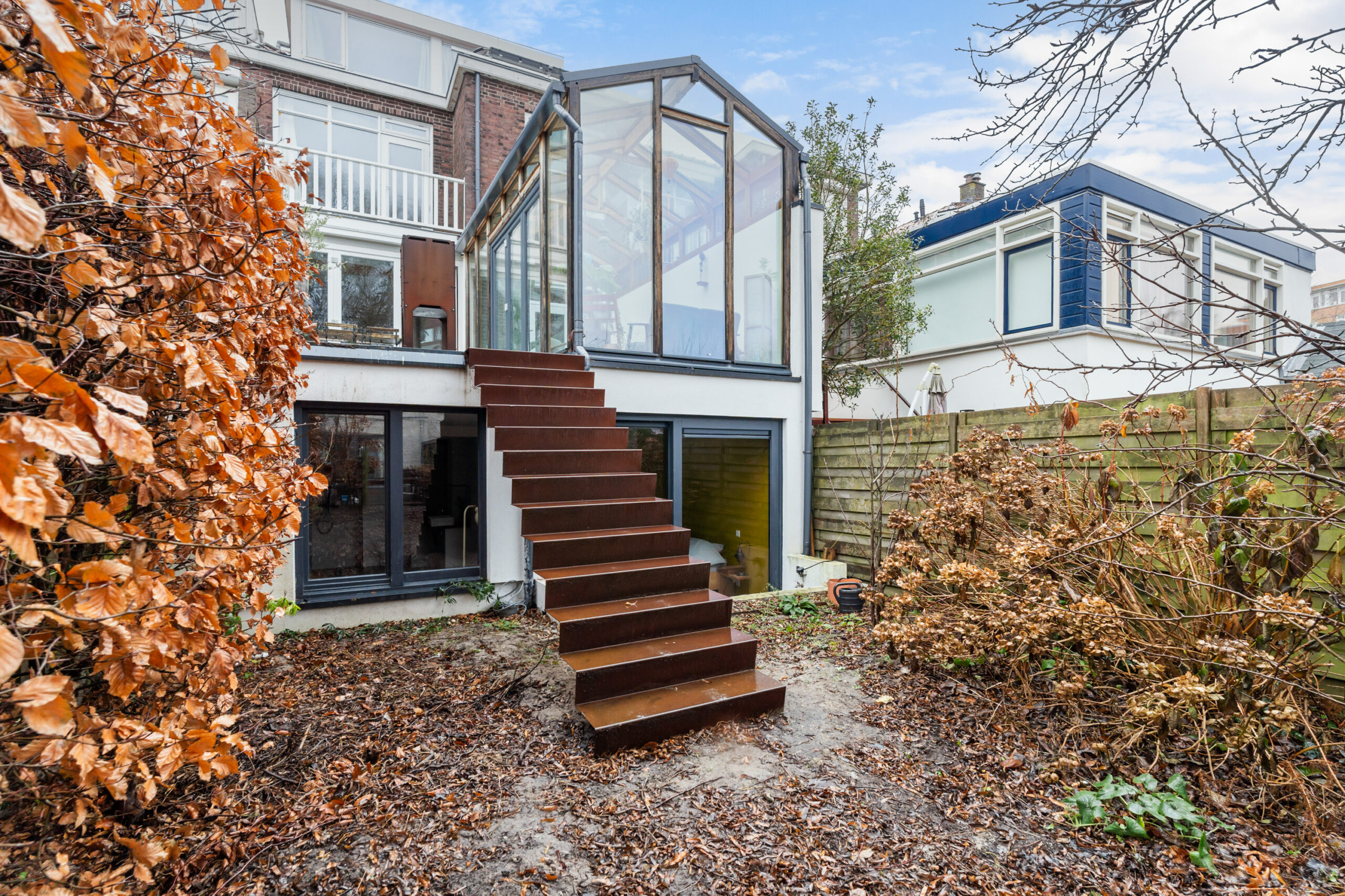 – Vanuit het achterterras een cortenstalen trap naar de diepe achtertuin aan het water
