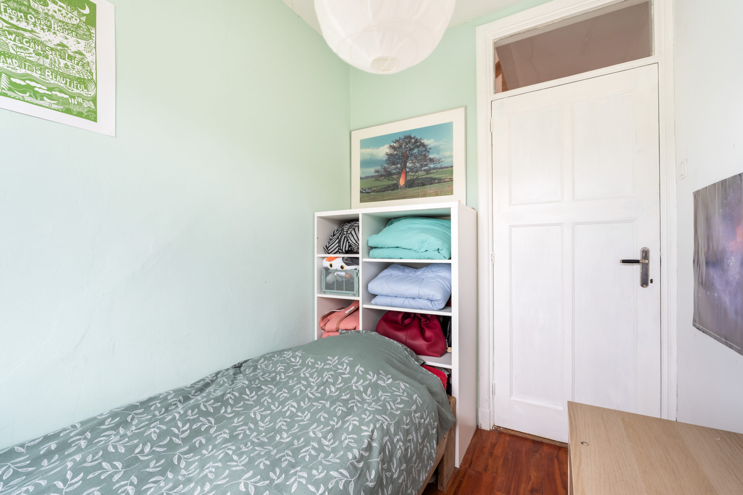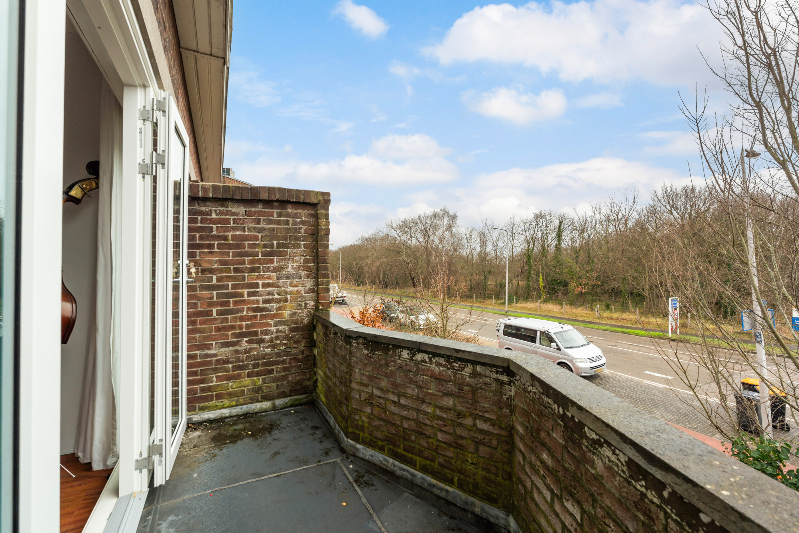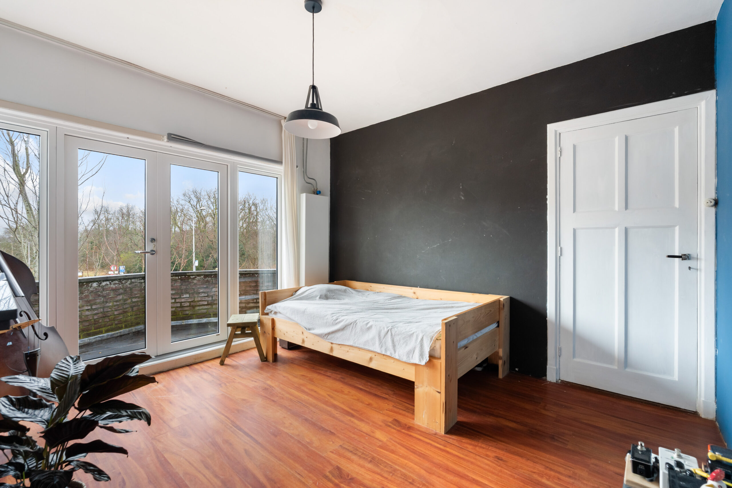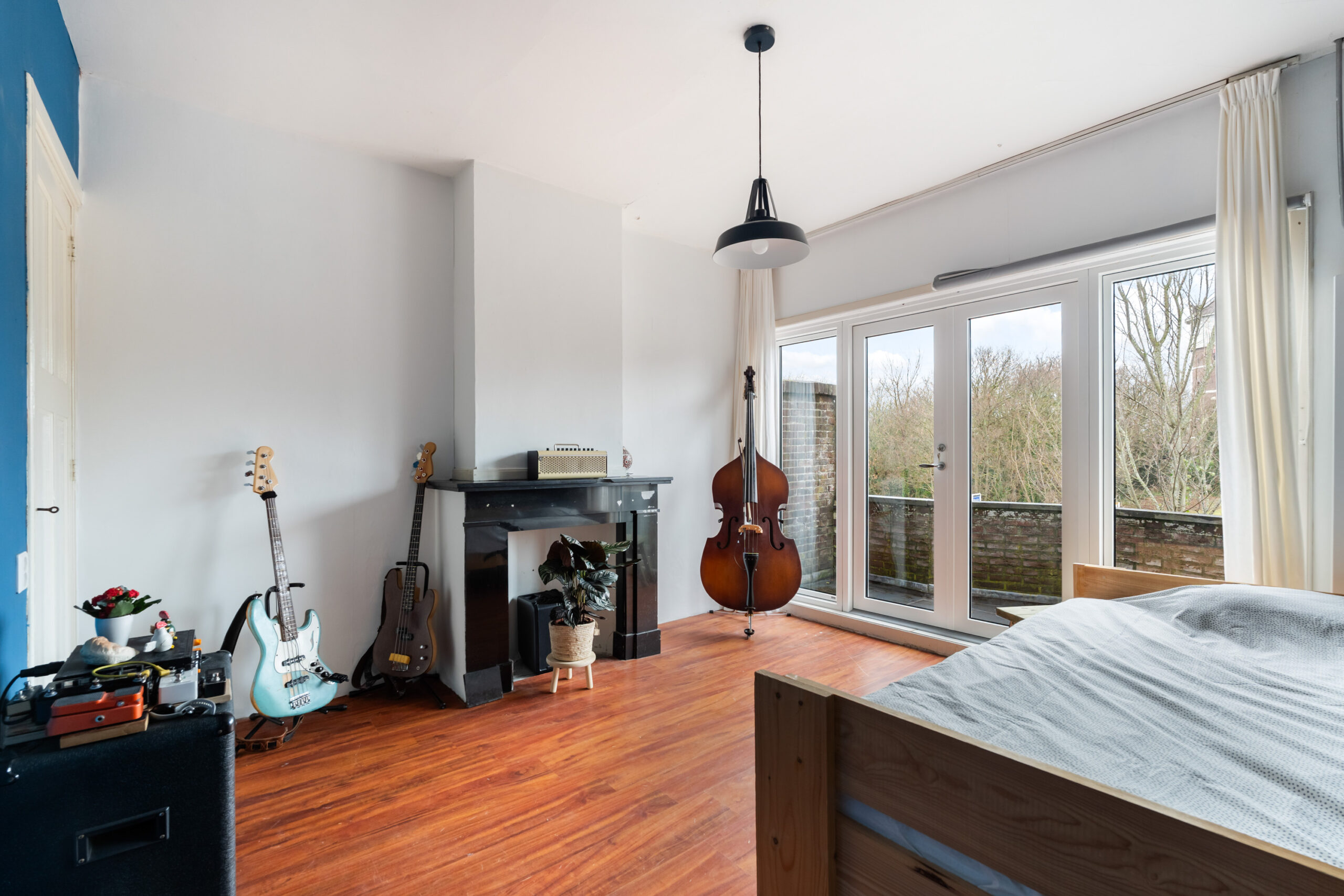 – Ruime slaapkamer aan de voorzijde, met originele schouw, vaste kast en openslaande deuren naar het balkon