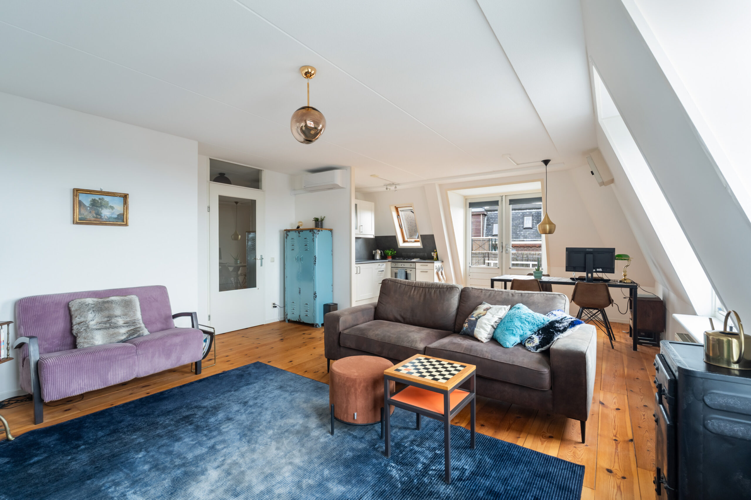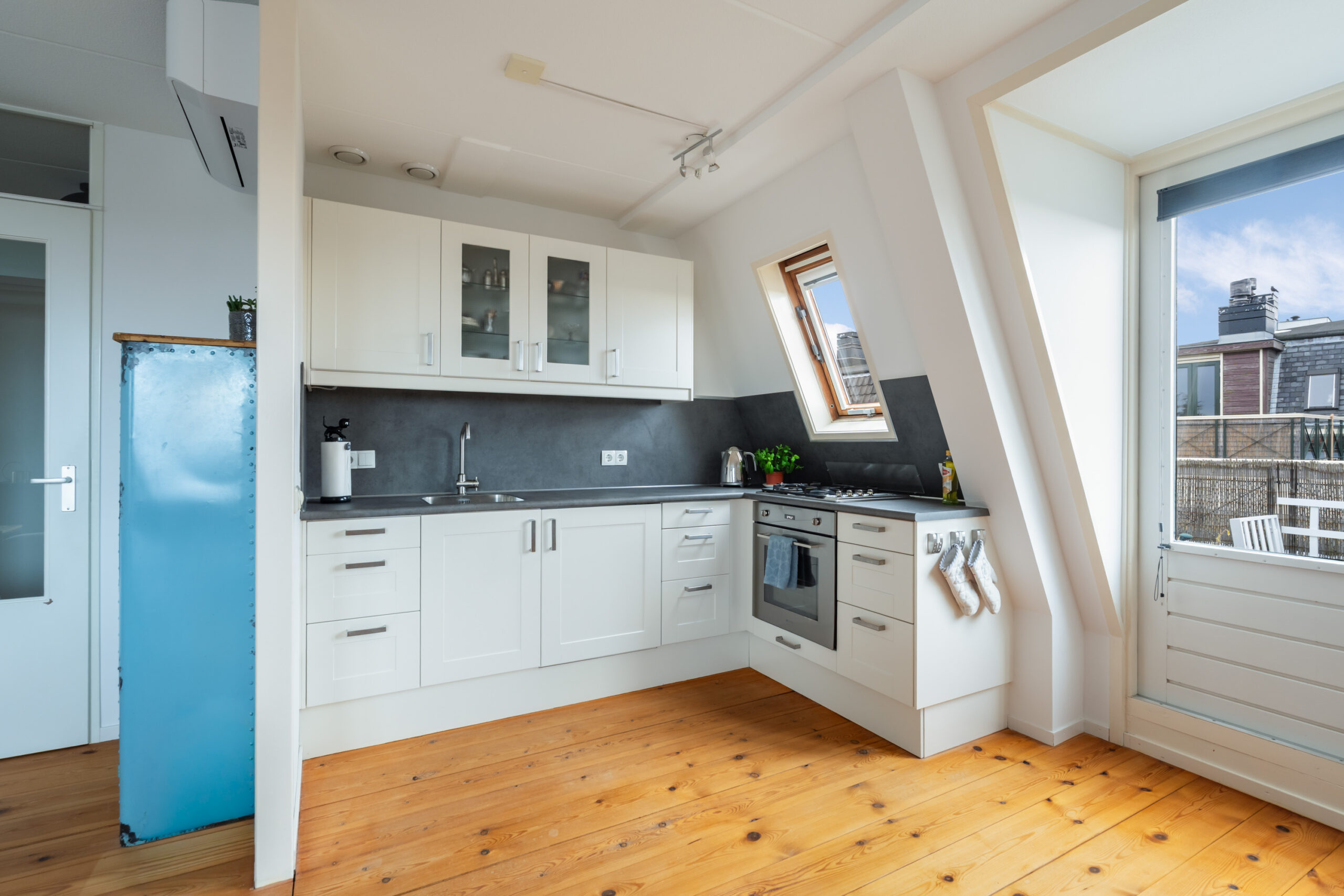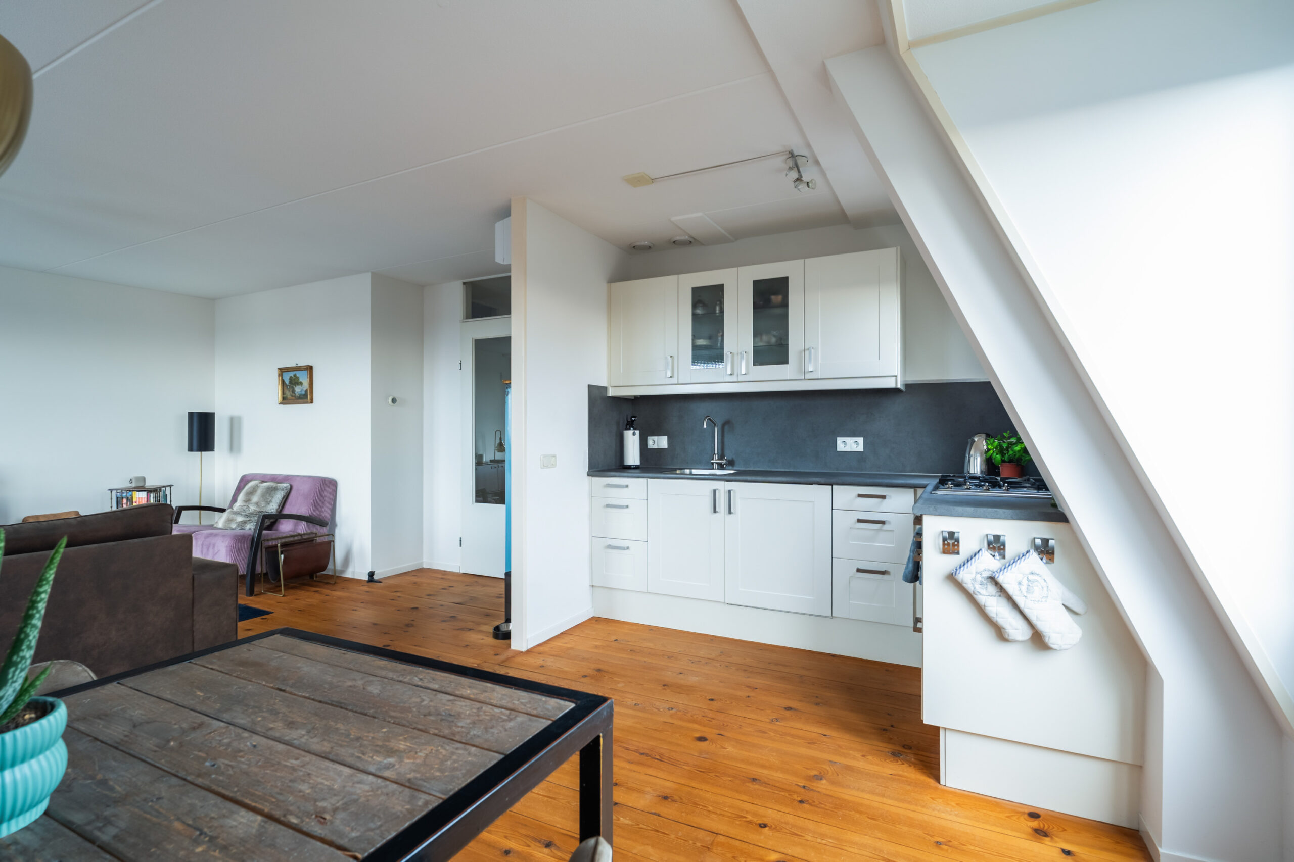 -De ruime woonkamer van ca. 35 m2 (incl. keuken) is gelegen aan de voorzijde van het complex en voorzien van een houten vloer en openslaande deuren naar het royale dakterras. De L-vormige open keuken (2012), uitgevoerd in een lichte kleurstelling, is voorzien van diverse inbouwapparatuur, waaronder een gaskookplaat, oven en koelkast.
