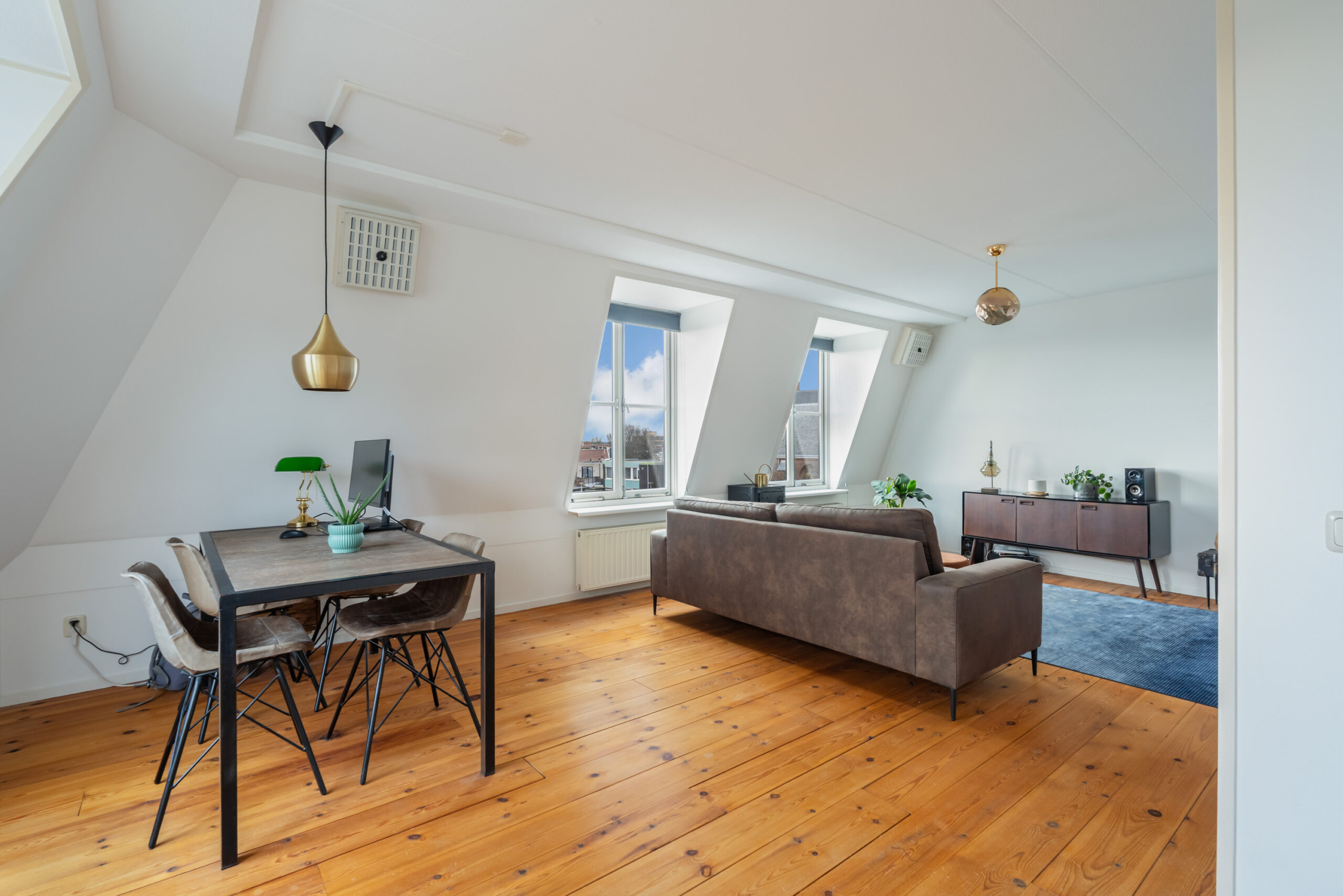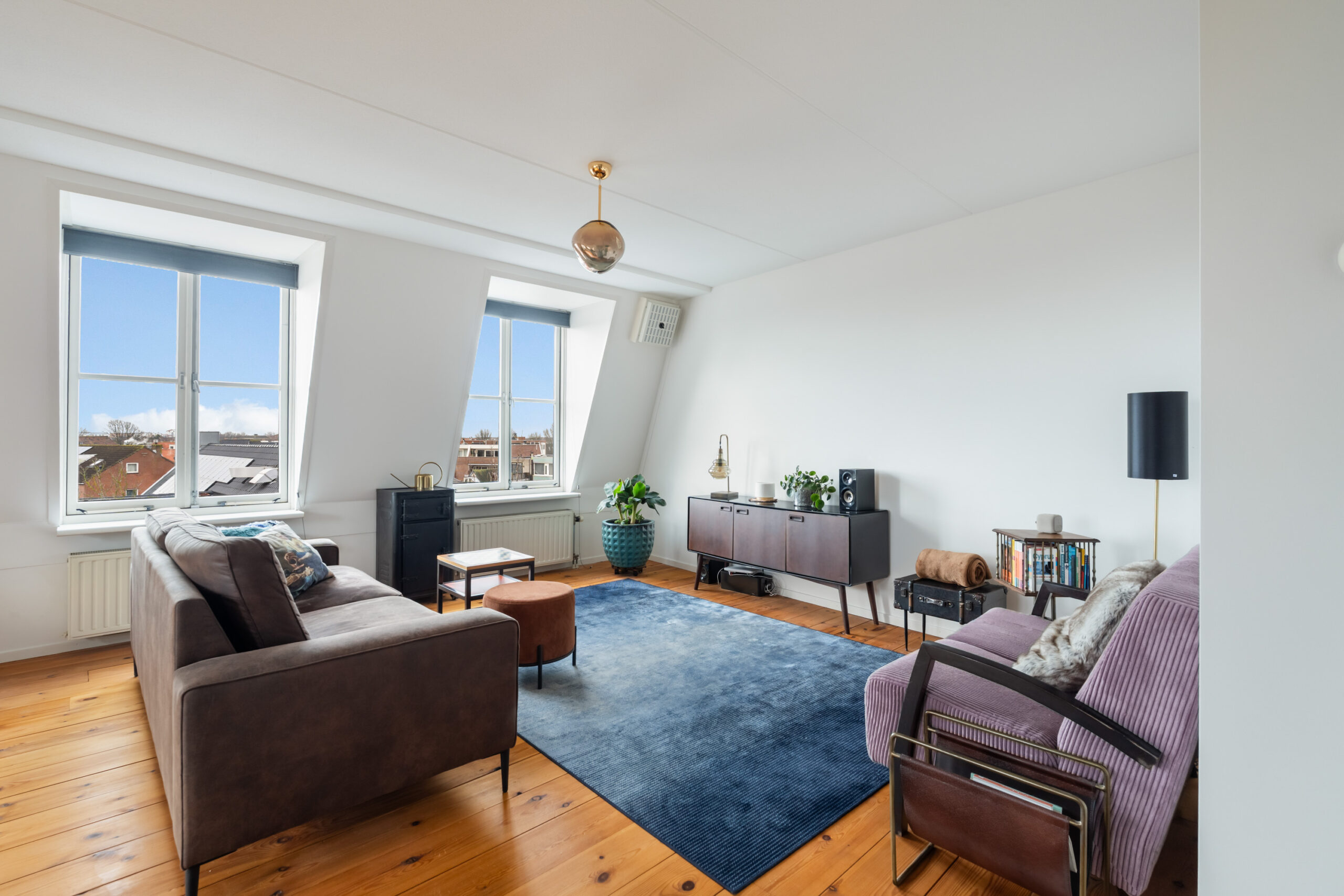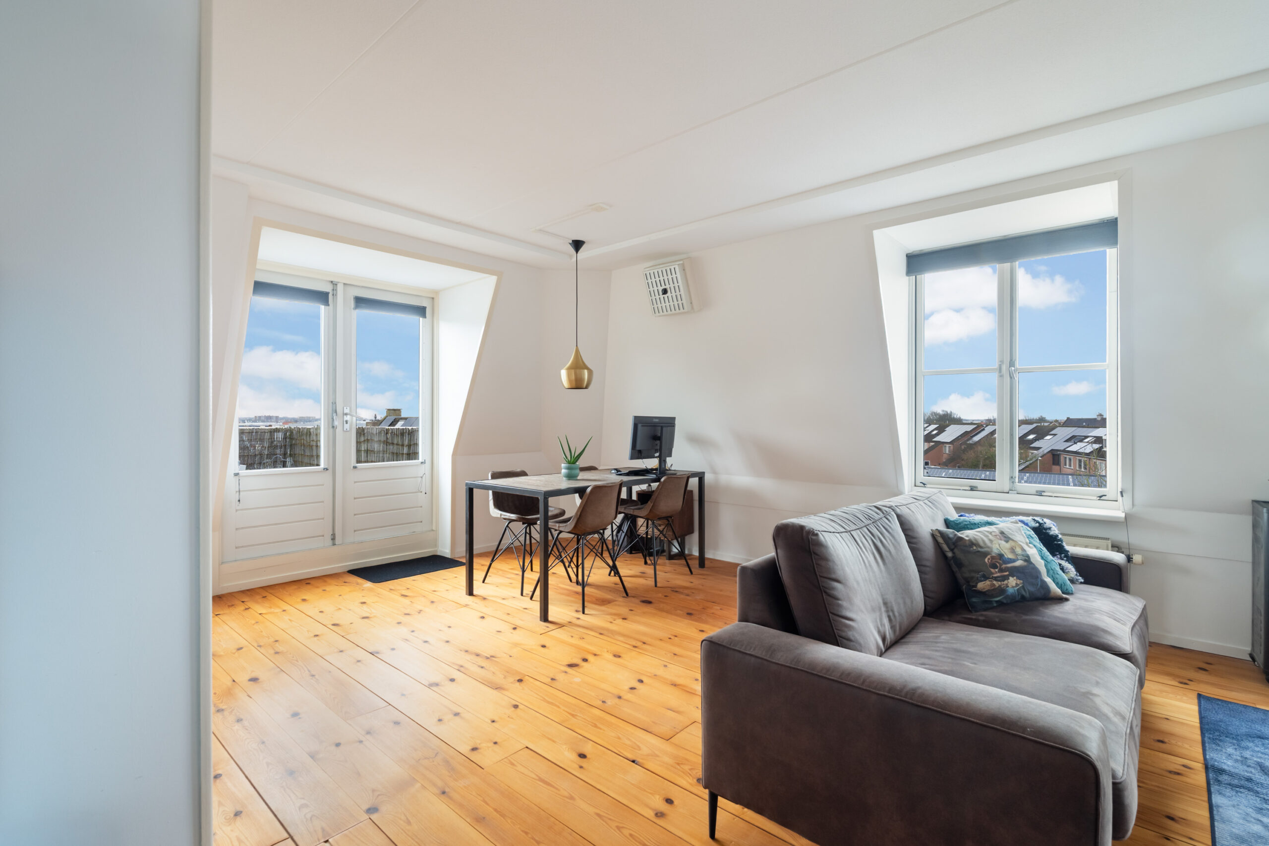 -De ruime woonkamer van ca. 35 m2 (incl. keuken) is gelegen aan de voorzijde van het complex en voorzien van een houten vloer en openslaande deuren naar het royale dakterras. De L-vormige open keuken (2012), uitgevoerd in een lichte kleurstelling, is voorzien van diverse inbouwapparatuur, waaronder een gaskookplaat, oven en koelkast.
