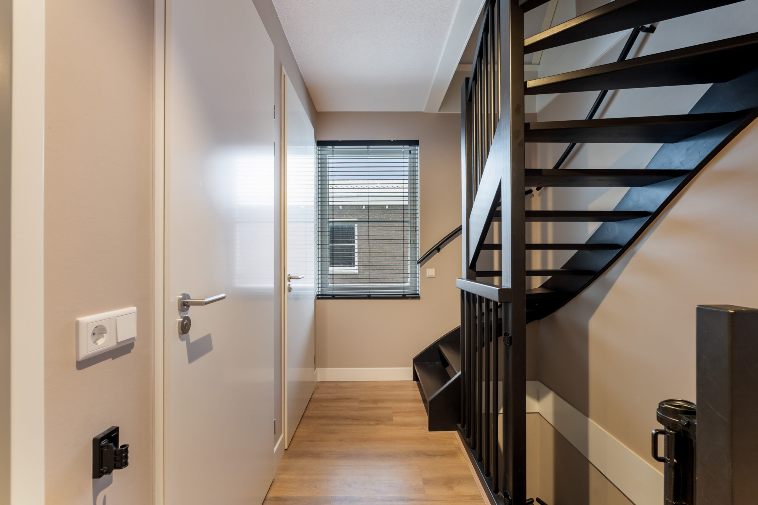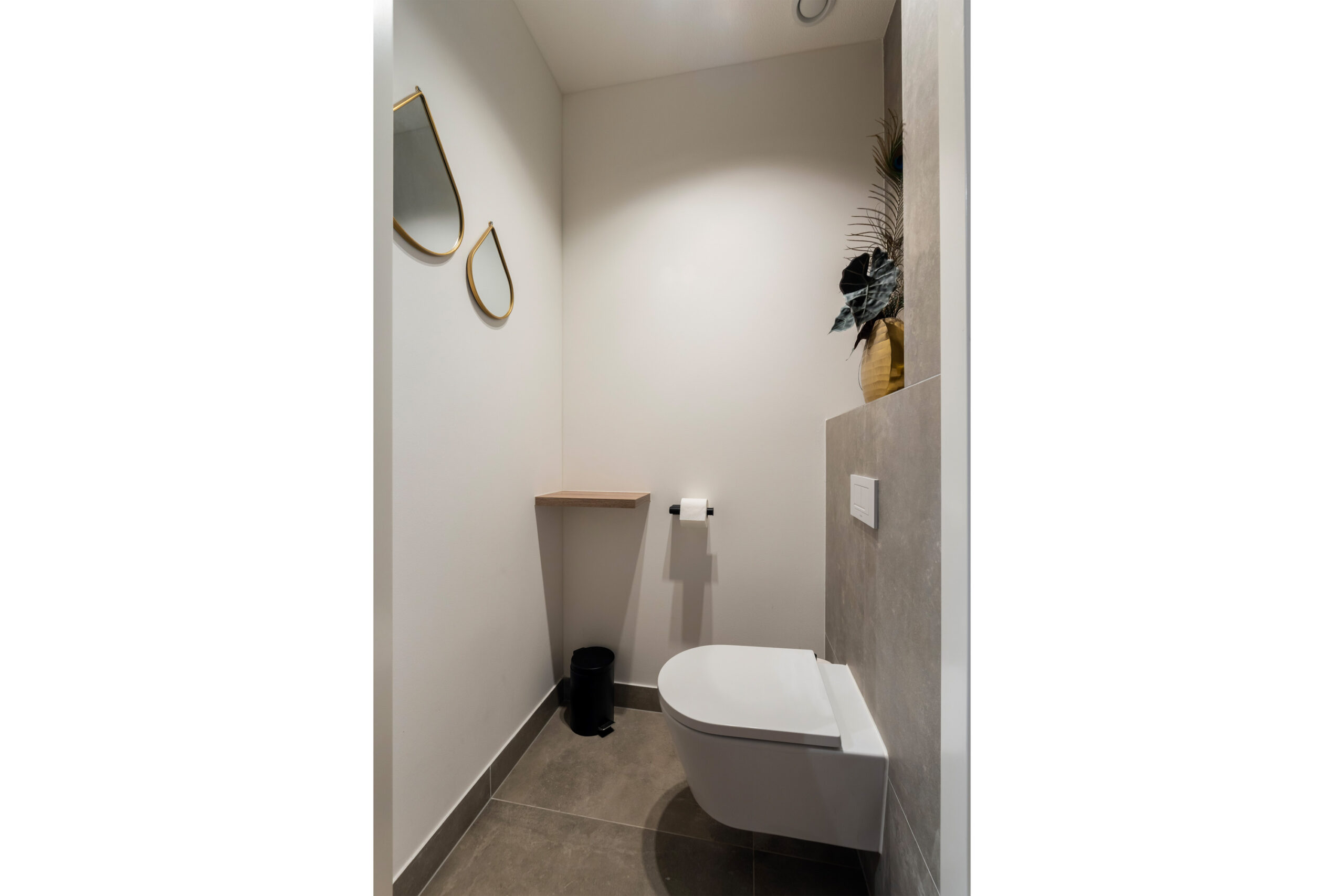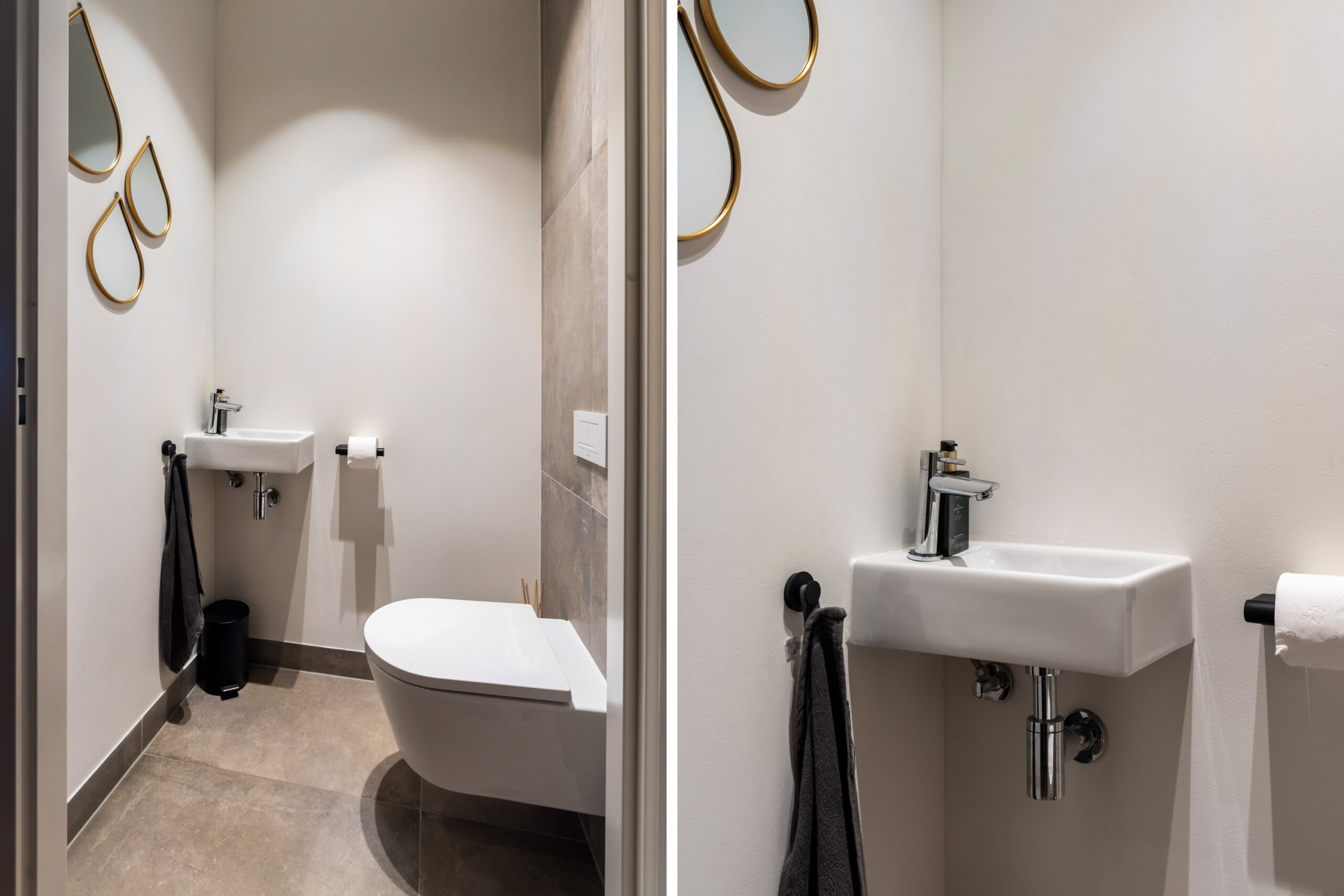 - Overloop met moderne toiletruimte, zijraam en trapopgang naar de 2e verdieping.