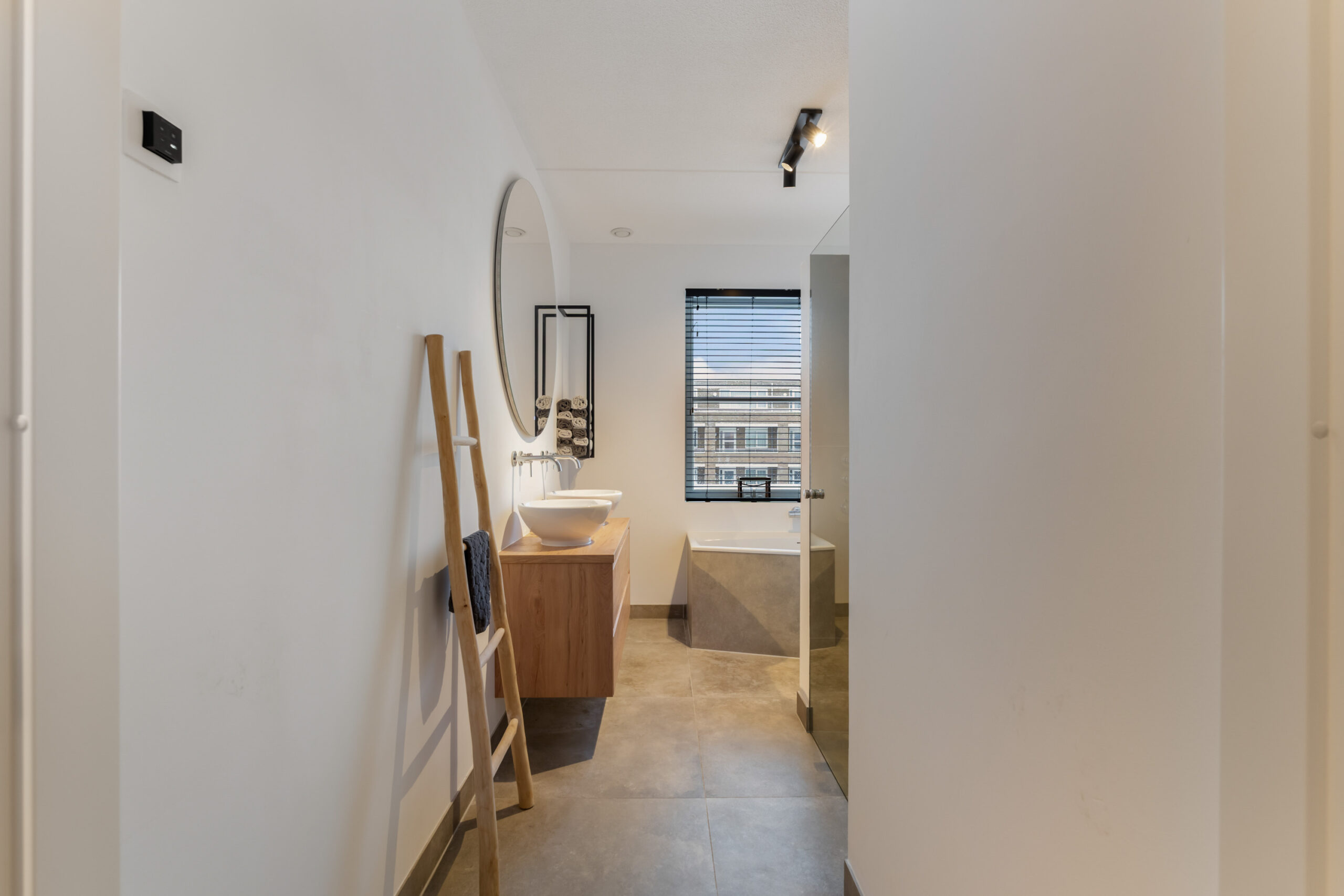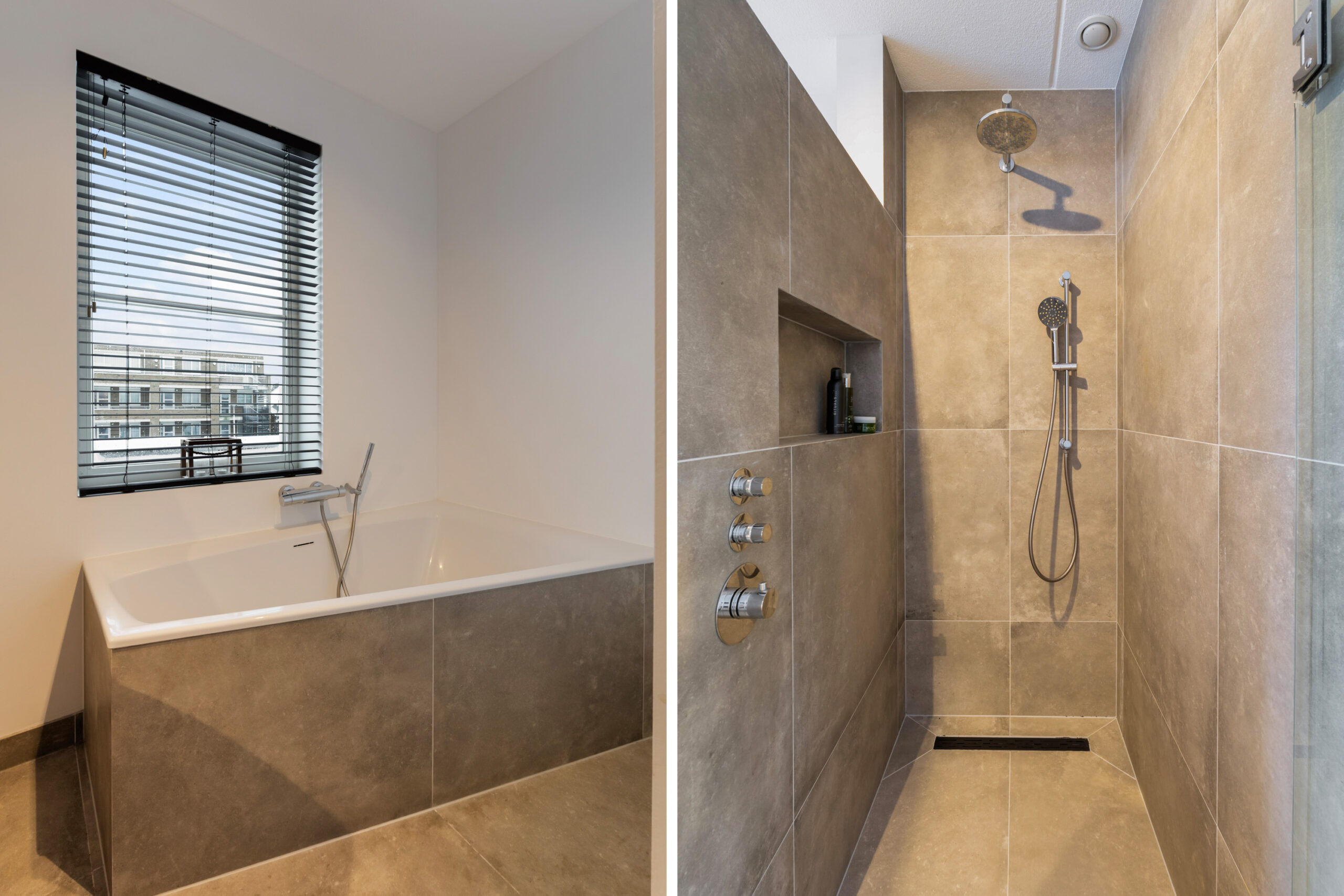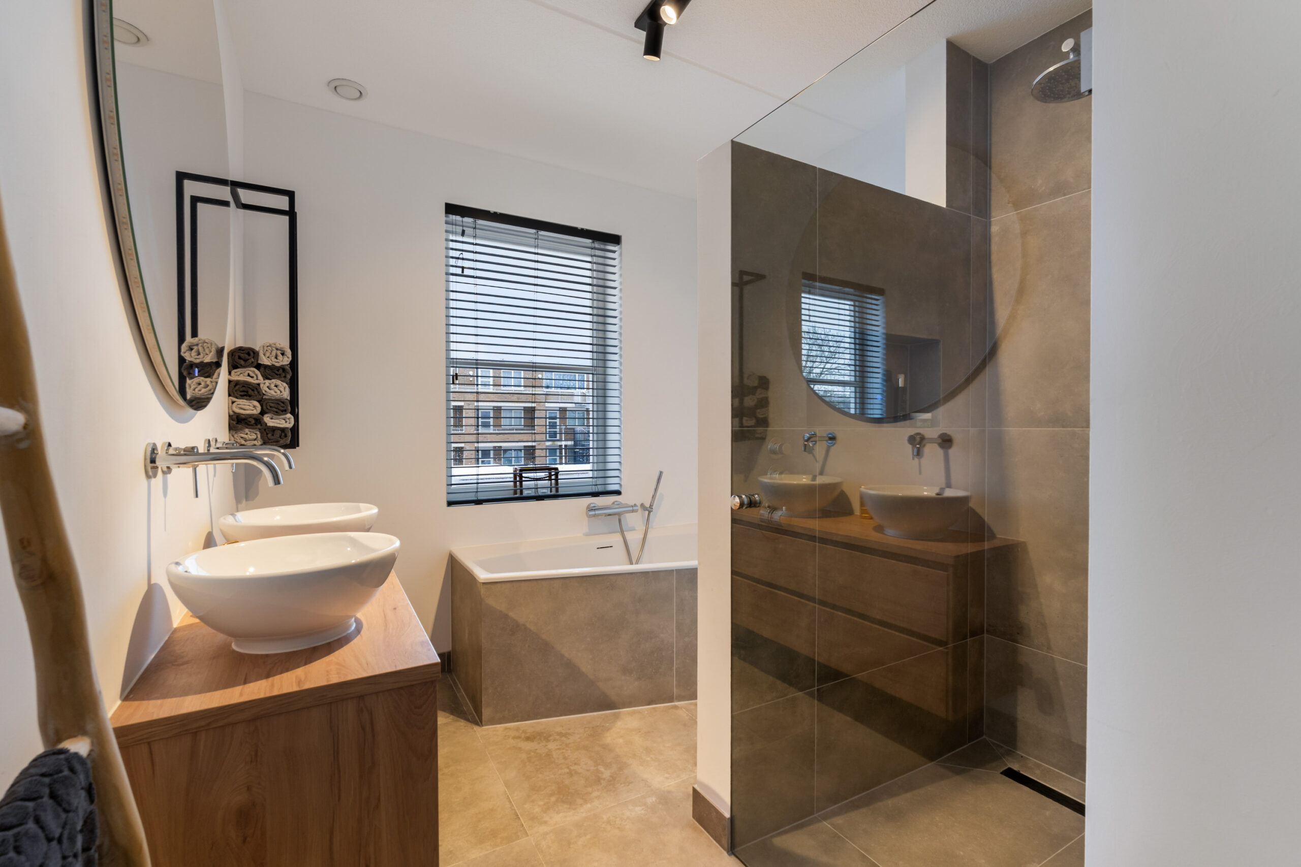 - Moderne stijlvolle badkamer met een heerlijk ligbad, ruime inloopdouche, wastafelmeubel met verwarmde spiegel en dankzij het grote raam is er voldoende daglichttoetreding.