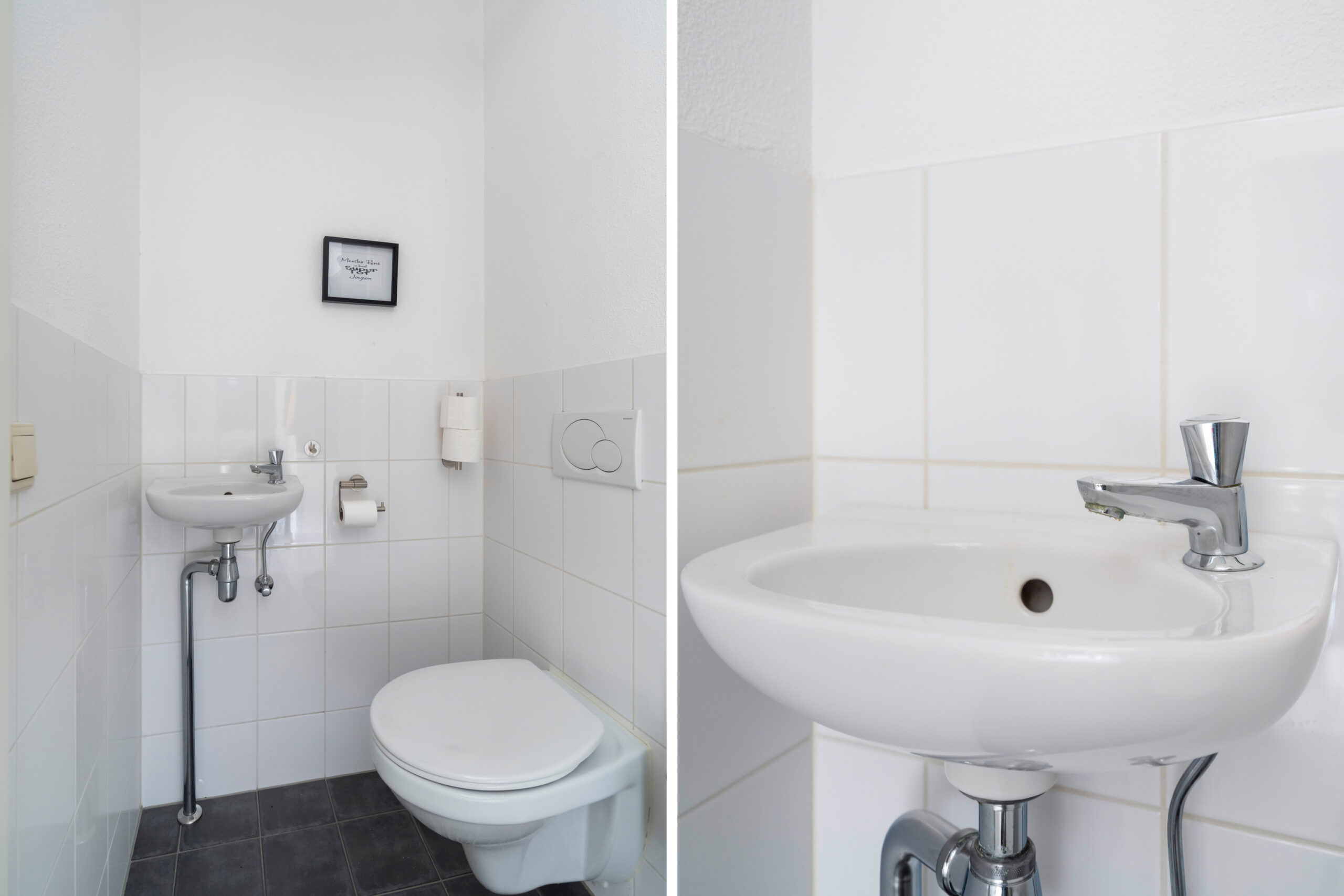 - Entree woning, hal met meterkast, licht betegeld toilet met wandcloset en fontein;