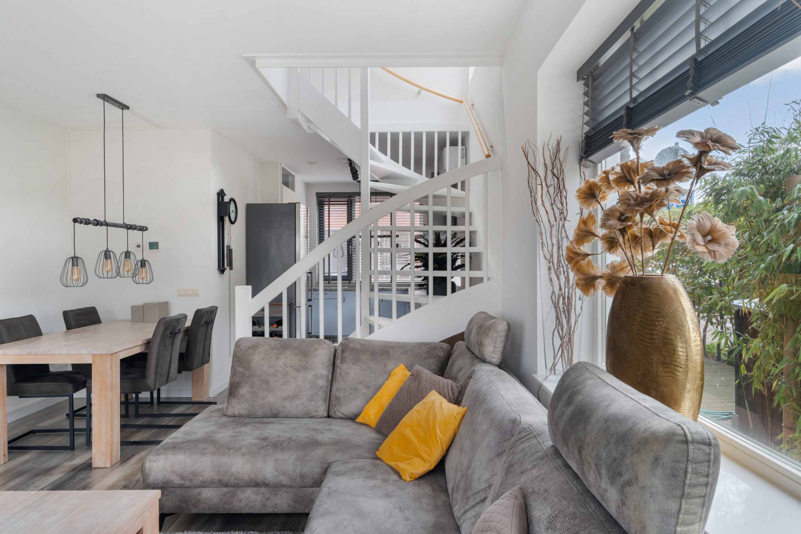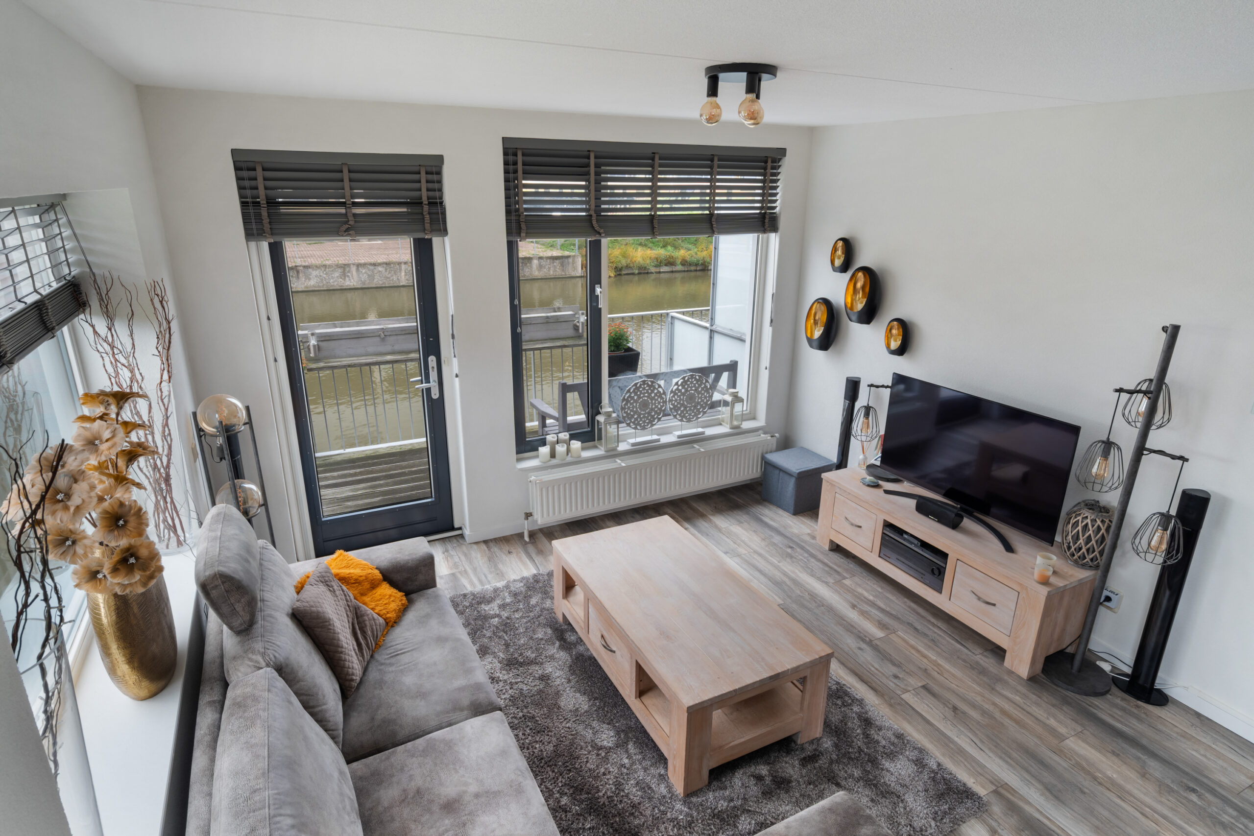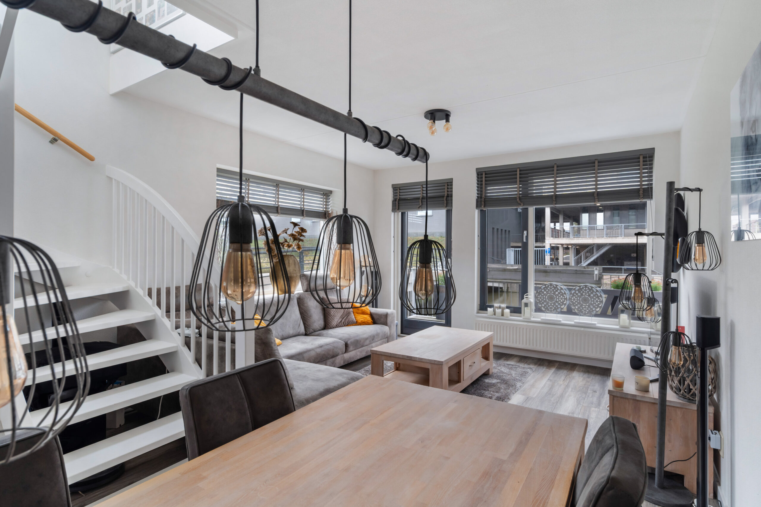 - Woonkamer (5,58 x 3,95 m) met veel lichtinval en toegang tot het terras boven het water;