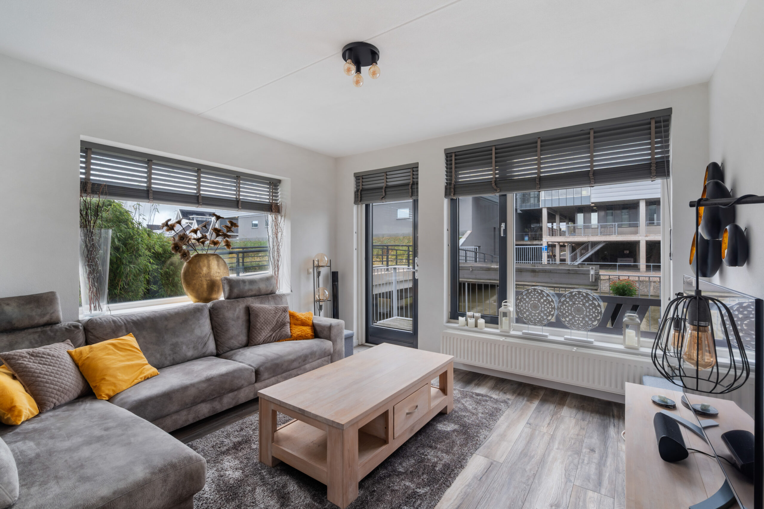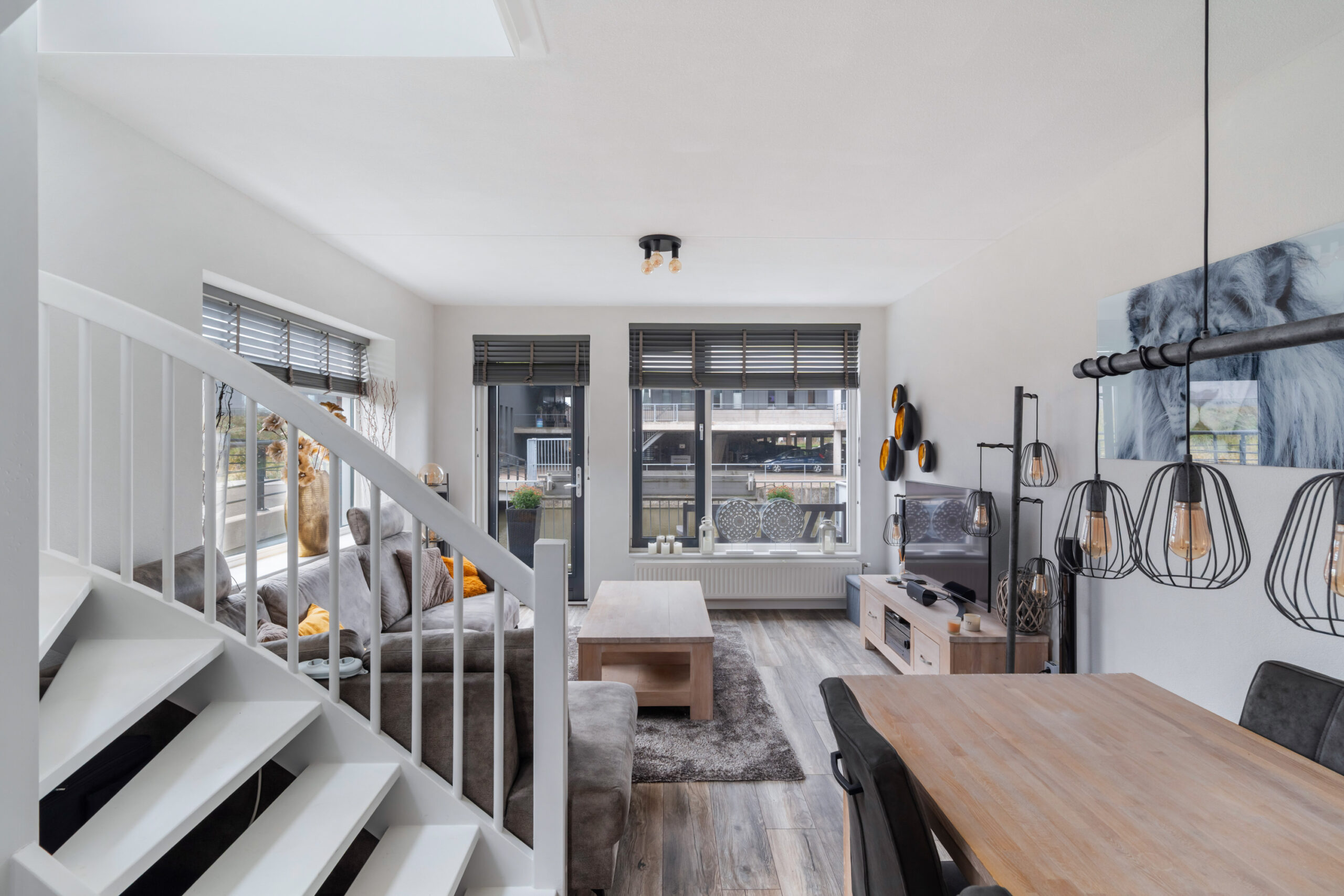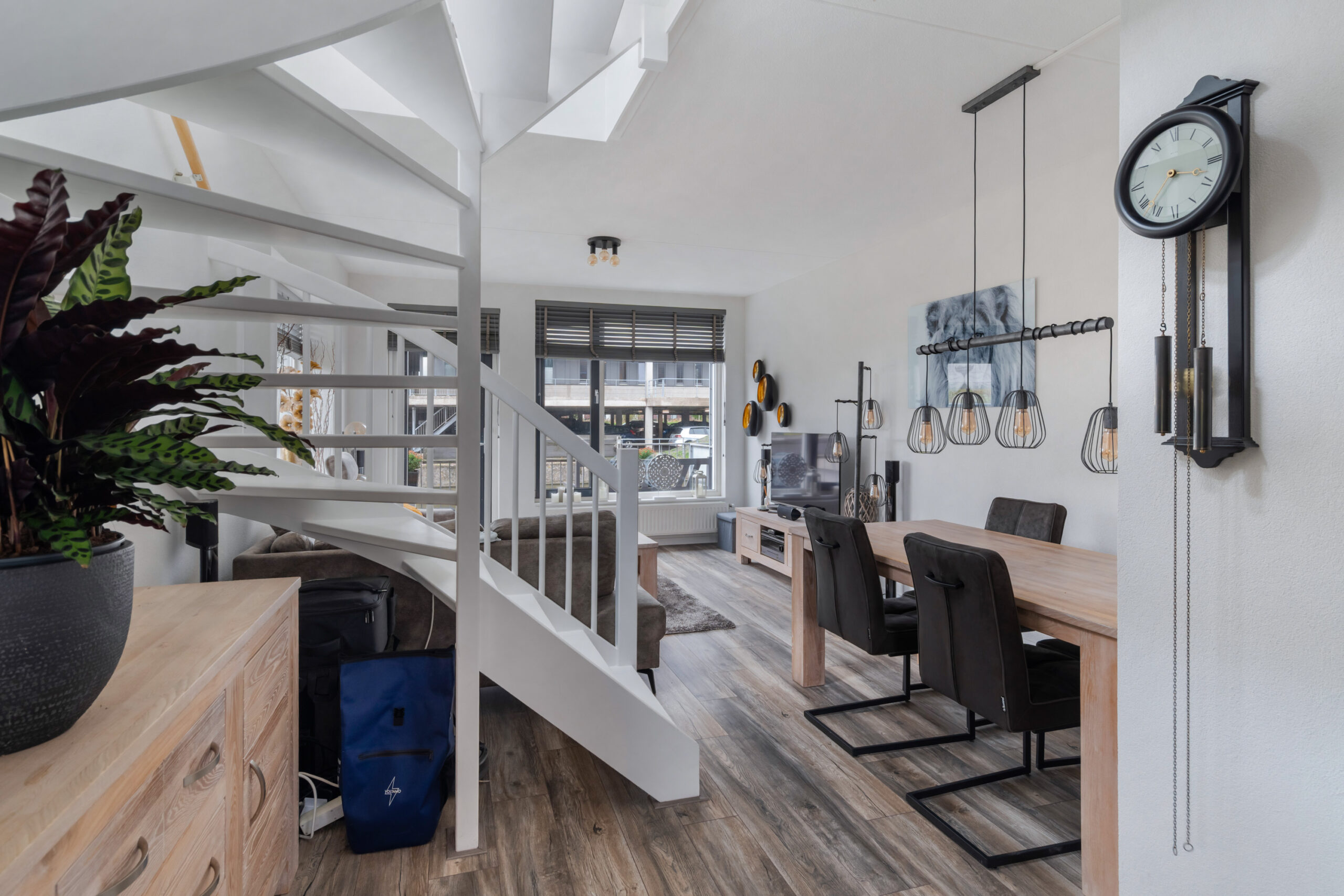 - Woonkamer (5,58 x 3,95 m) met veel lichtinval en toegang tot het terras boven het water;