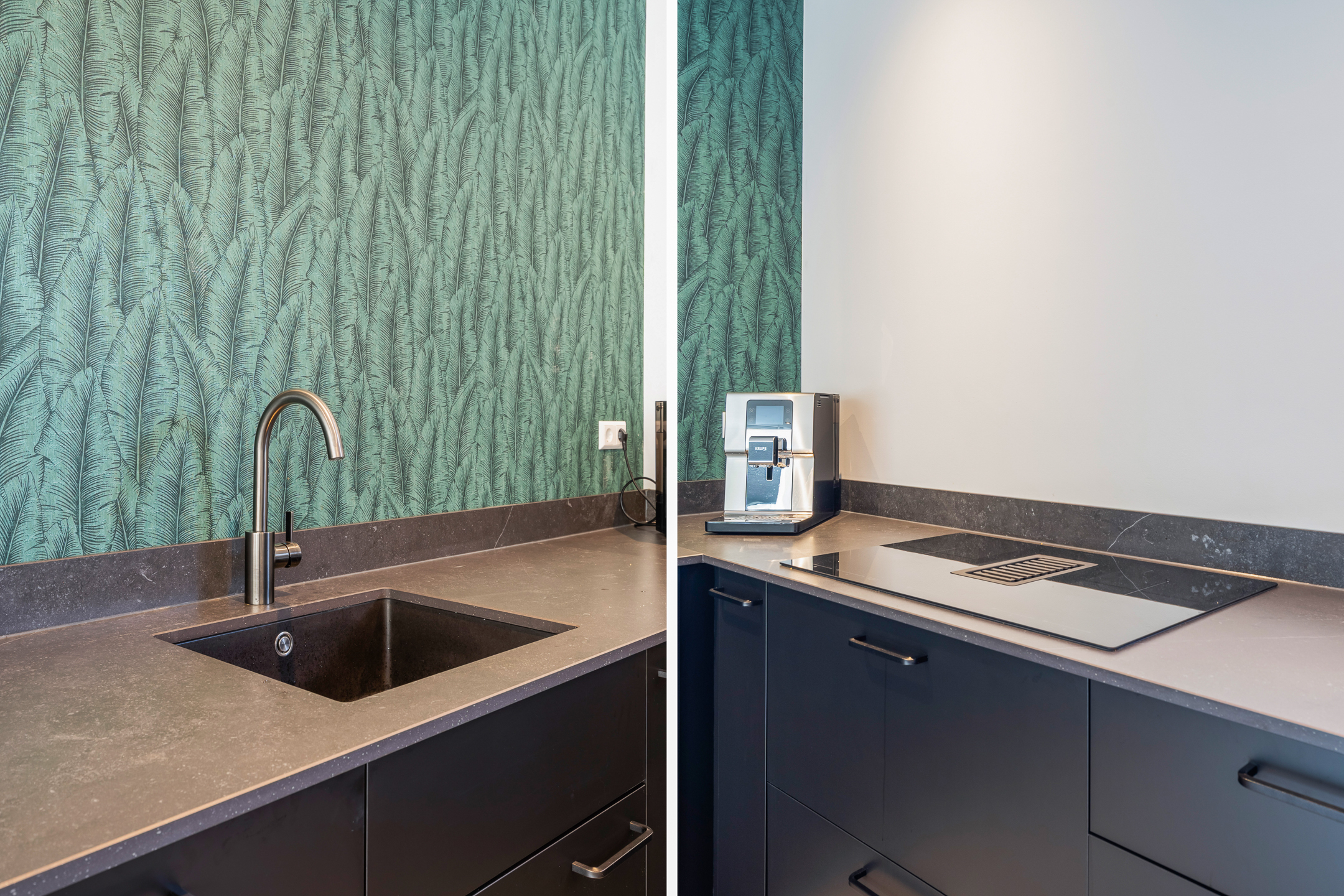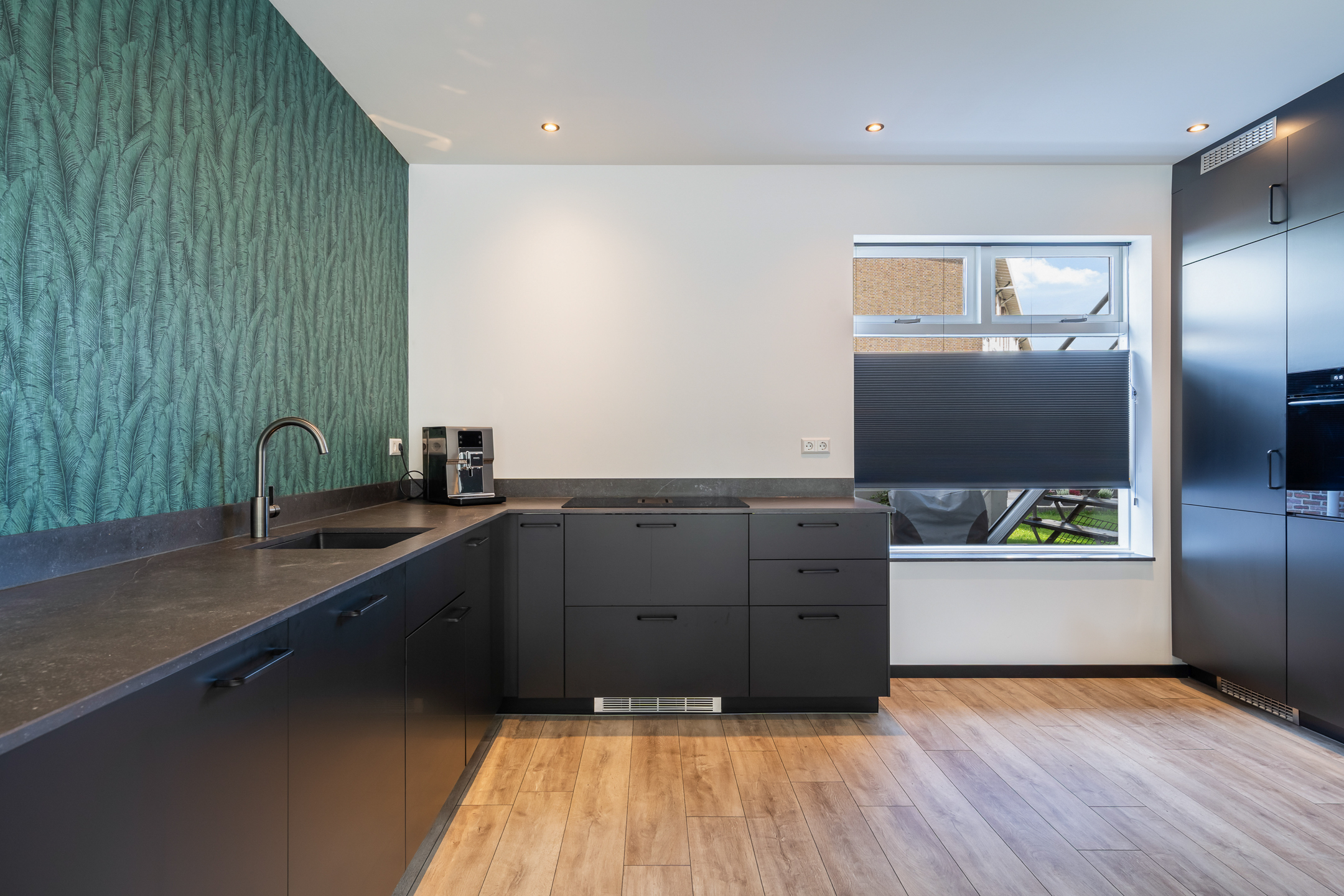 -Ruime woonkamer met open keuken (2024), zwarte opstelling met inbouwapparatuur (vaatwasser, koelkast (1.80m), vriezer (1.80m), combi stoomoven, kookplaat met ingebouwde afzuiging) stenen aanrechtblad, zicht op het gezellige pleintje