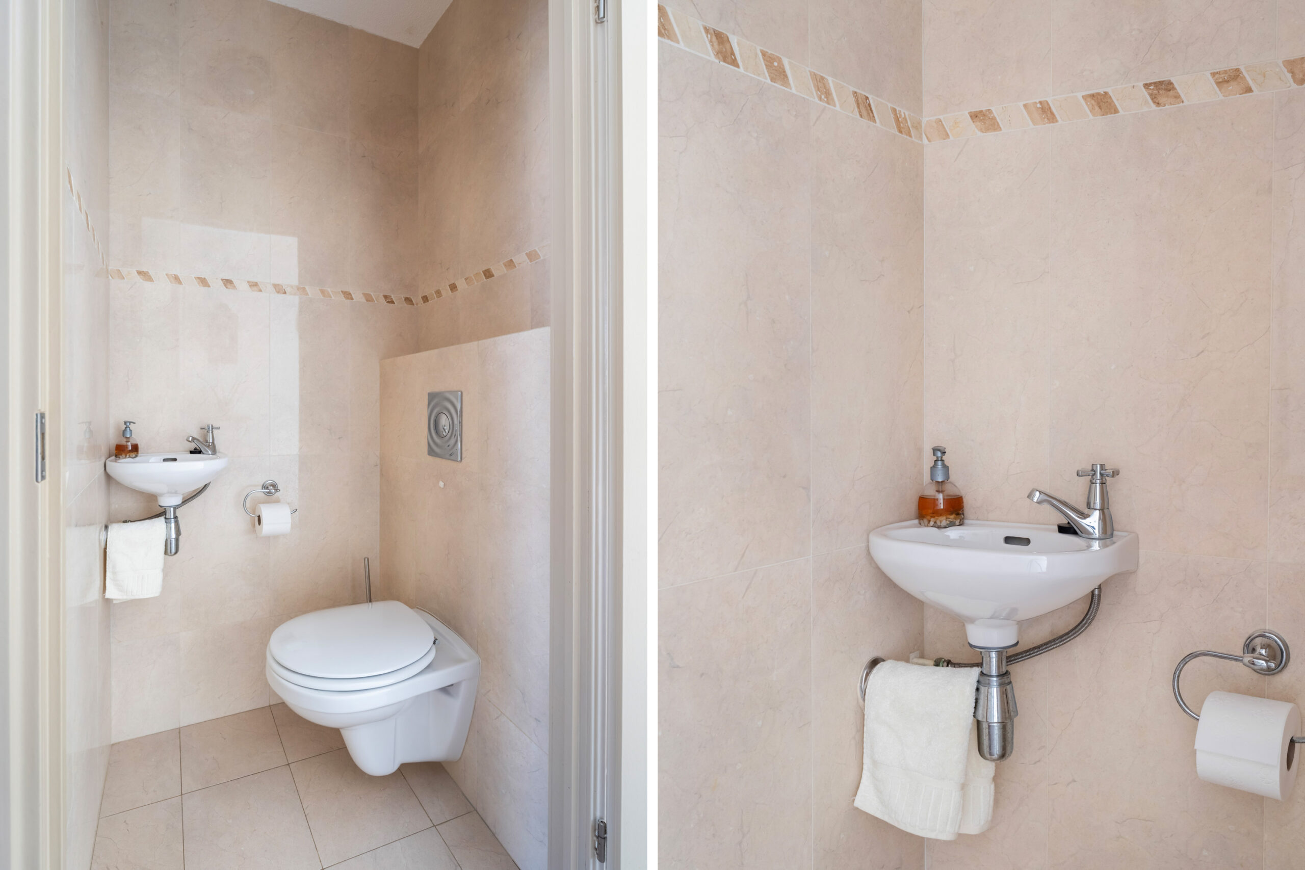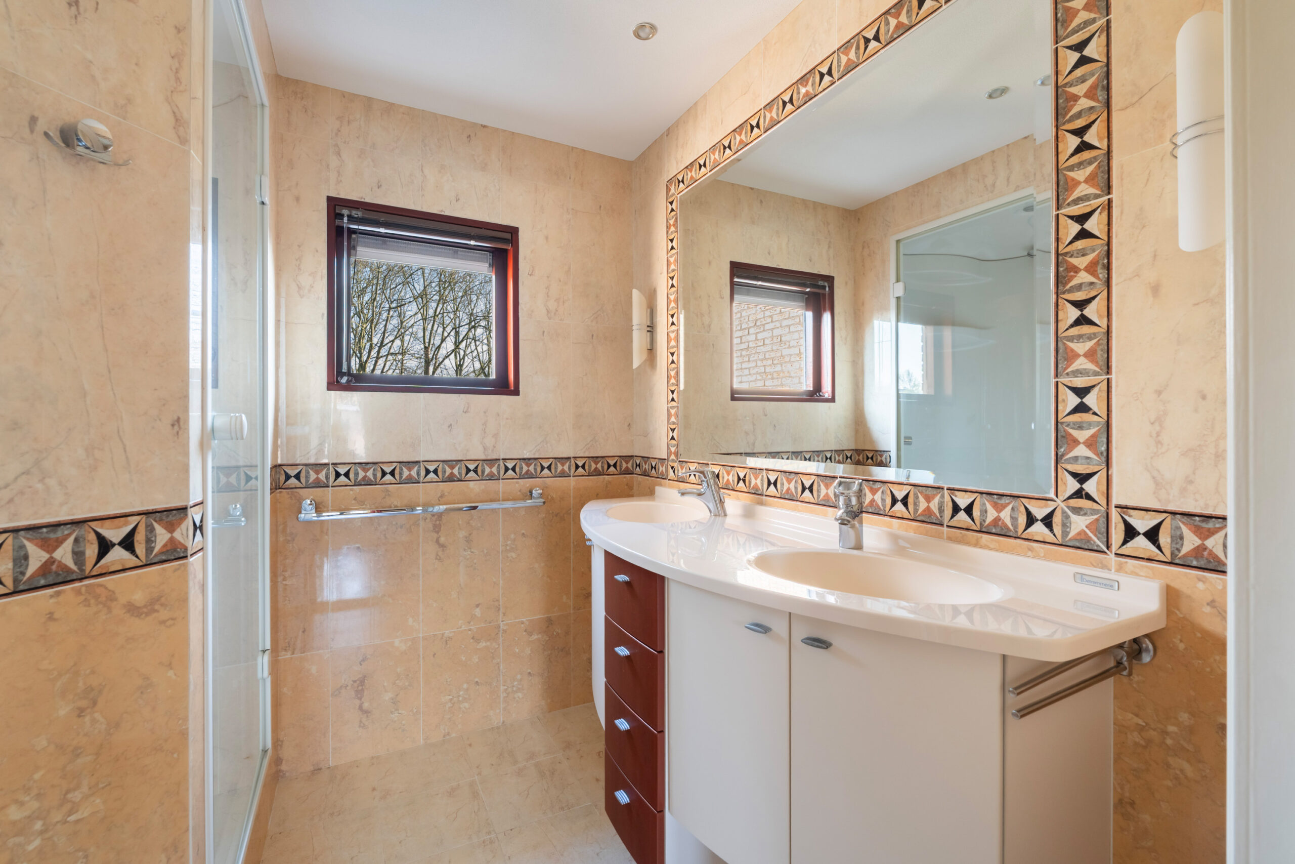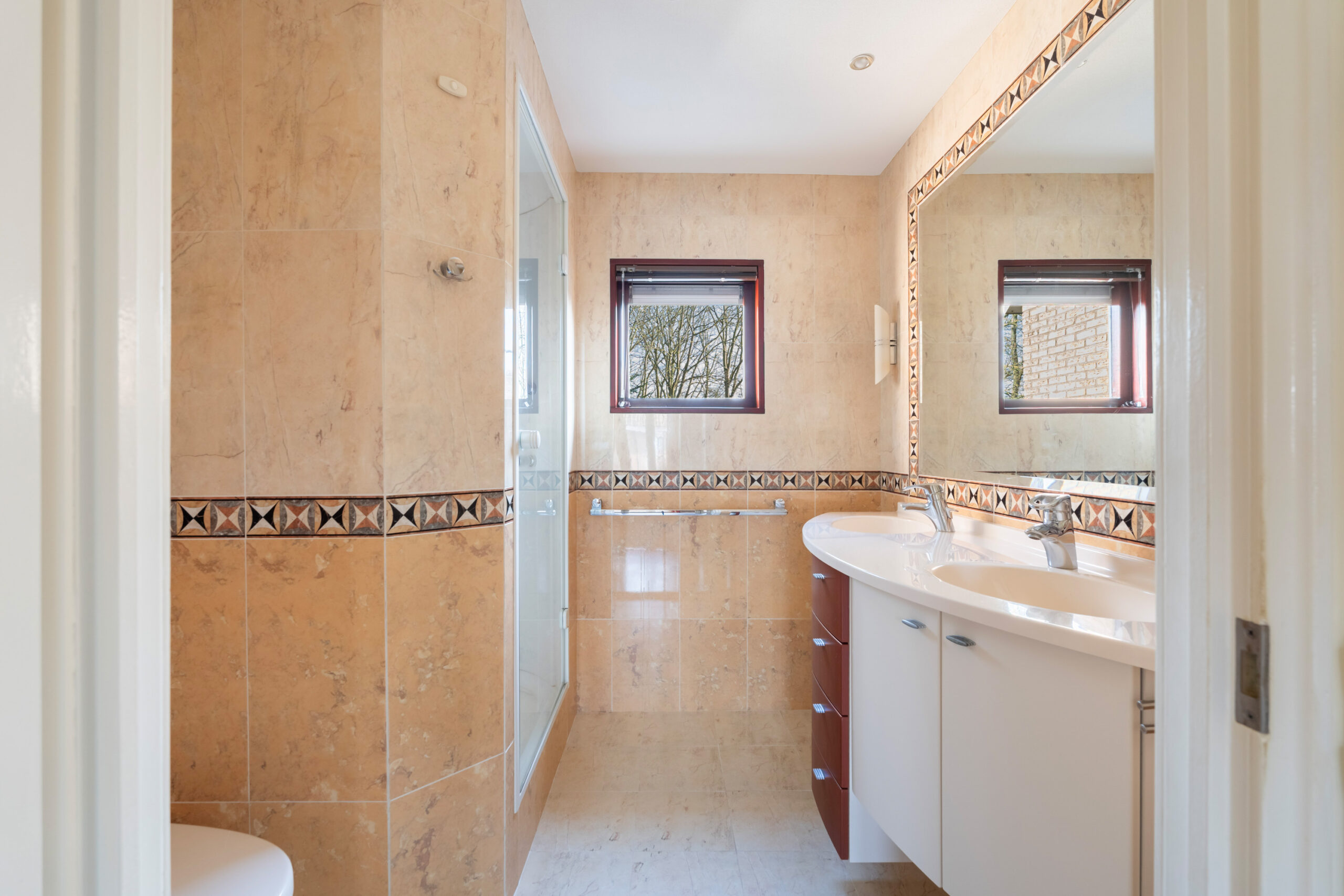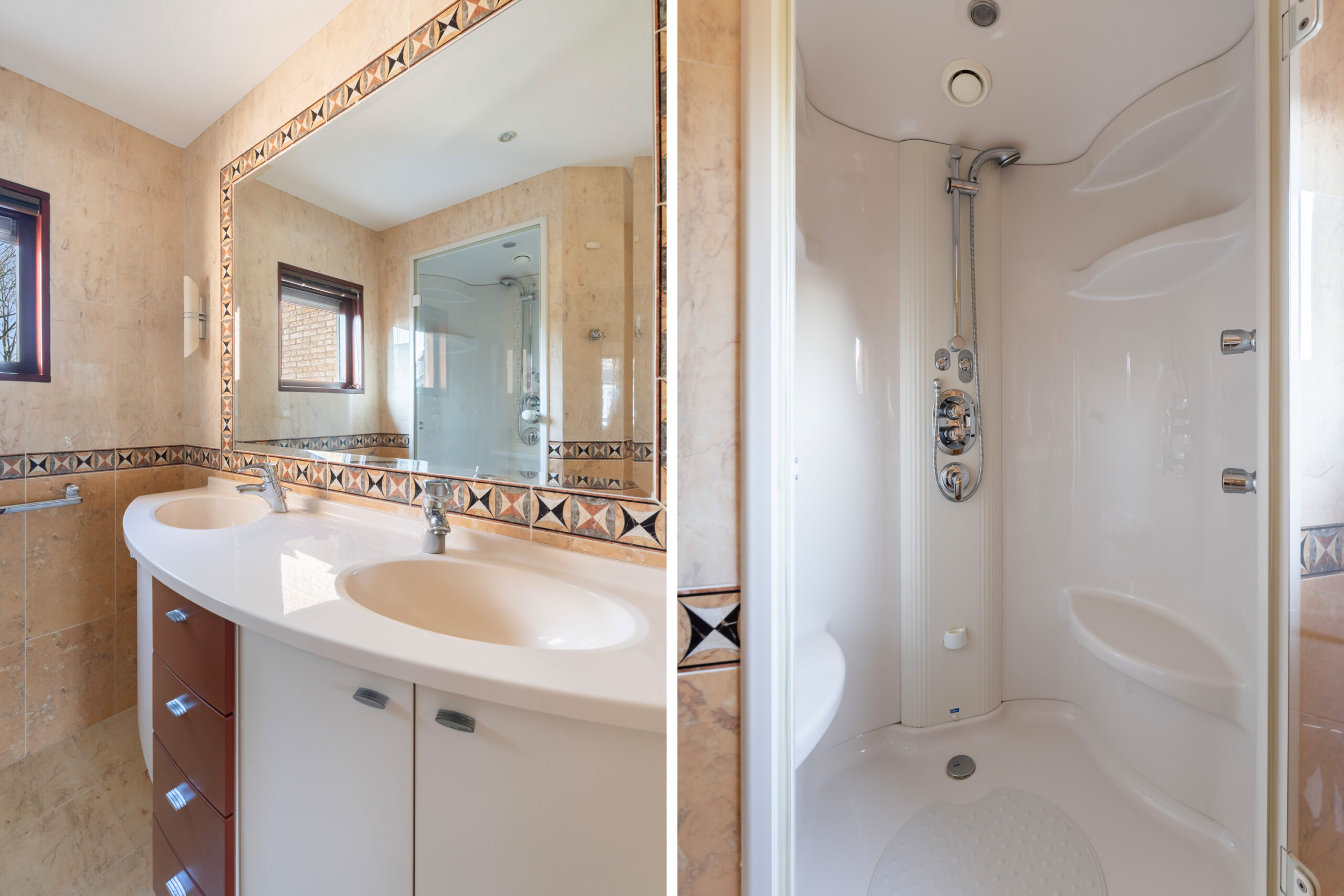 - Badkamervoorzieningen Toilet, douche, stoomcabine, dubbele wastafel, wastafelmeubel, vloerverwarming