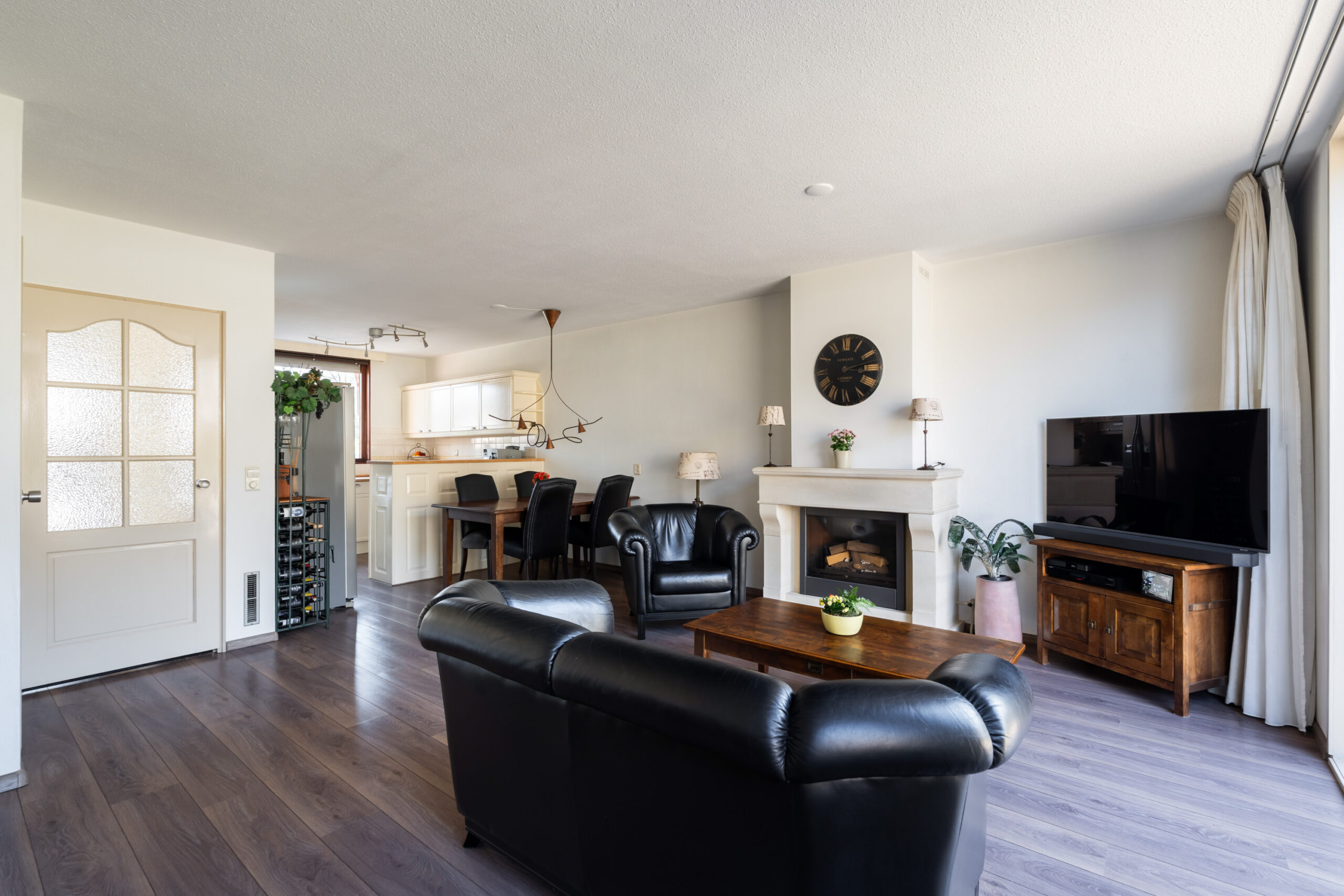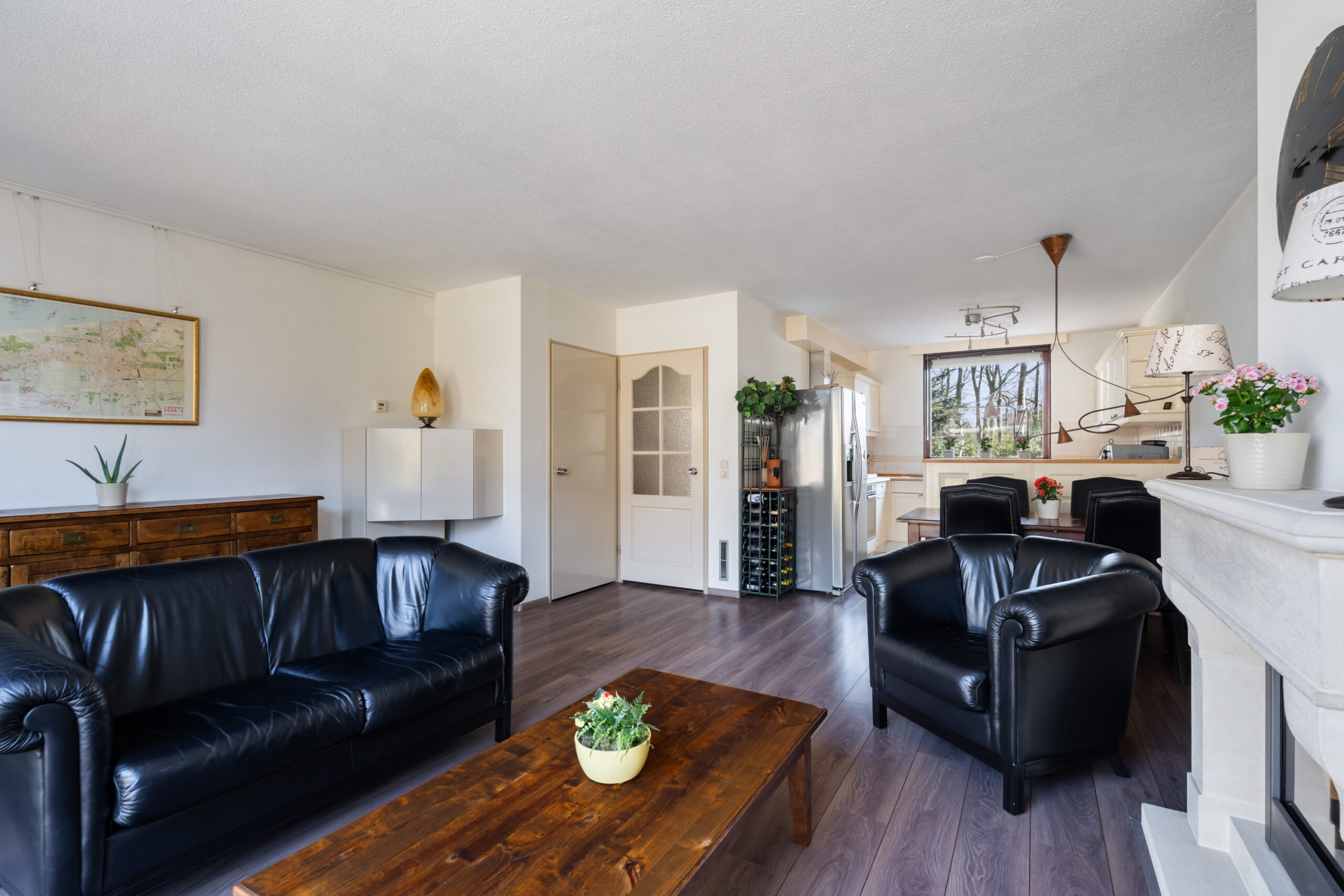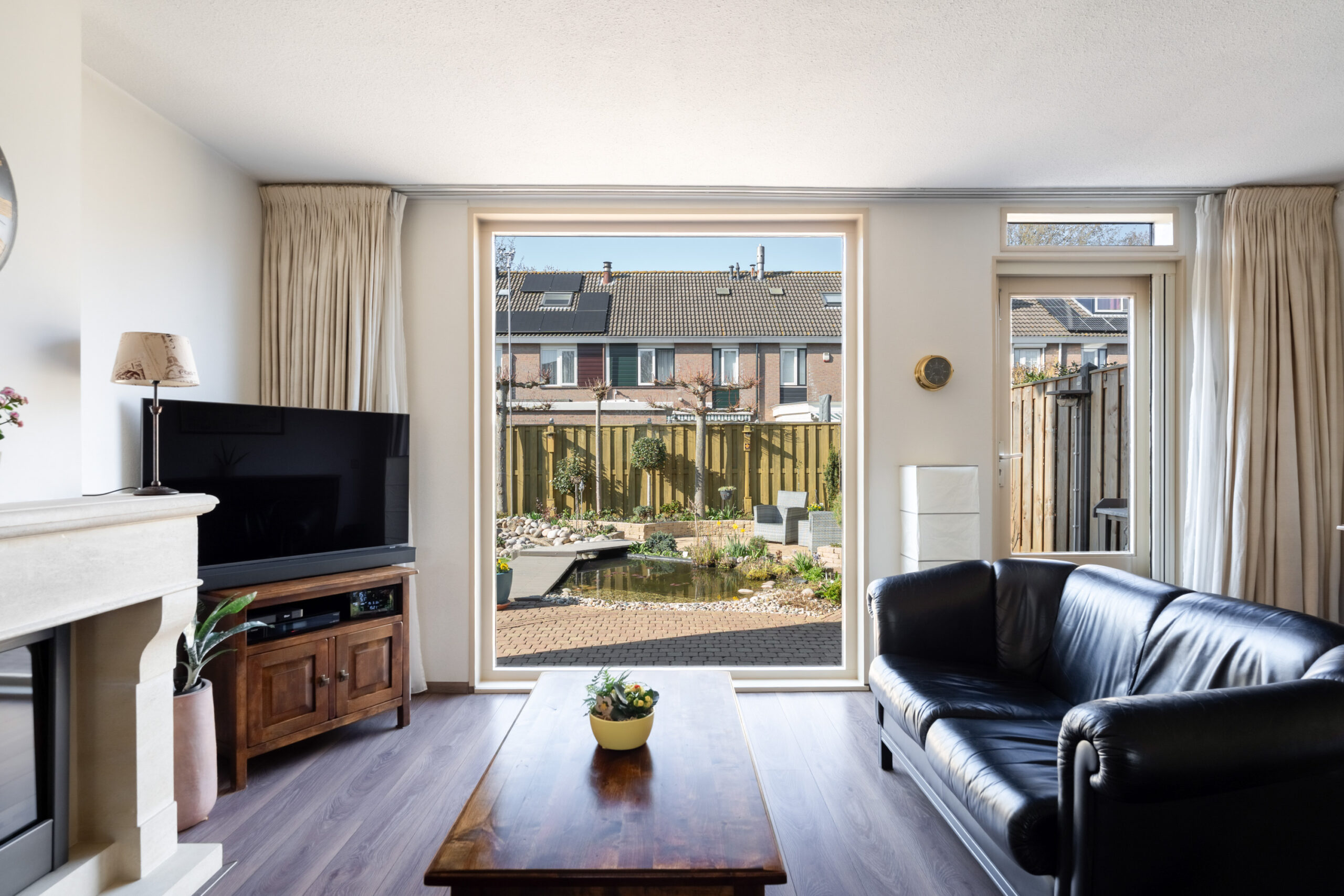 - De lichte en ruime woonkamer (ca. 4,95 m x 5,17 m) is voorzien van een gashaard, praktische trapkast en biedt direct toegang tot de achtertuin;