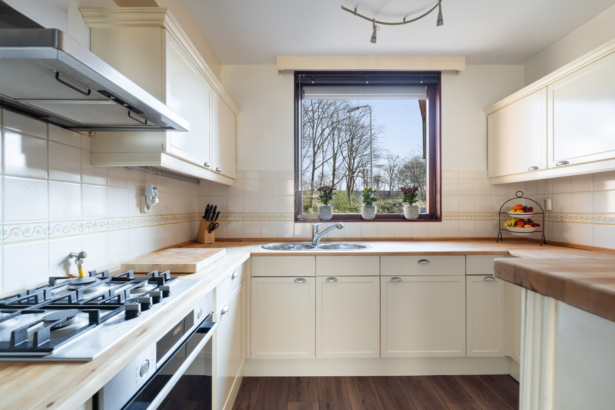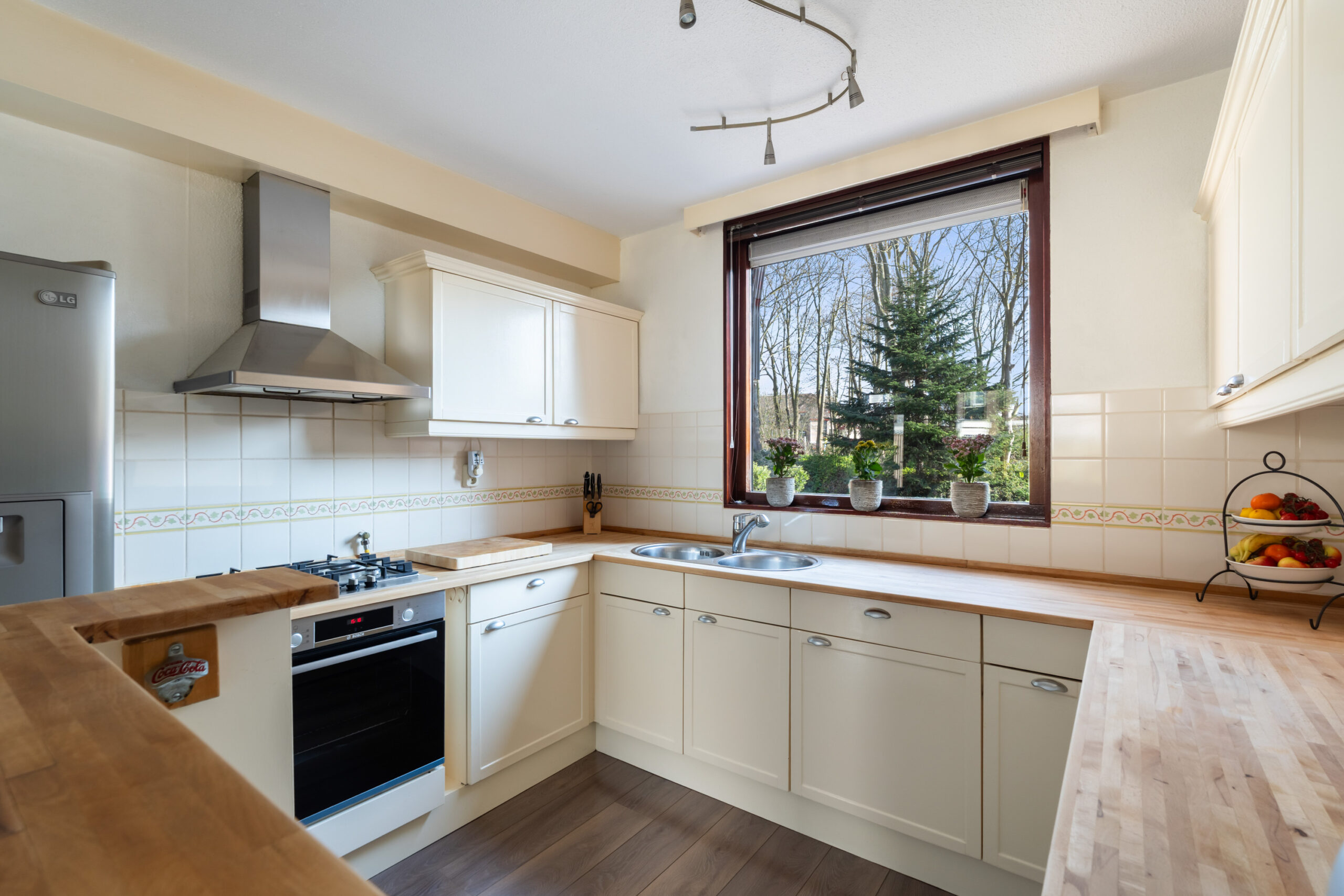 - De open keuken (ca. 3,26 x 2,99 m) ligt aan de voorzijde en is uitgevoerd in een hoekopstelling met diverse inbouwapparatuur, waaronder een gaskookplaat, afzuigkap, oven, Amerikaanse koelkast en vaatwasser.