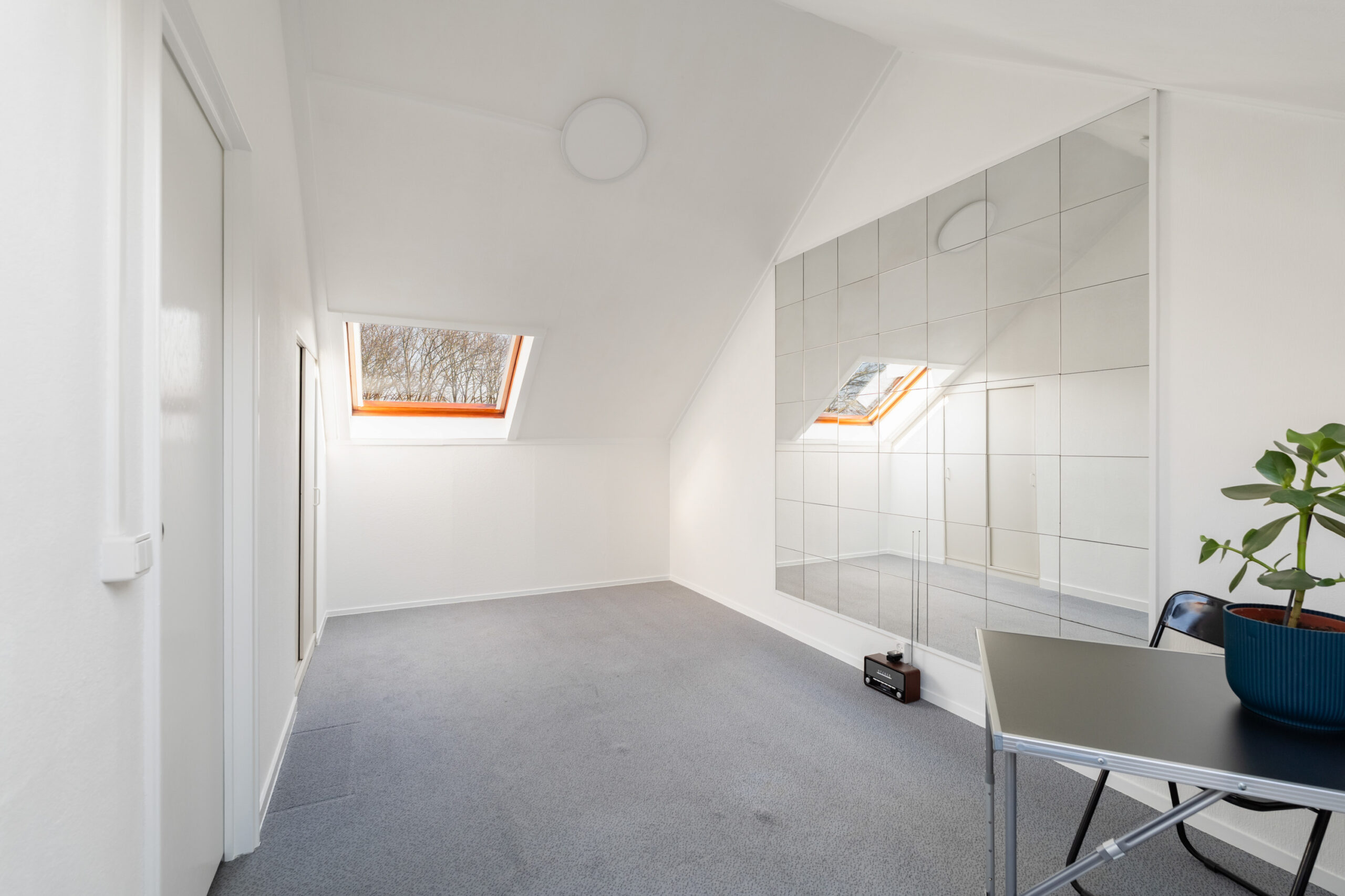 - De ruime zolderkamer (ca. 5,24 x 5,17 m) is voorzien van dakramen die zorgen voor veel natuurlijk licht, evenals praktische, verlichte bergruimte achter de knieschotten.