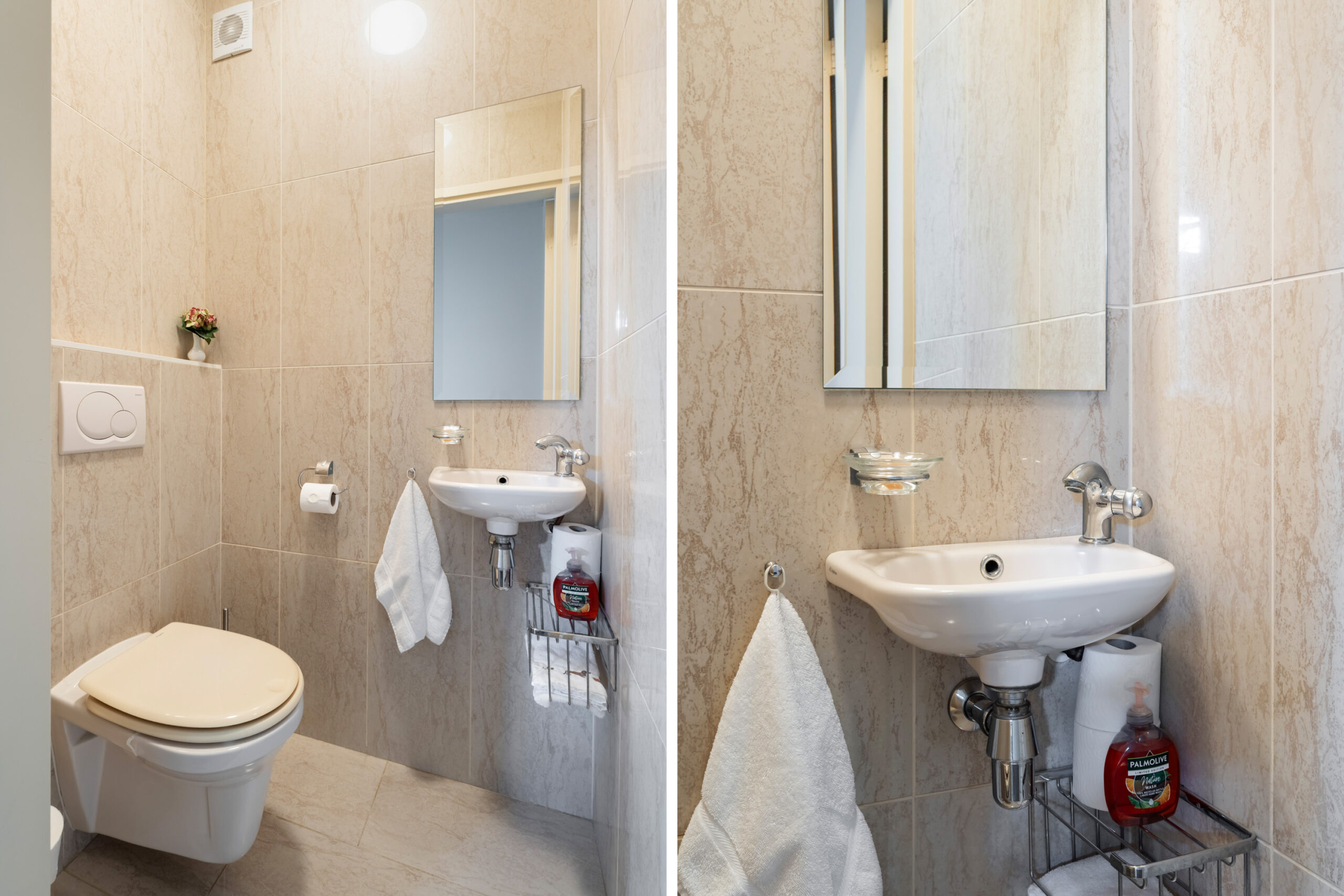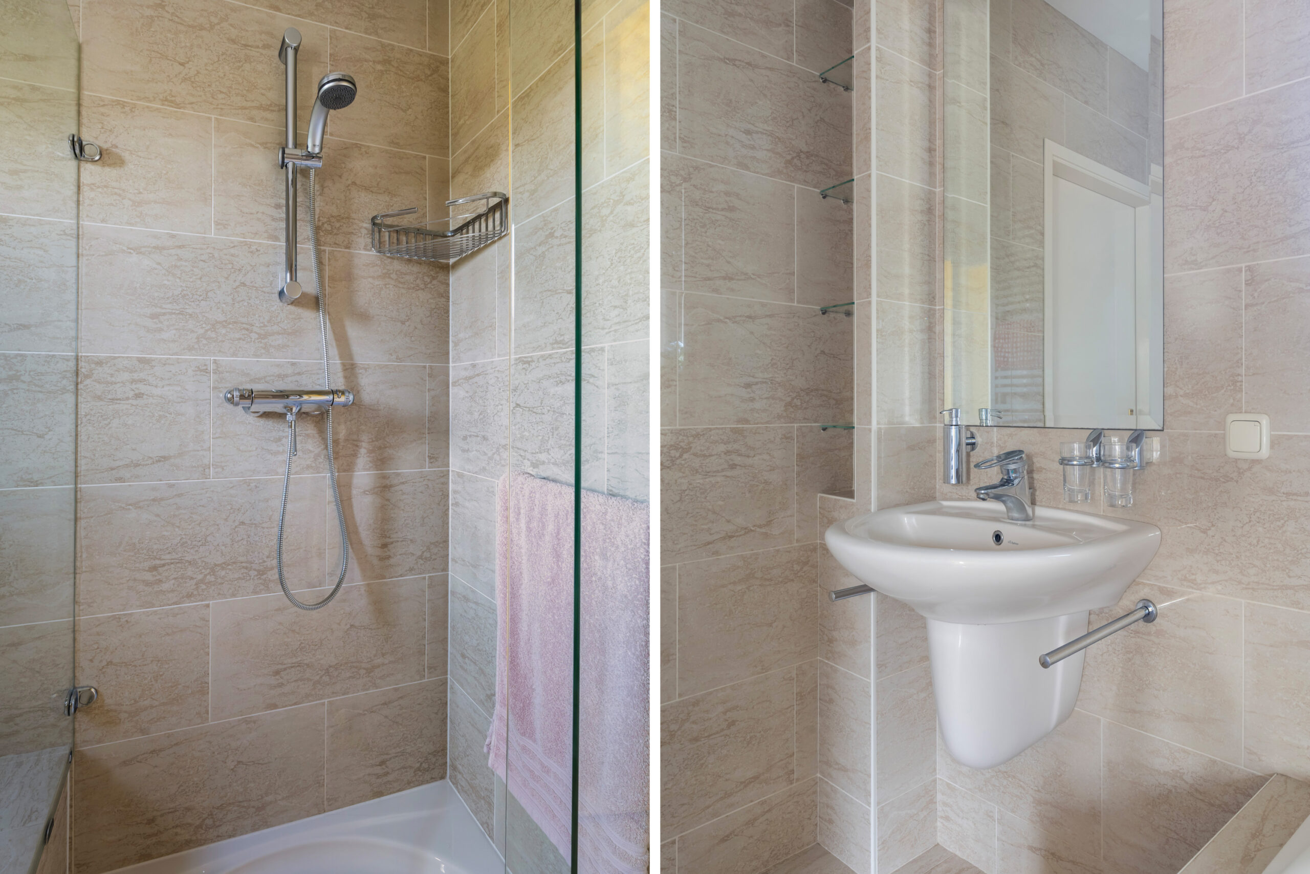 - Geheel betegelde badkamer met ligbad, douche, wastafel en vloerverwarming.