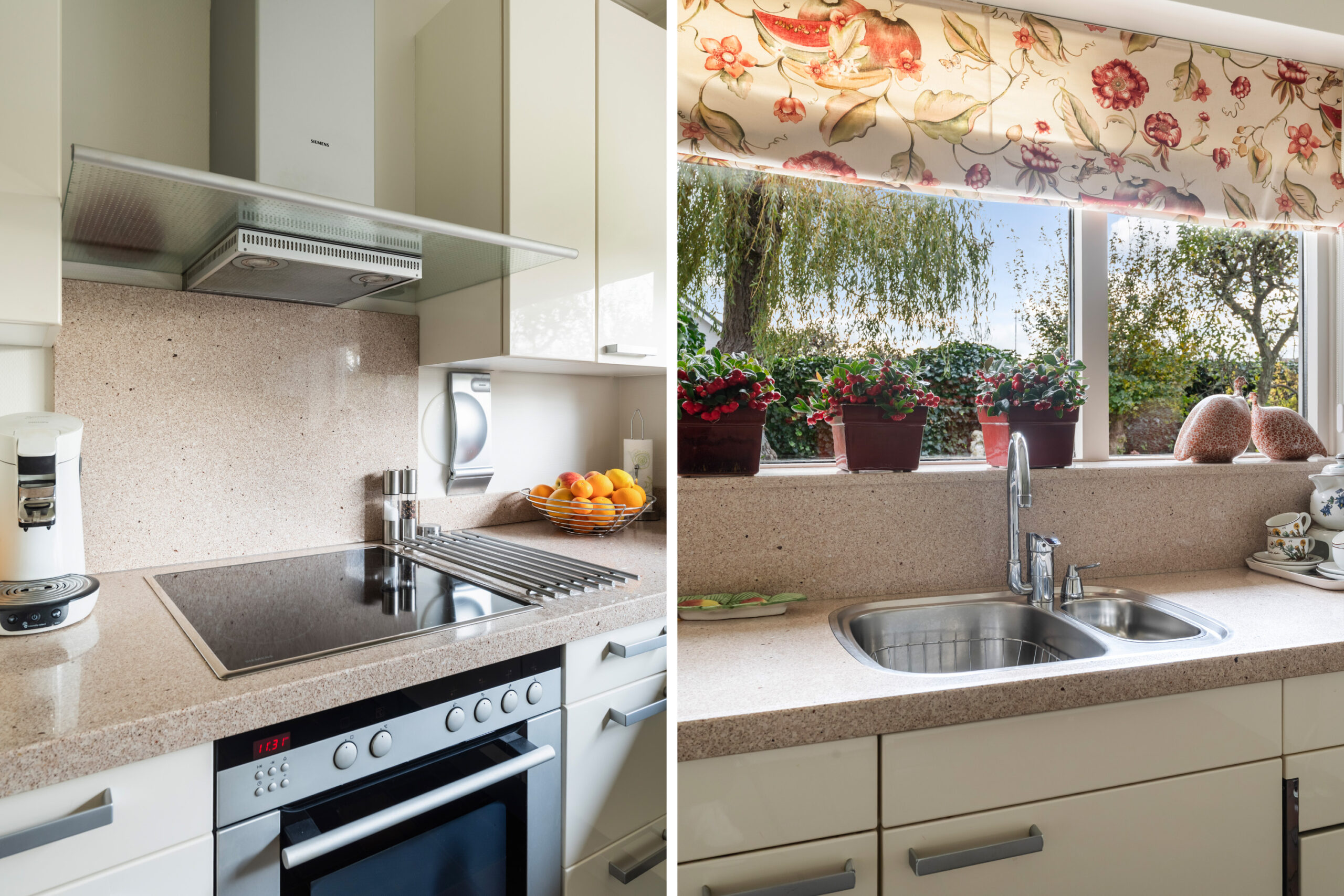 - Keuken in lichte kleurstelling en geplaatst in hoekopstelling, uitgevoerd met diverse inbouwapparatuur en hardstenen aanrechtblad;