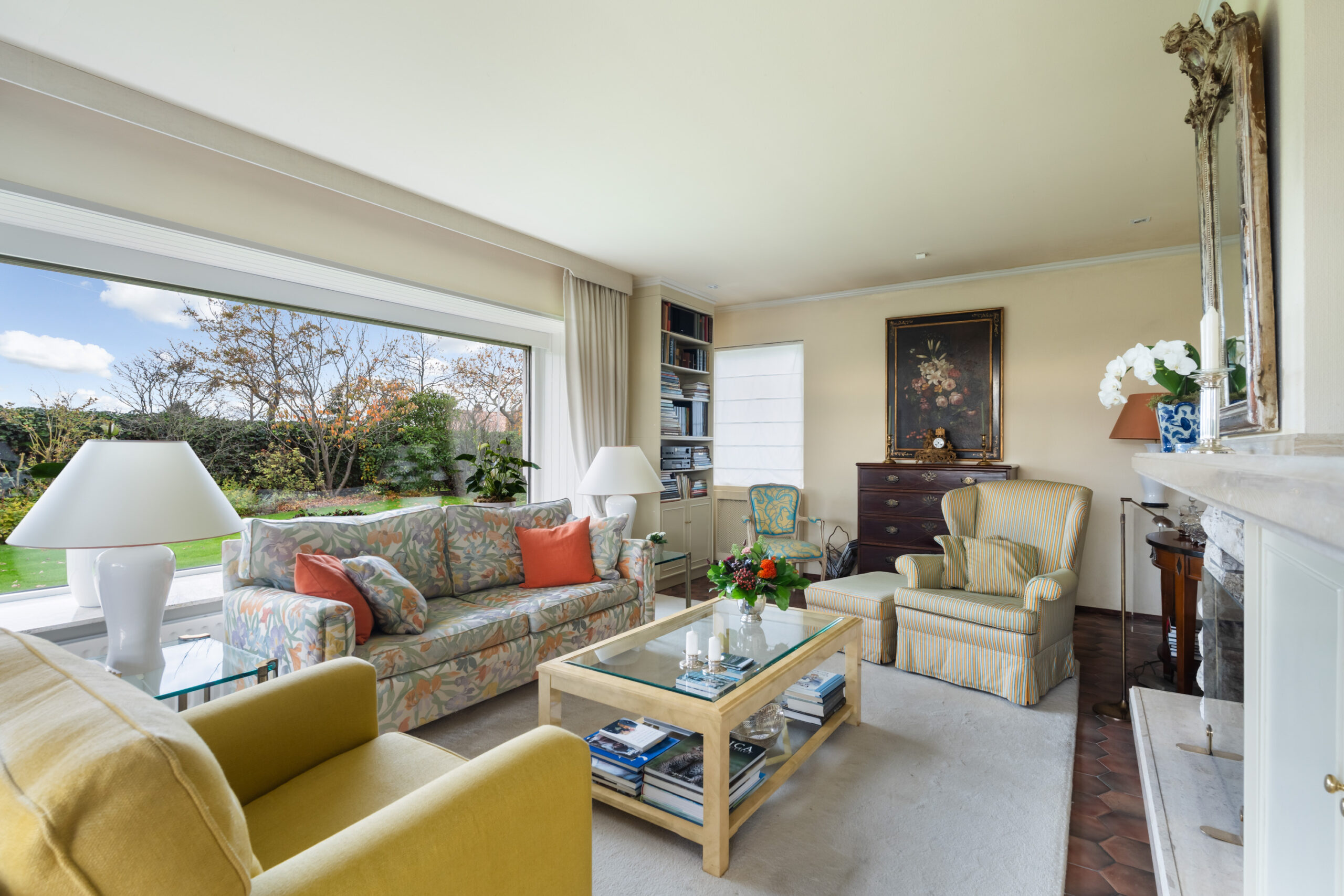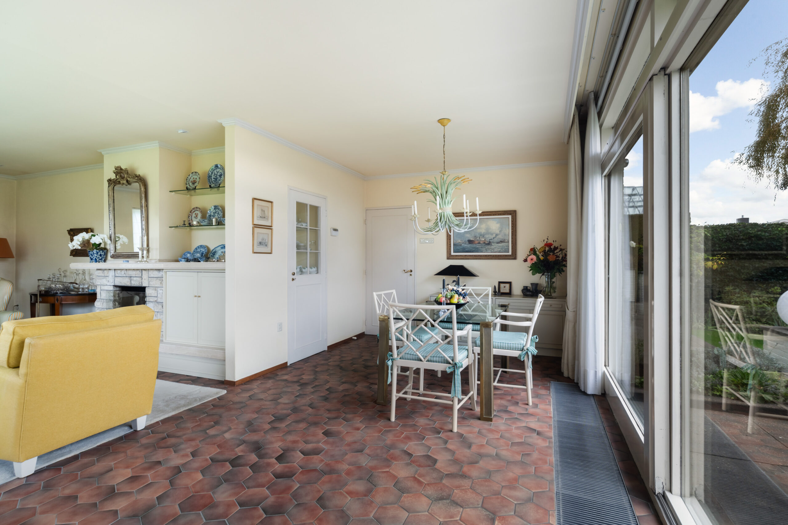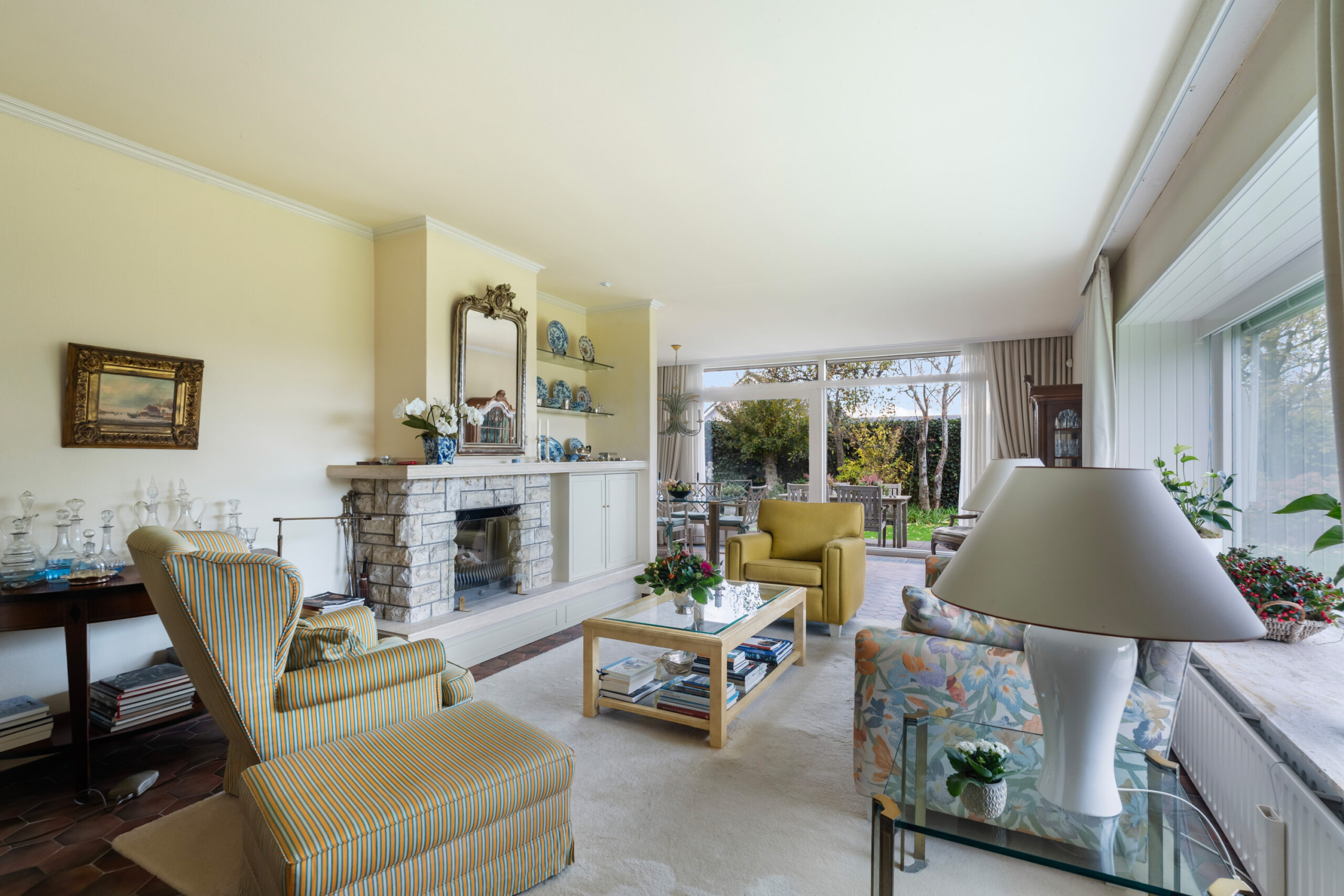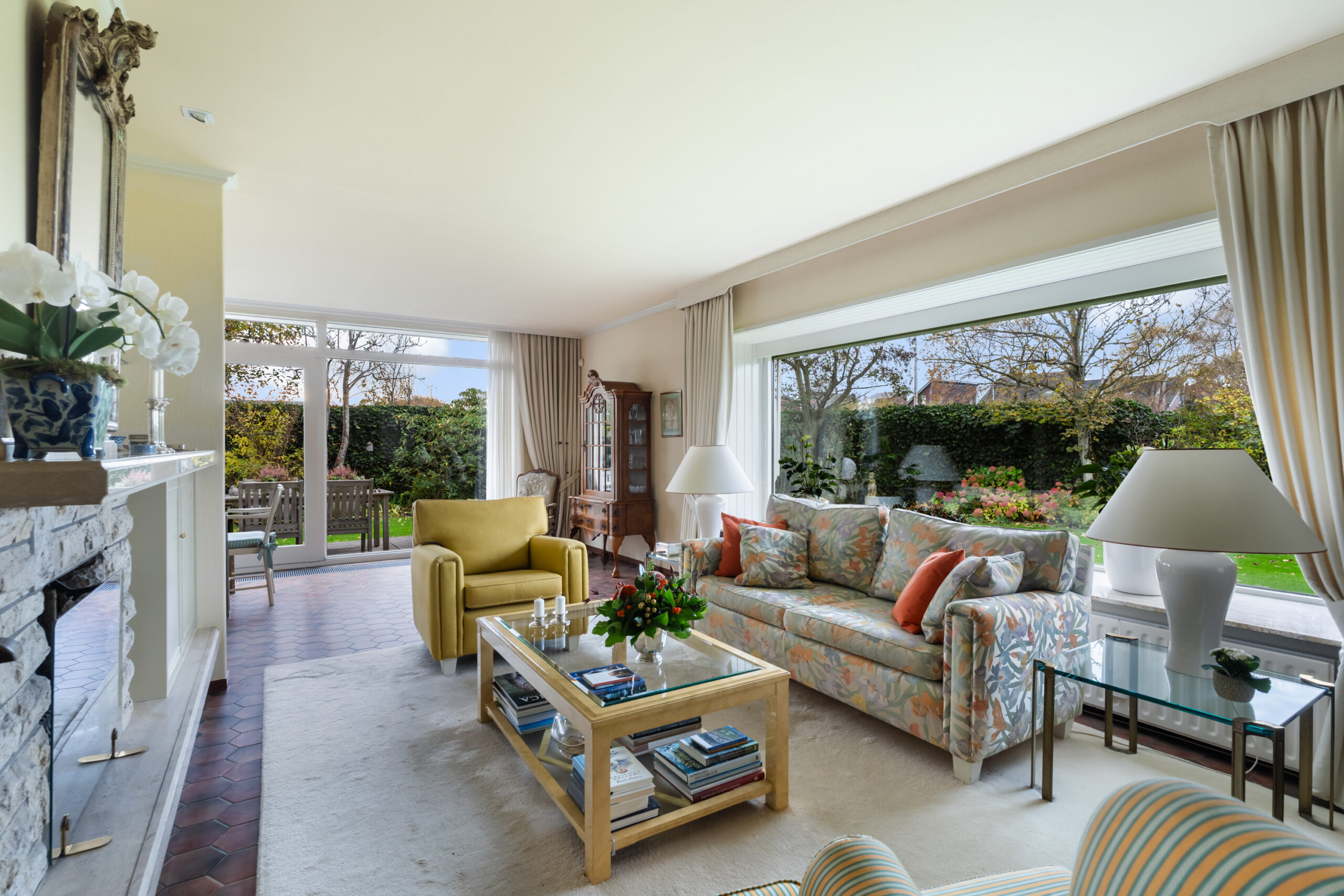 - Riante en lichte woonkamer (ca. 40 m²) met een op gasgestookte open haard, veel raampartijen en schuifpuien naar de tuin;