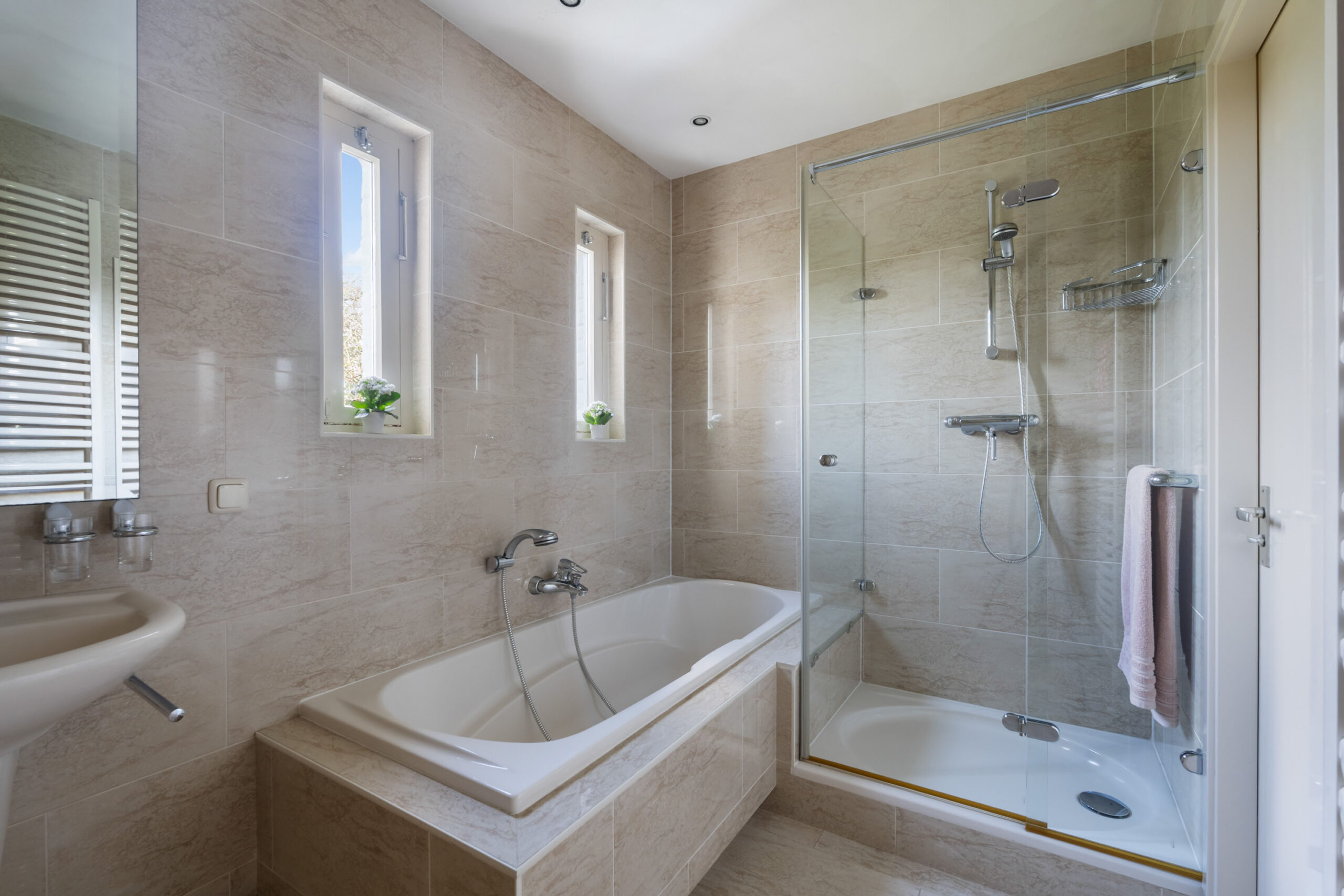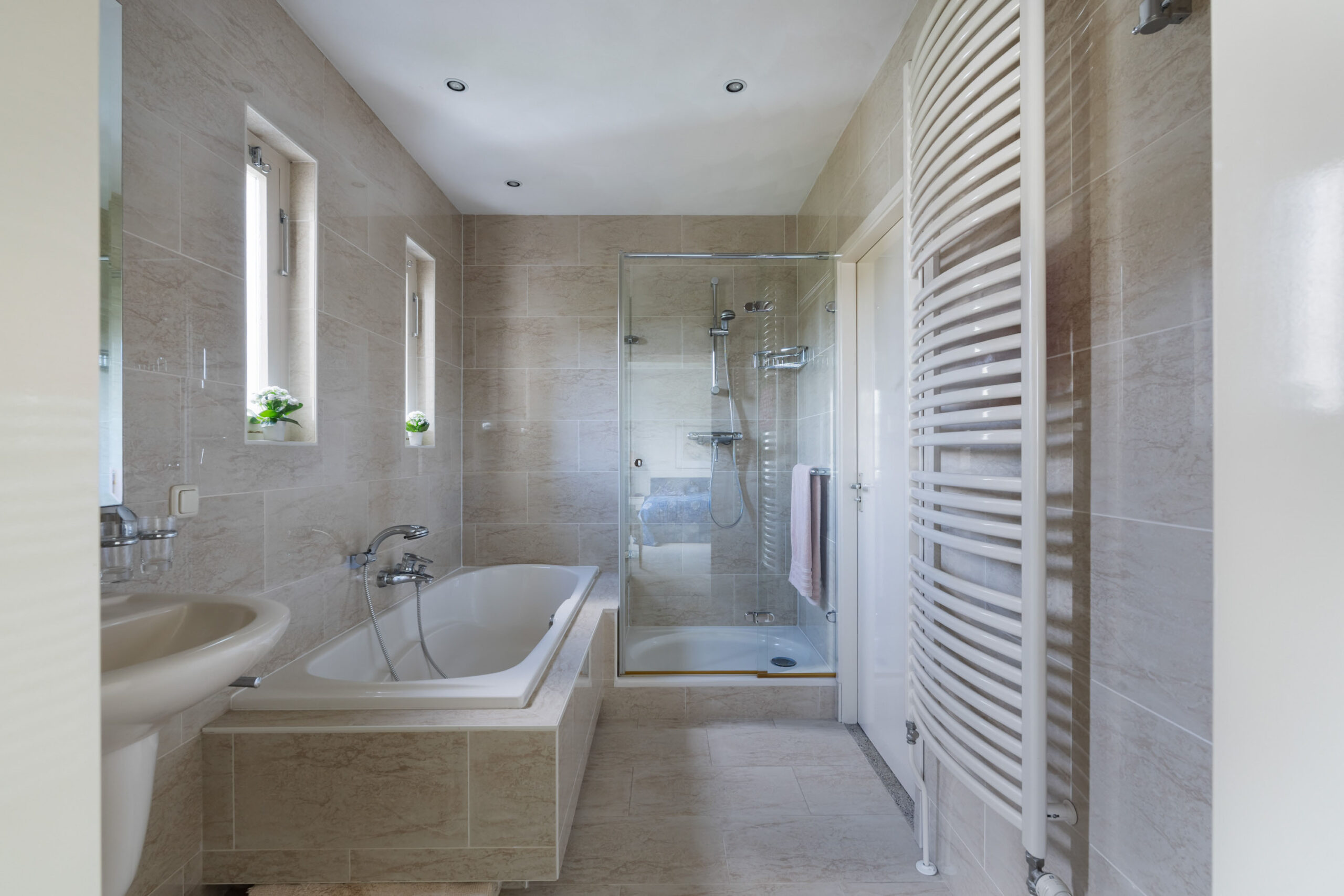 - Badkamervoorzieningen Ligbad, douche, wastafel, vloerverwarming