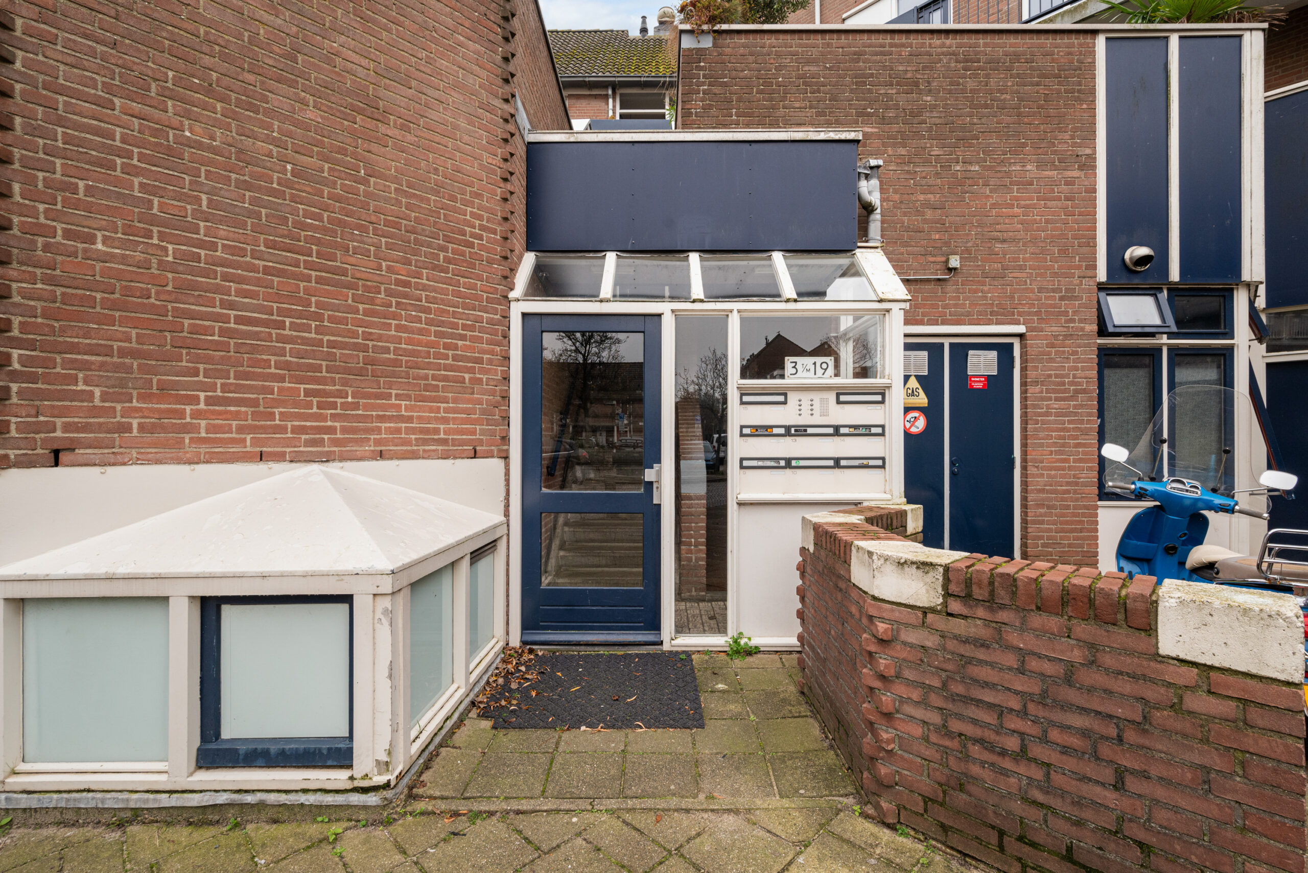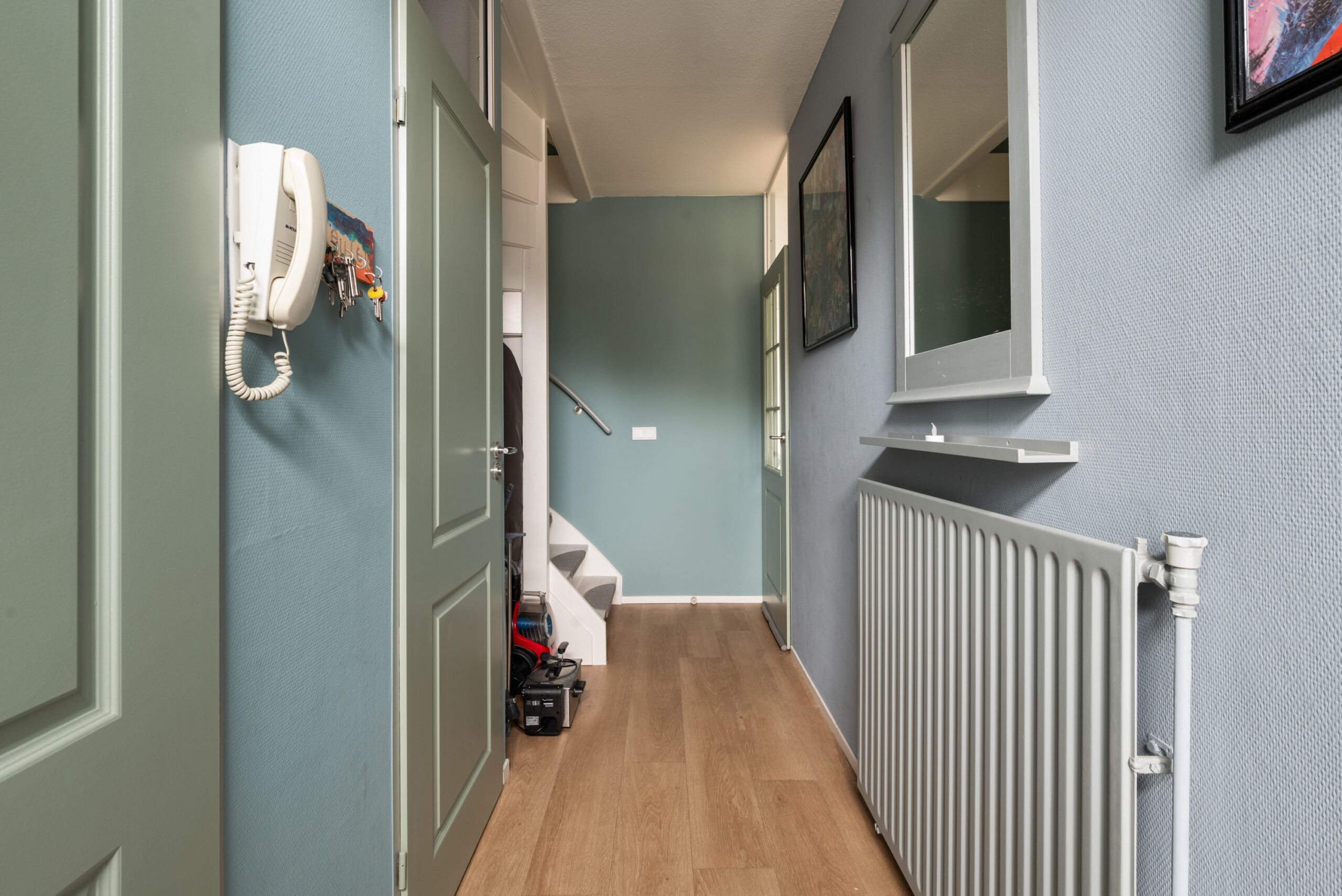 Gesloten entree met brievenbussen en een trappenhuis naar de 2e verdieping met galerij;