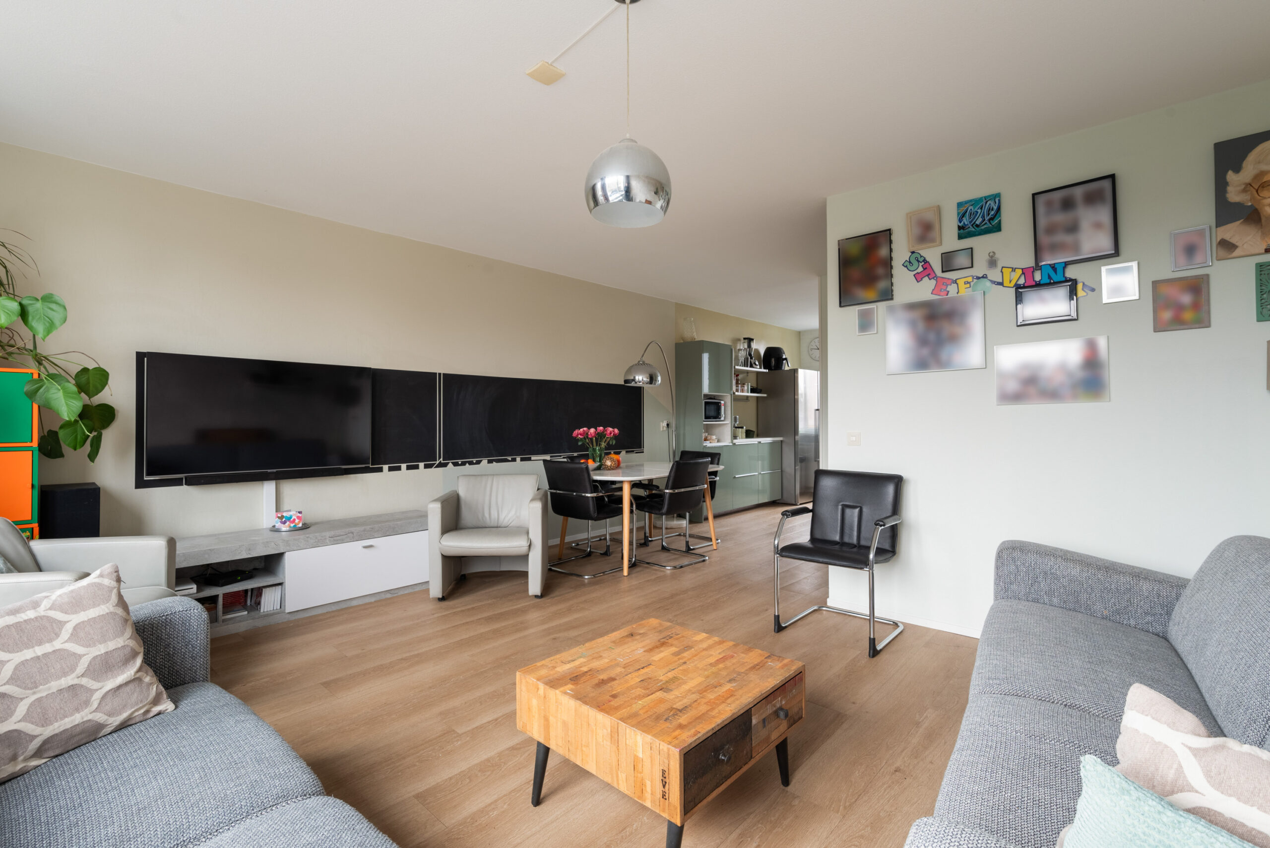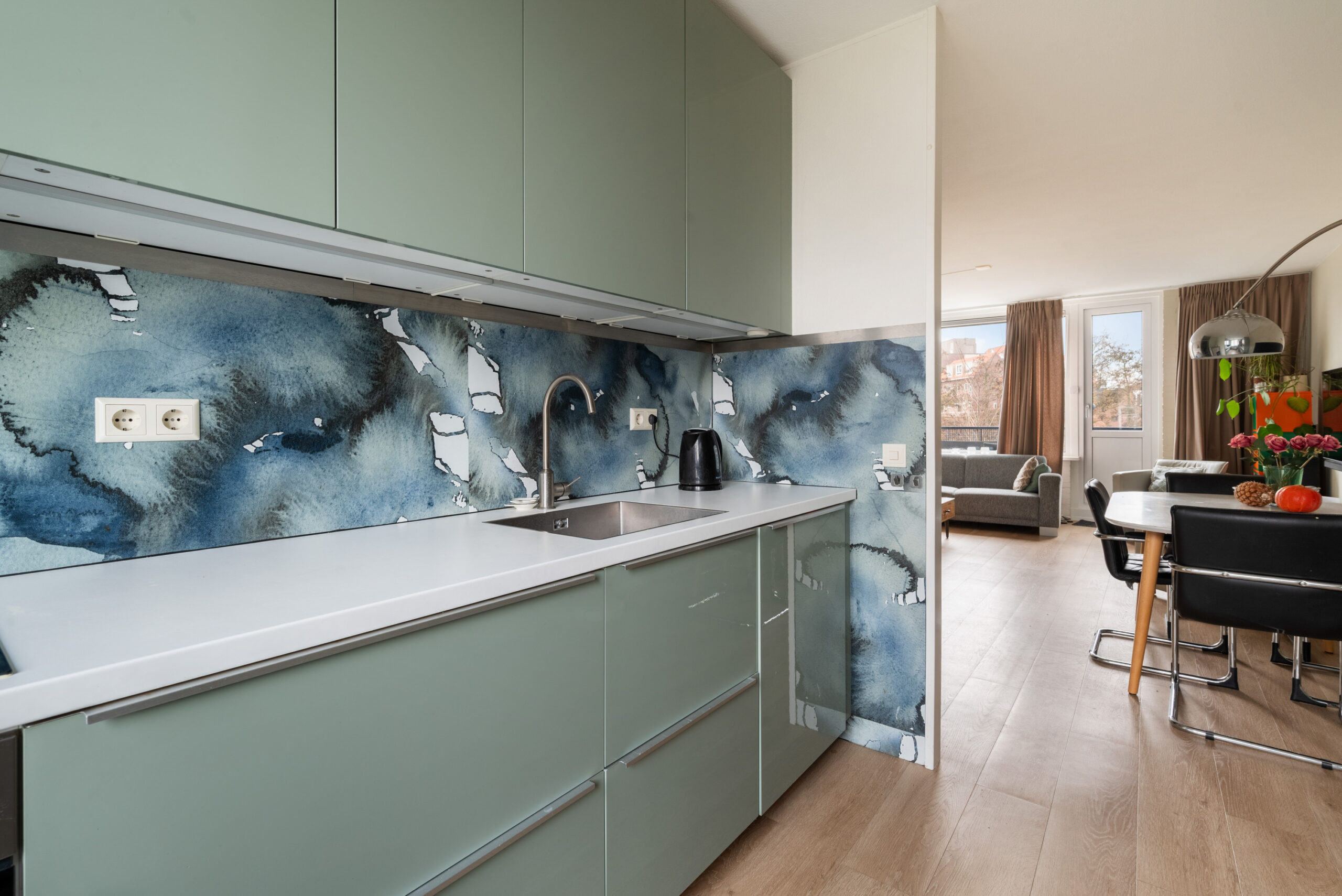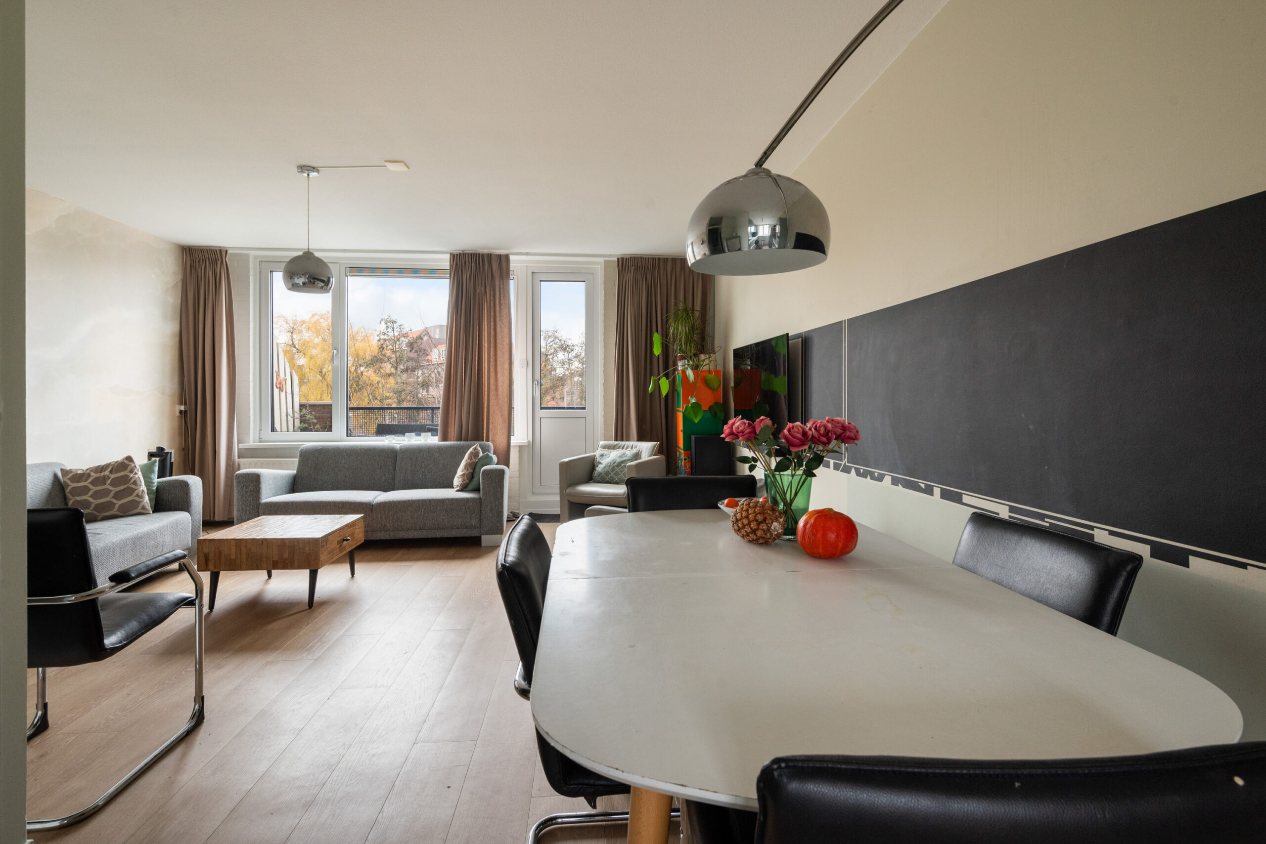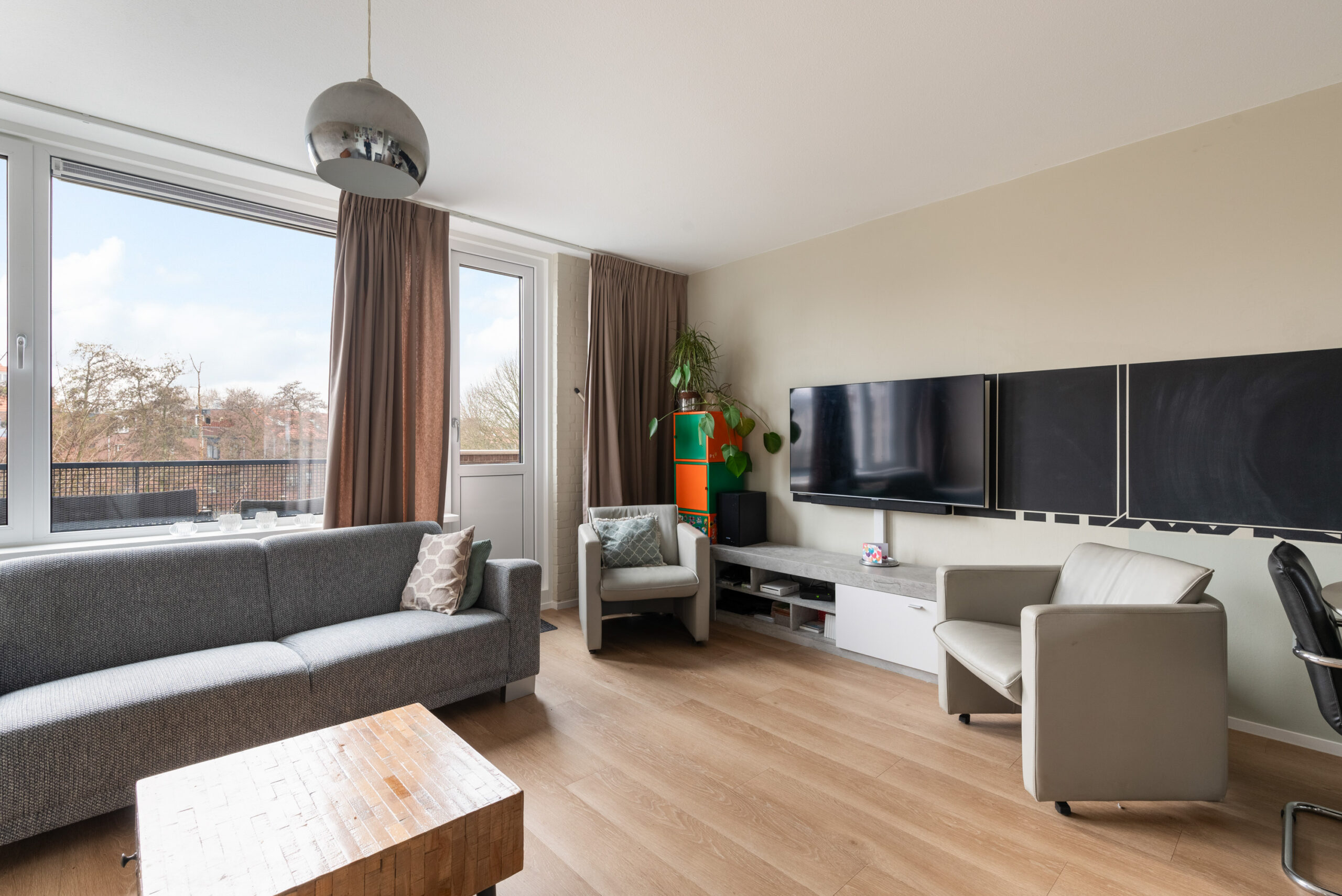 - Woonkamer aan de achterzijde, toegang naar het zonnige balkon met vrij uitzicht over het groen,