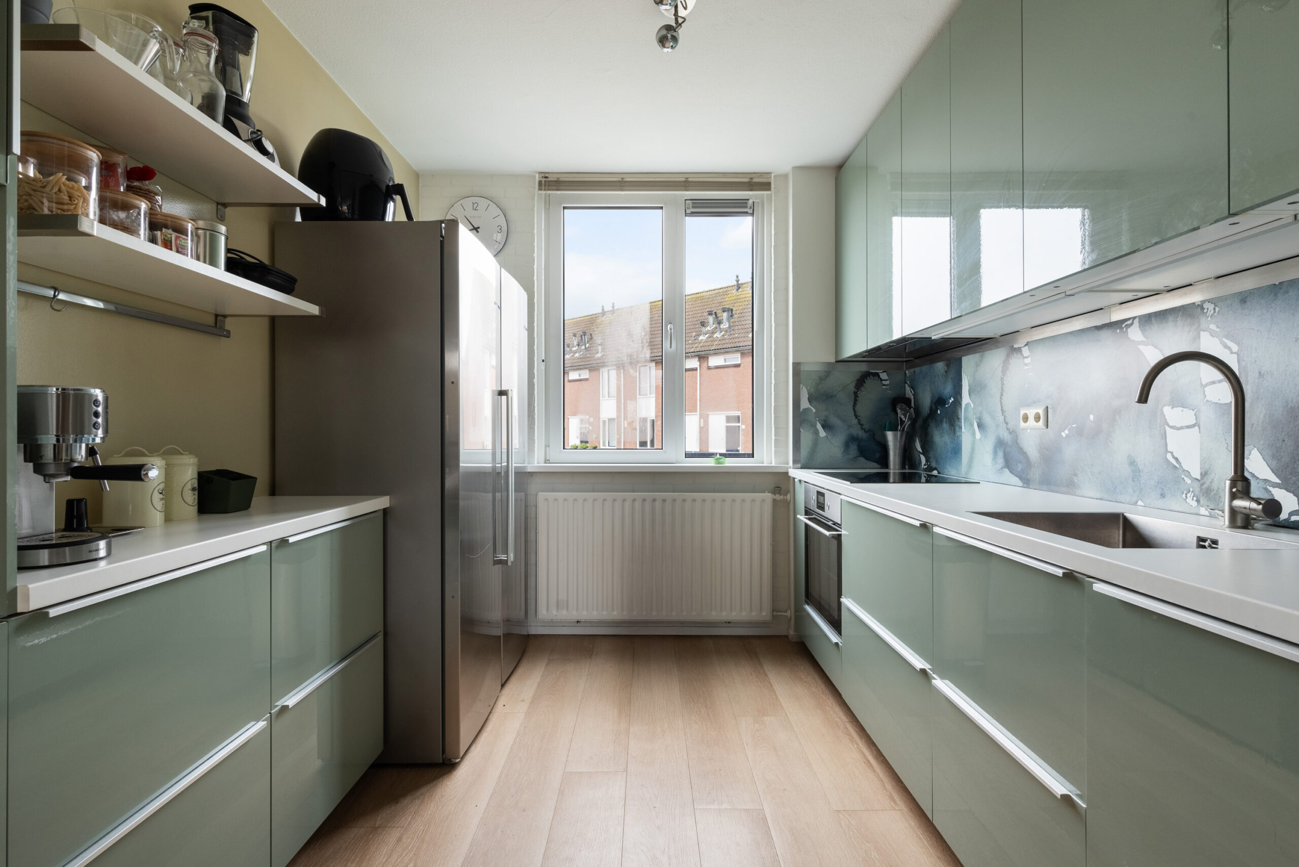 - Moderne keuken aan de voorzijde met twee wandopstellingen en uitgevoerd met diverse inbouwappartuur;