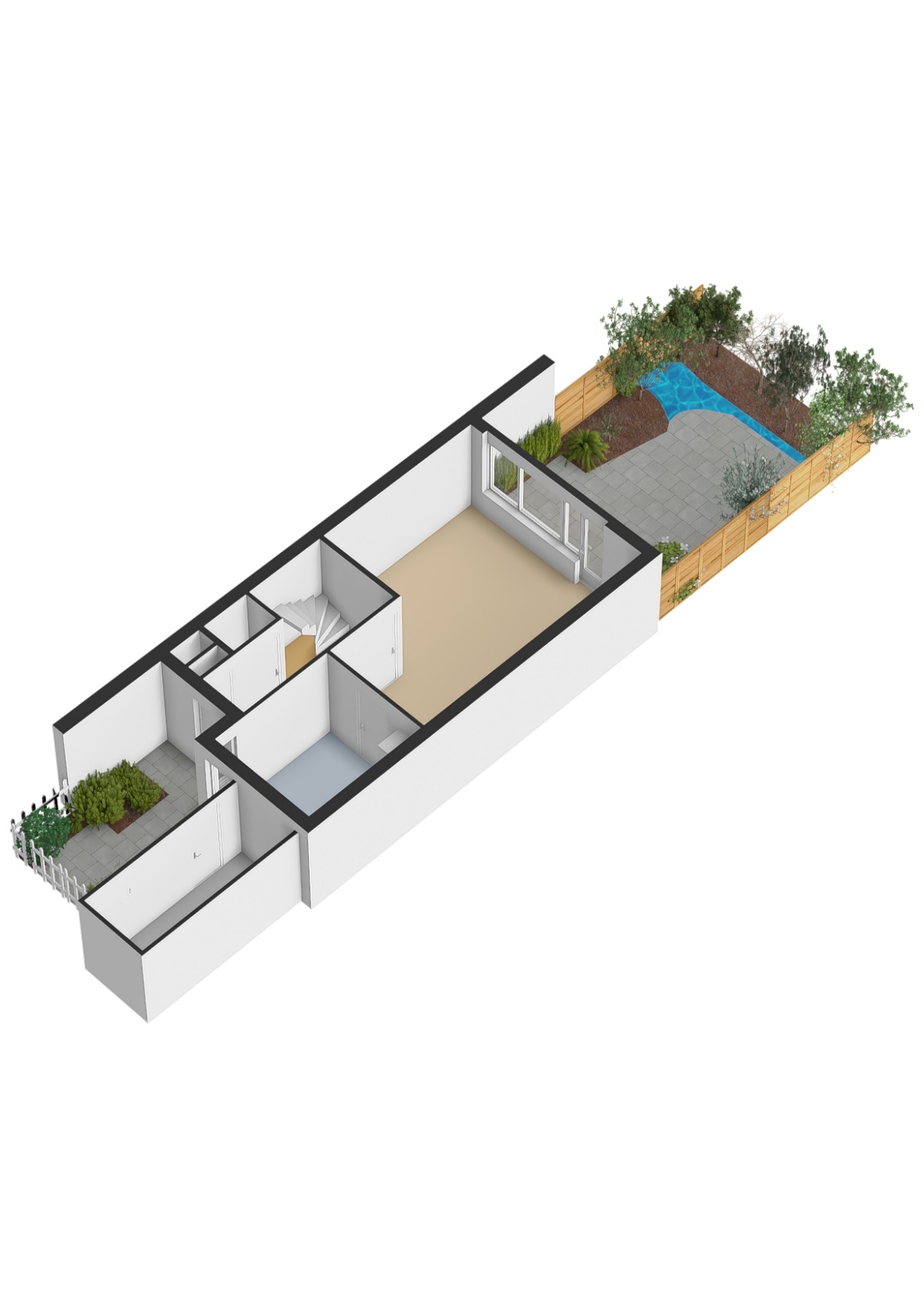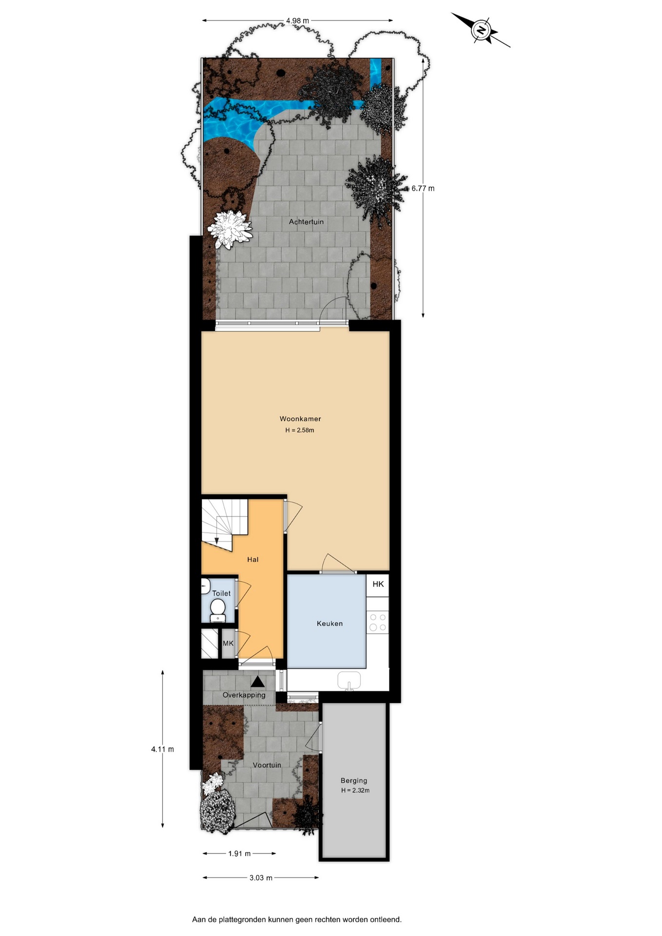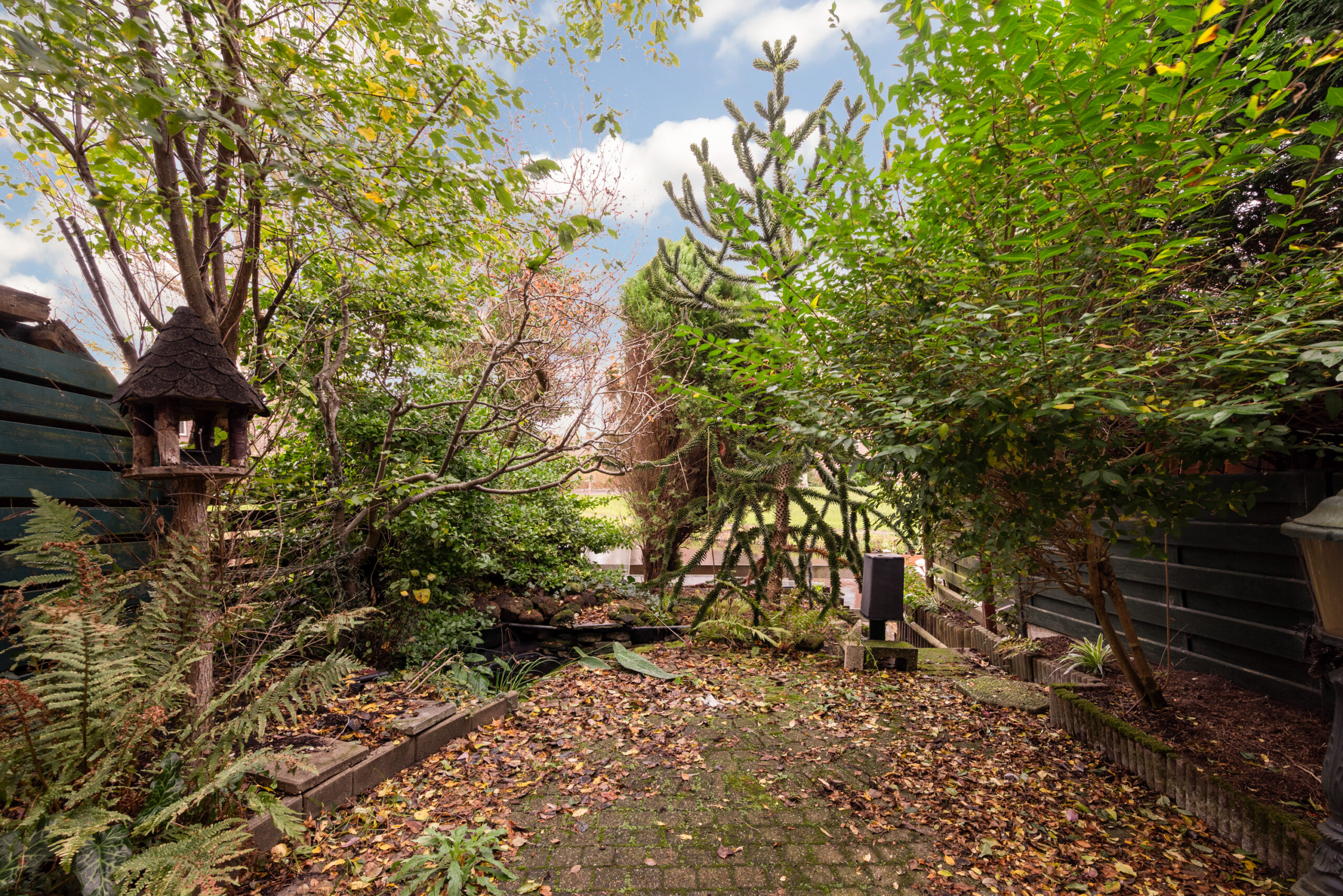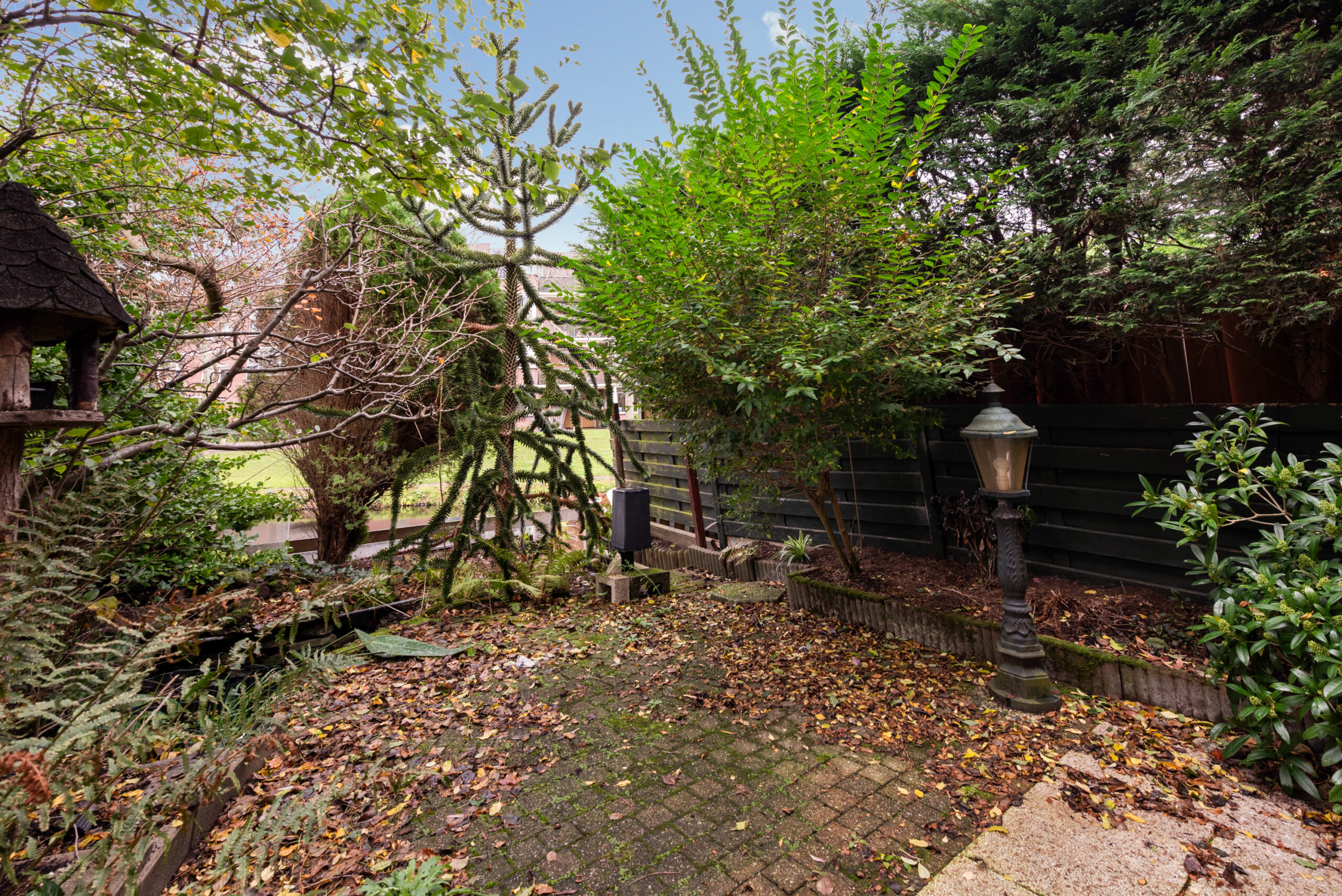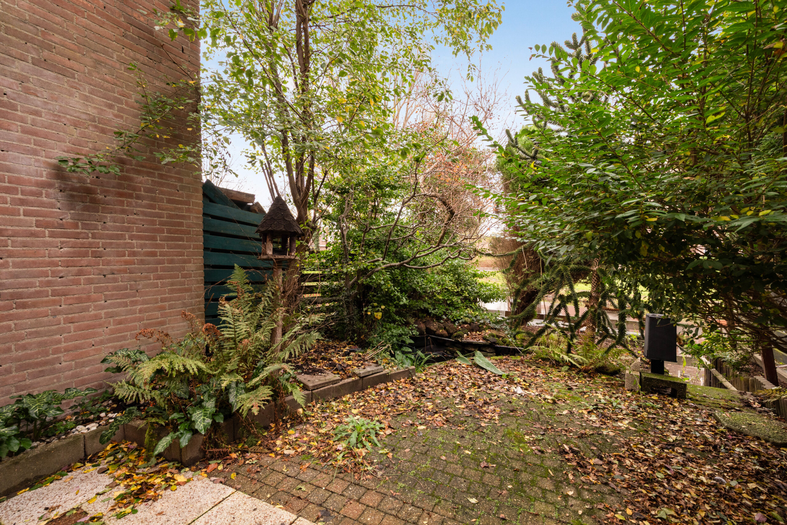 - De achtertuin (ca. 6,77 x 4,98 m) is gelegen aan water op het oosten;