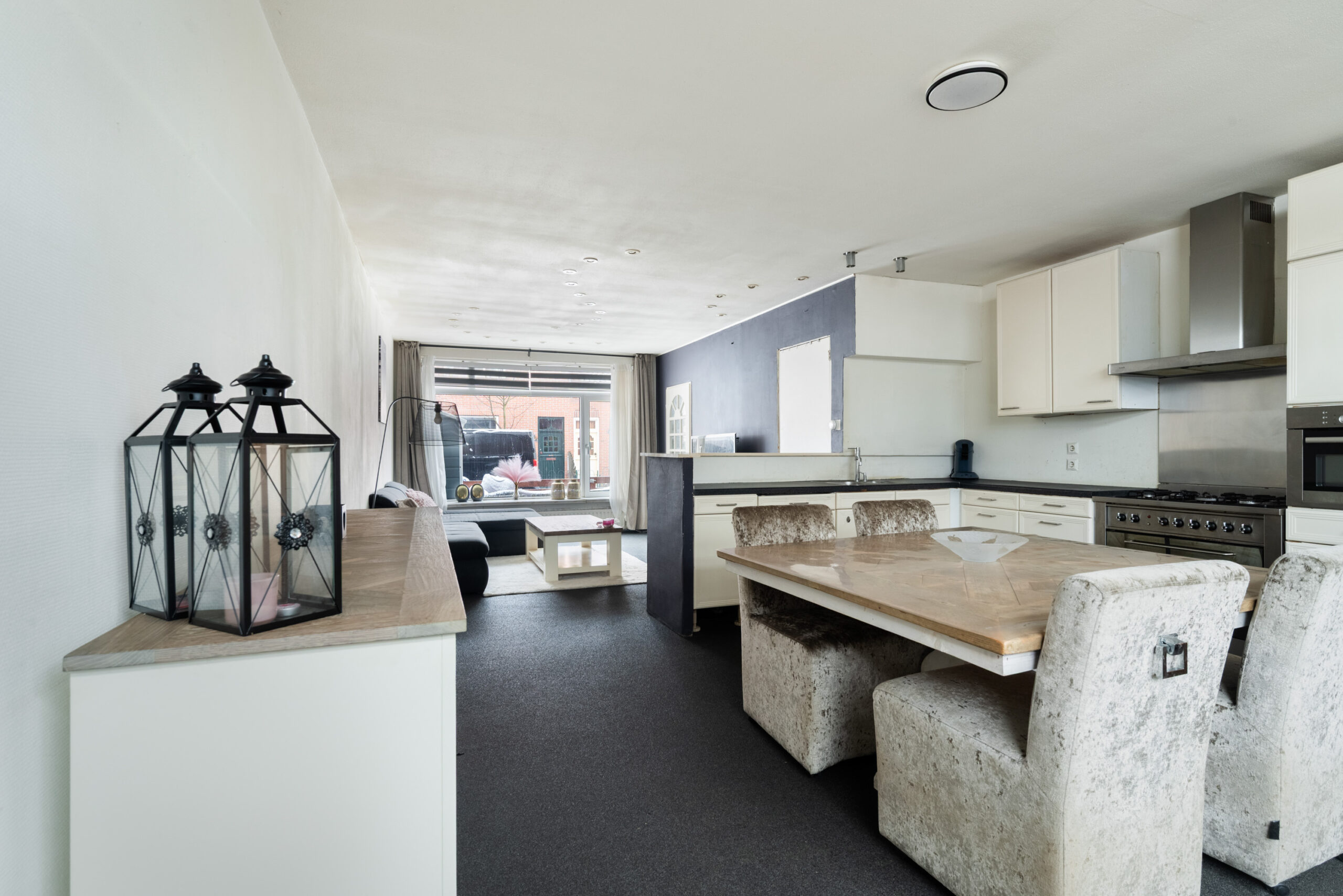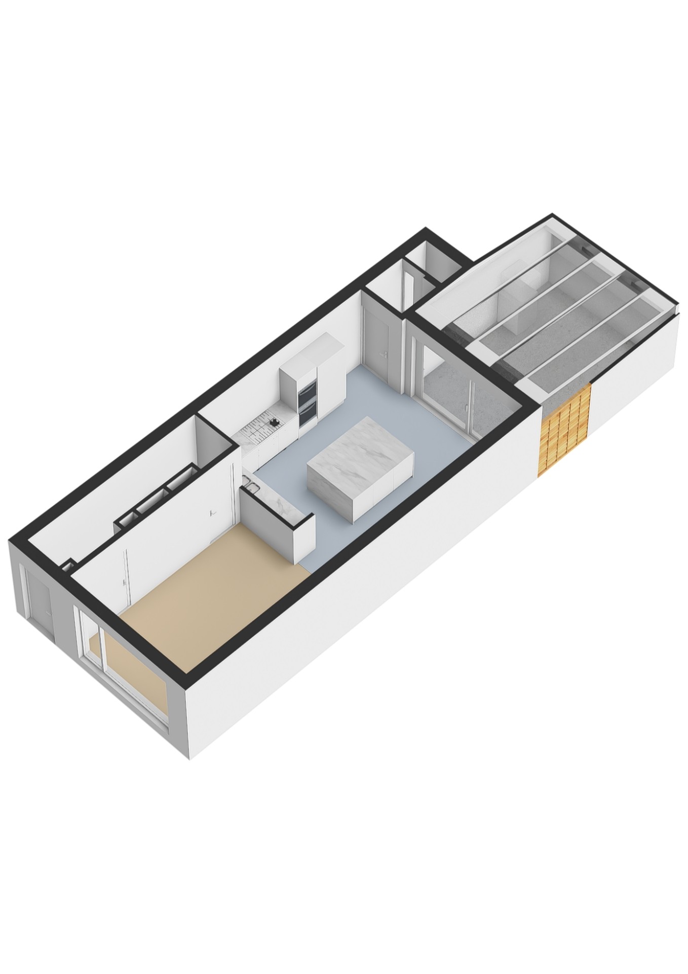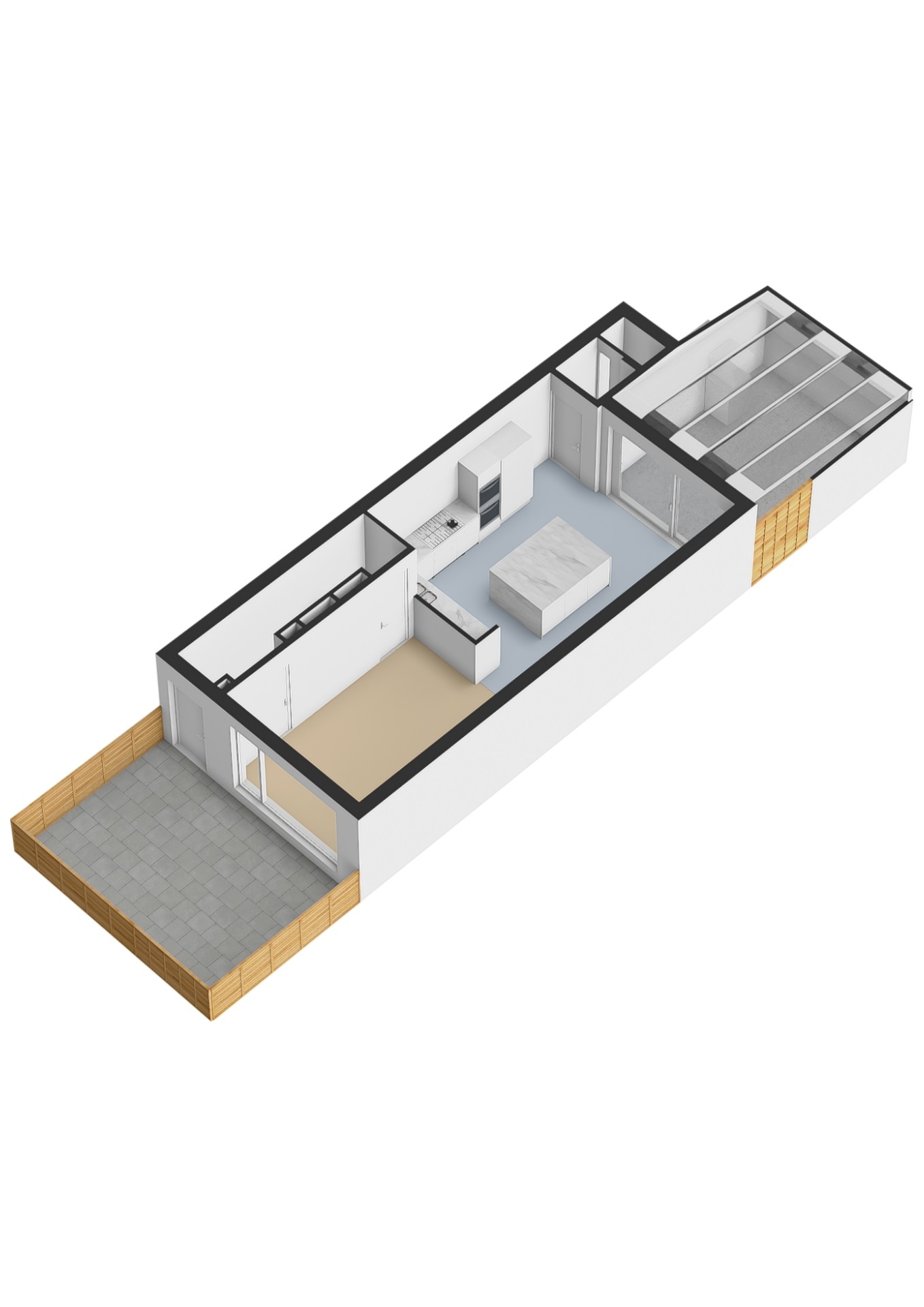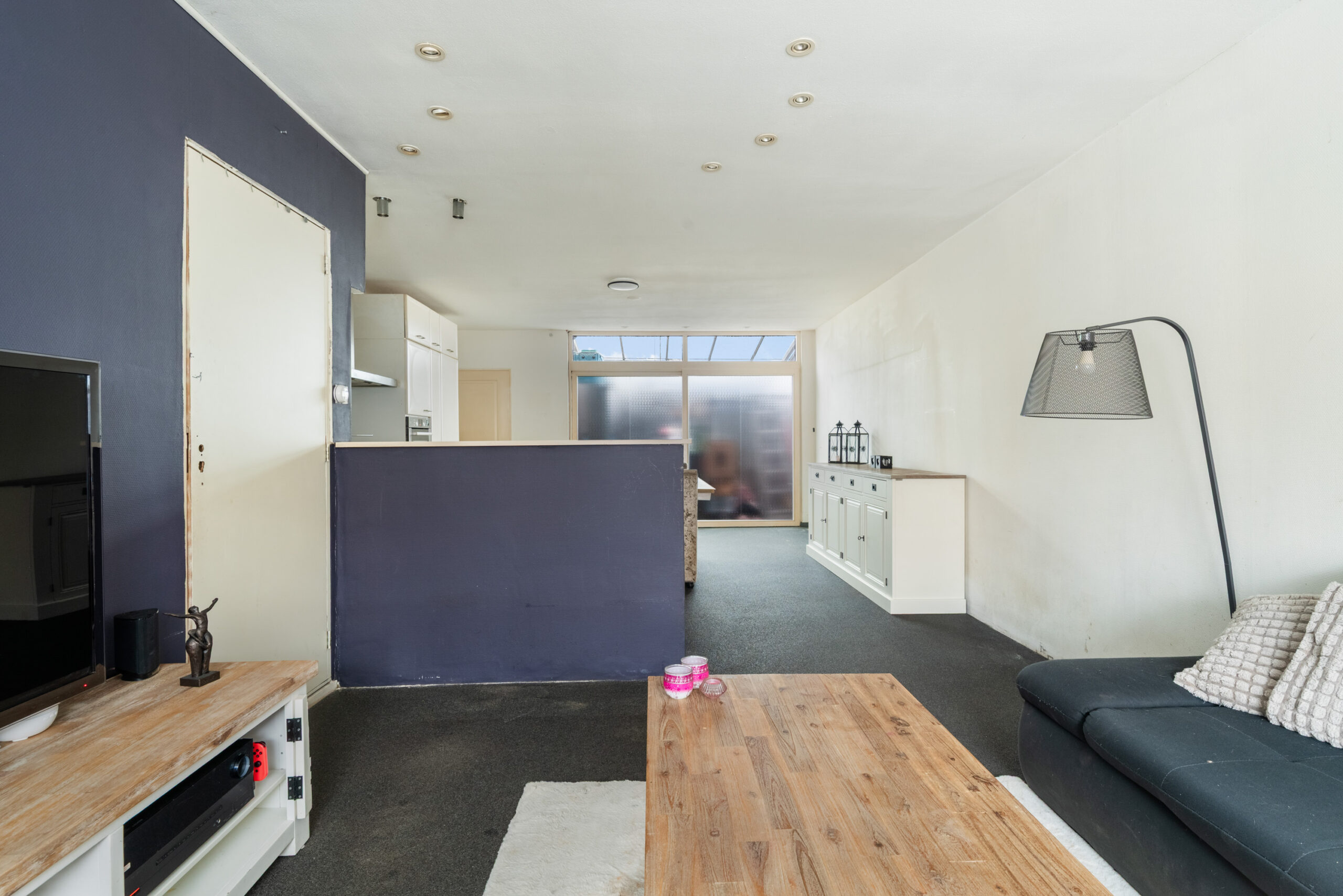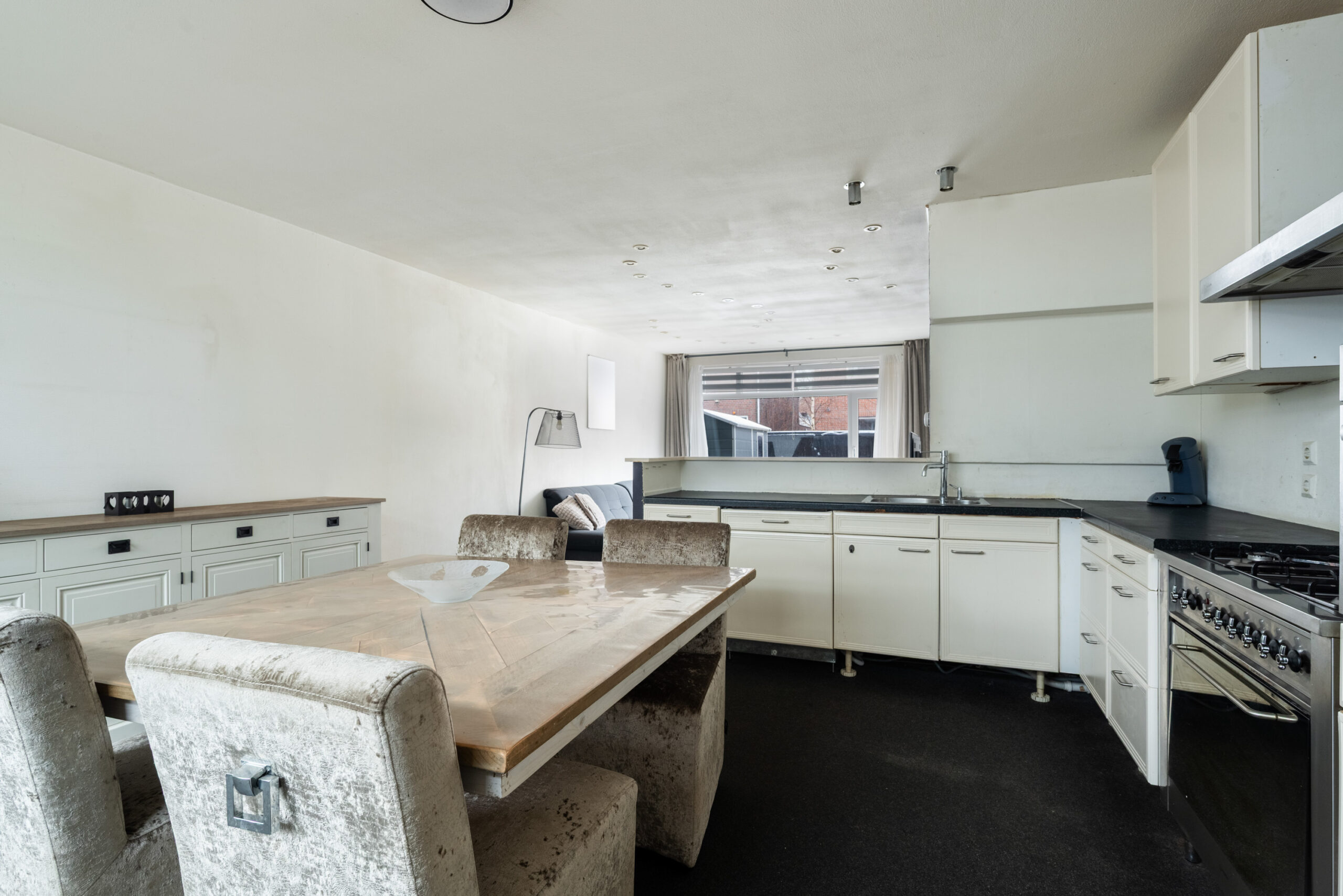 - Lichte woonkamer voorzien van een grindvloer met vloer- en wandverwarming met open keuken en trapkast (totaal ca. 42 m²);