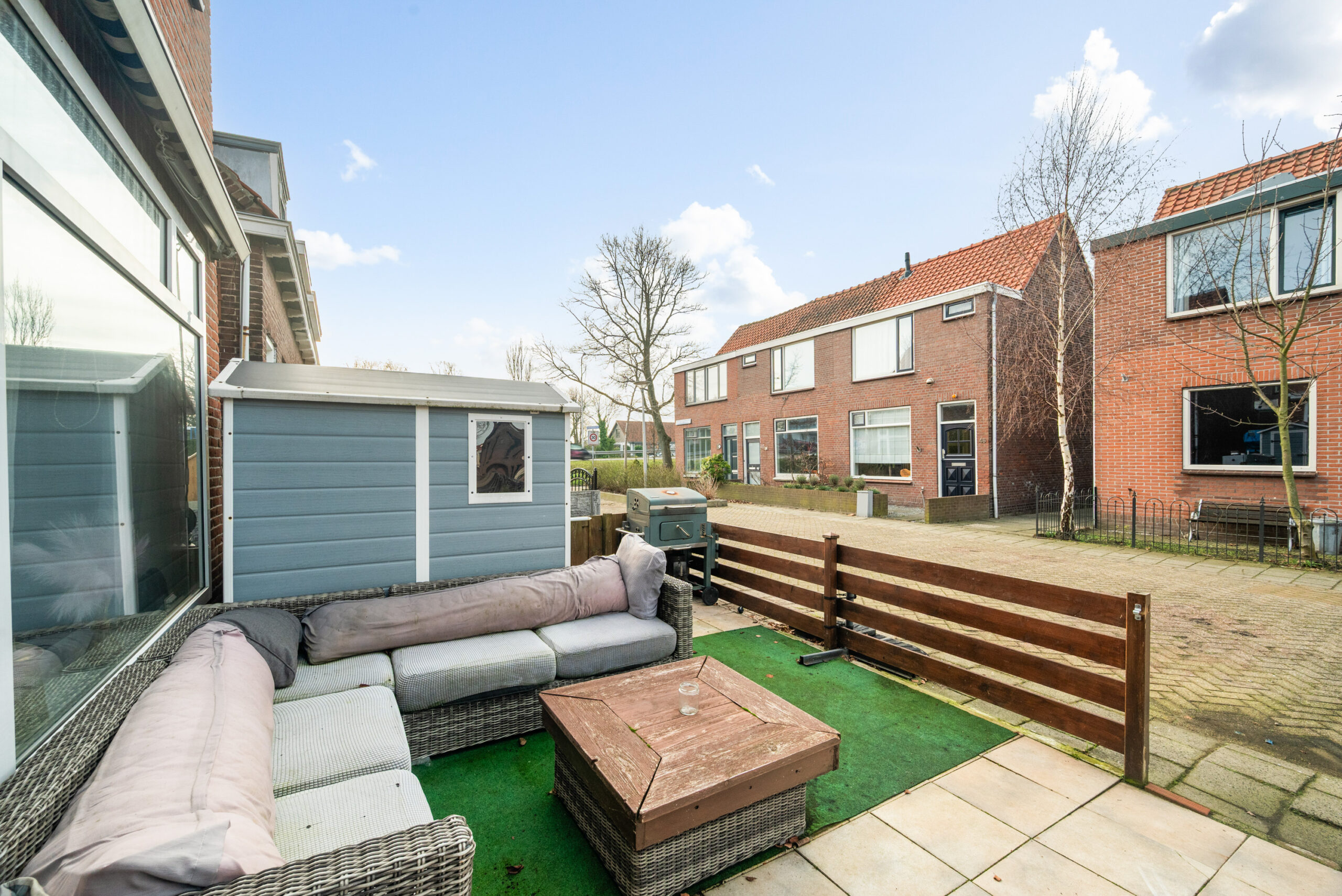 - Middels de schuifpui bereikt u de achtertuin, welke momenteel volledig overkapt is. Vanuit de overkapping is de berging bereikbaar.