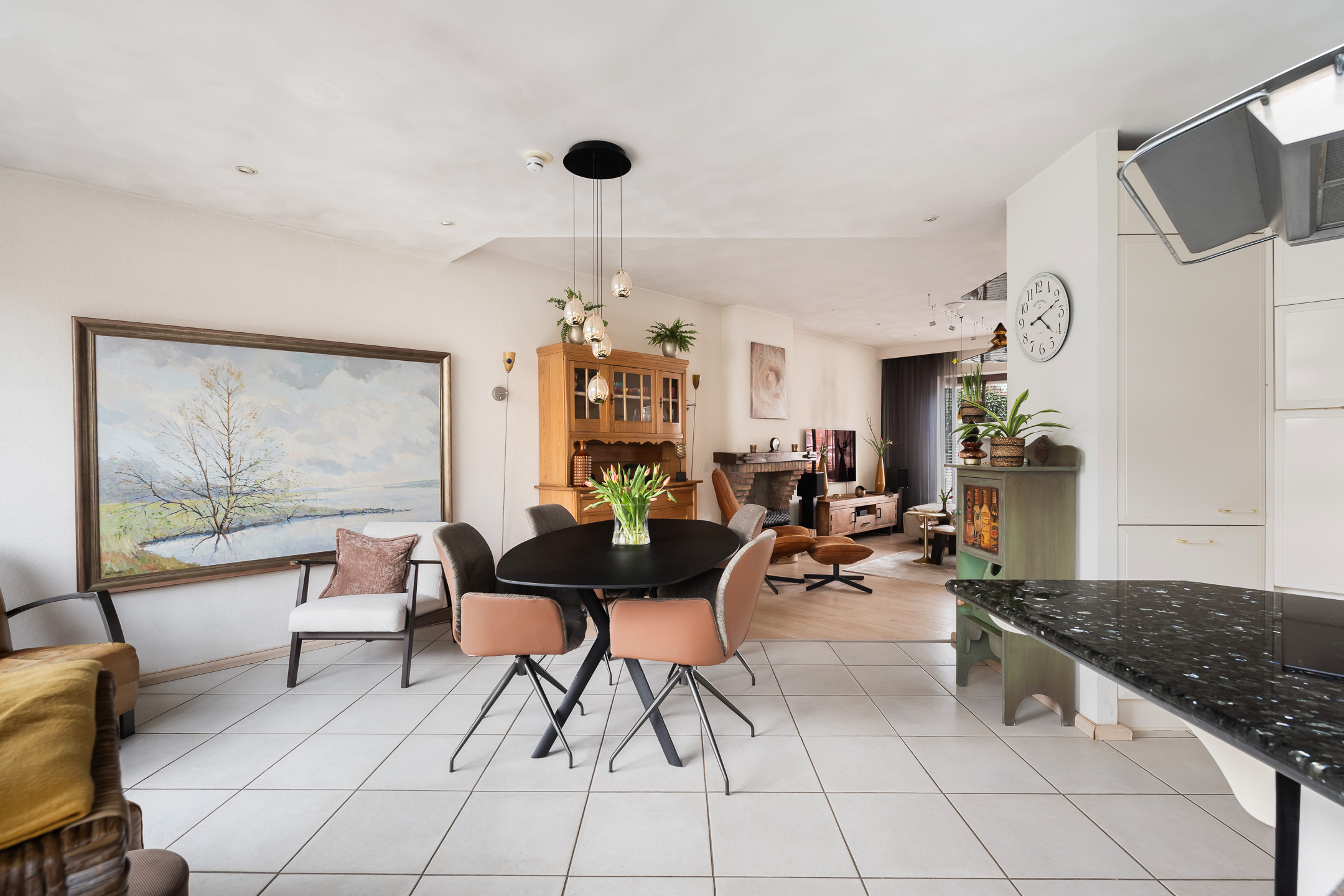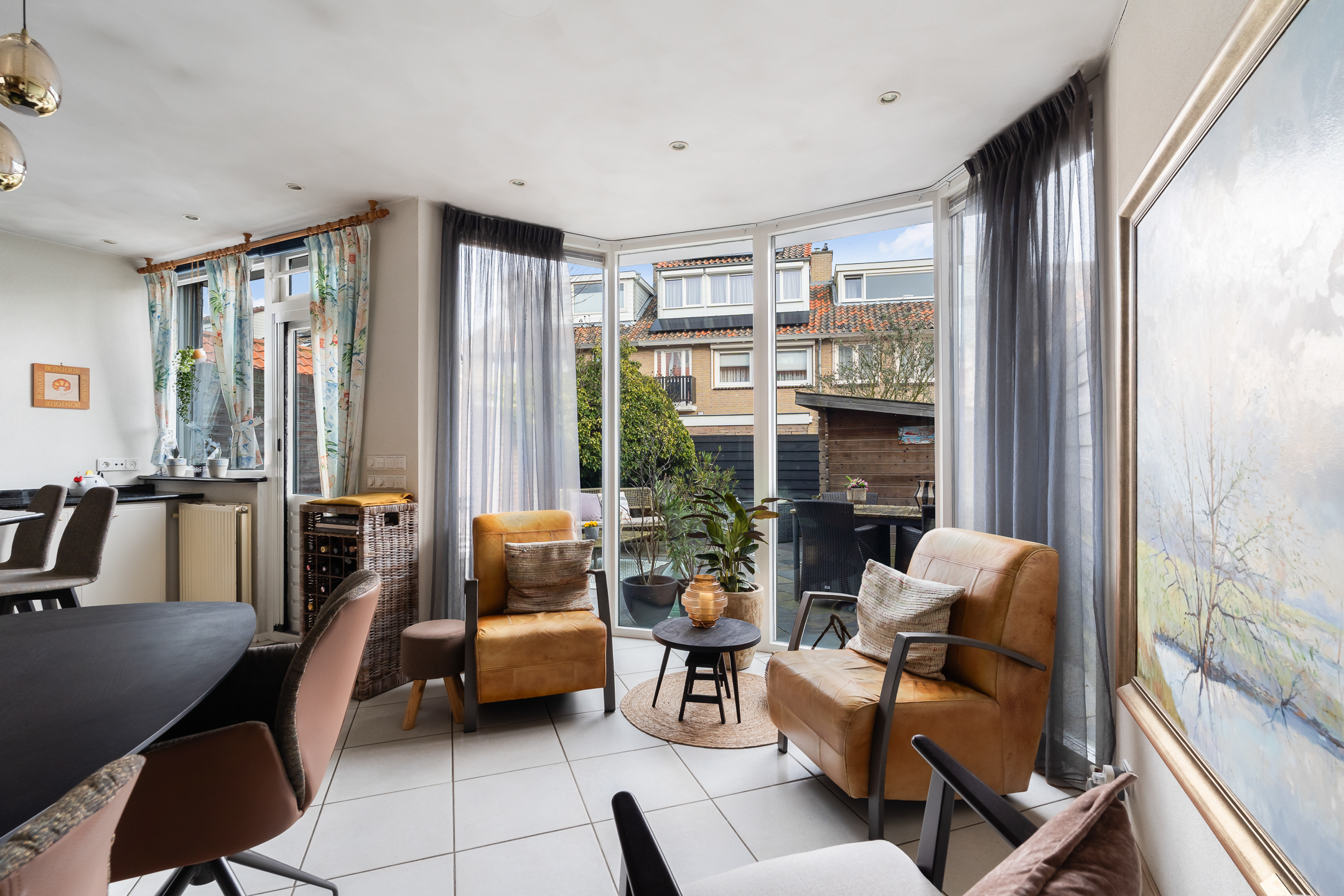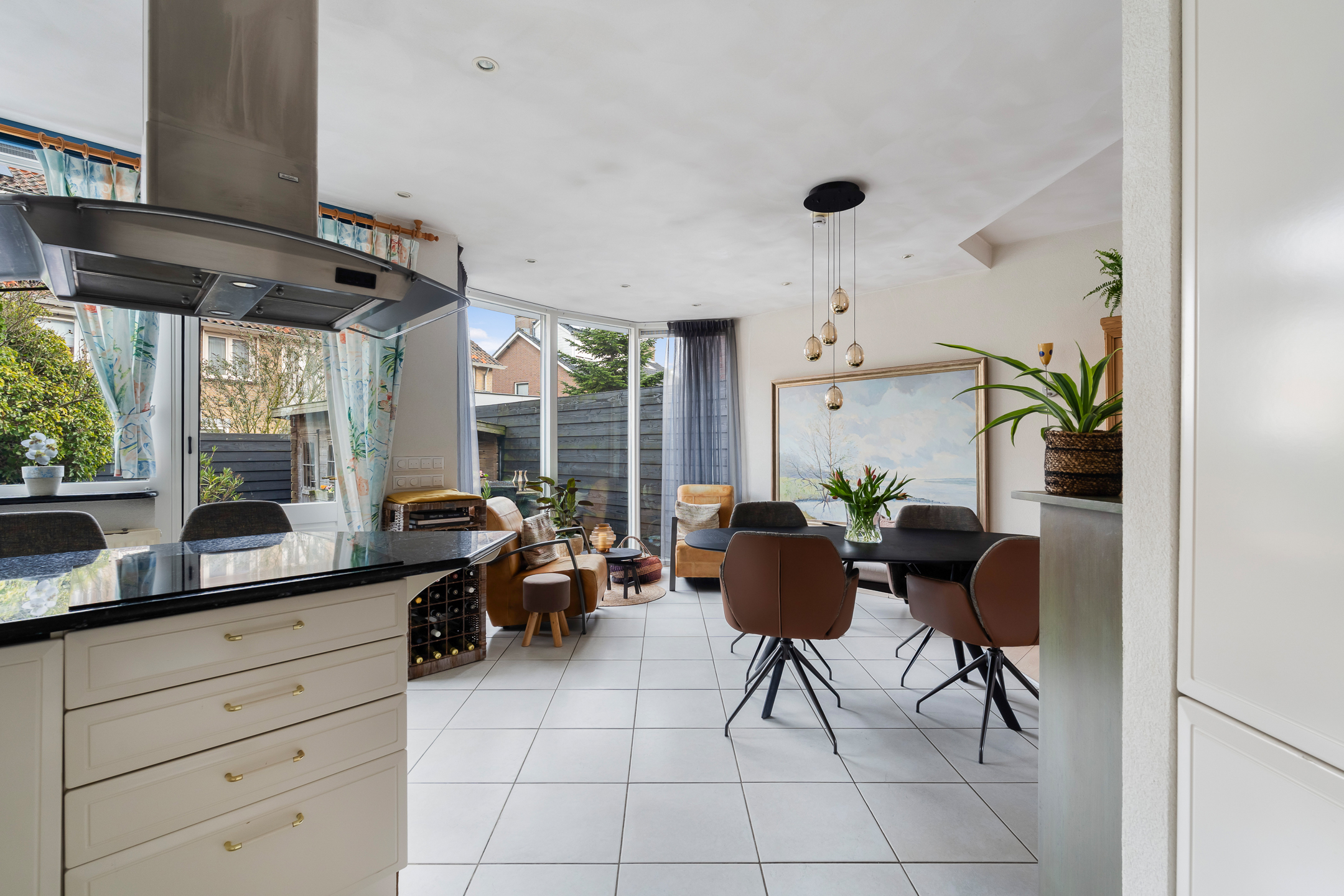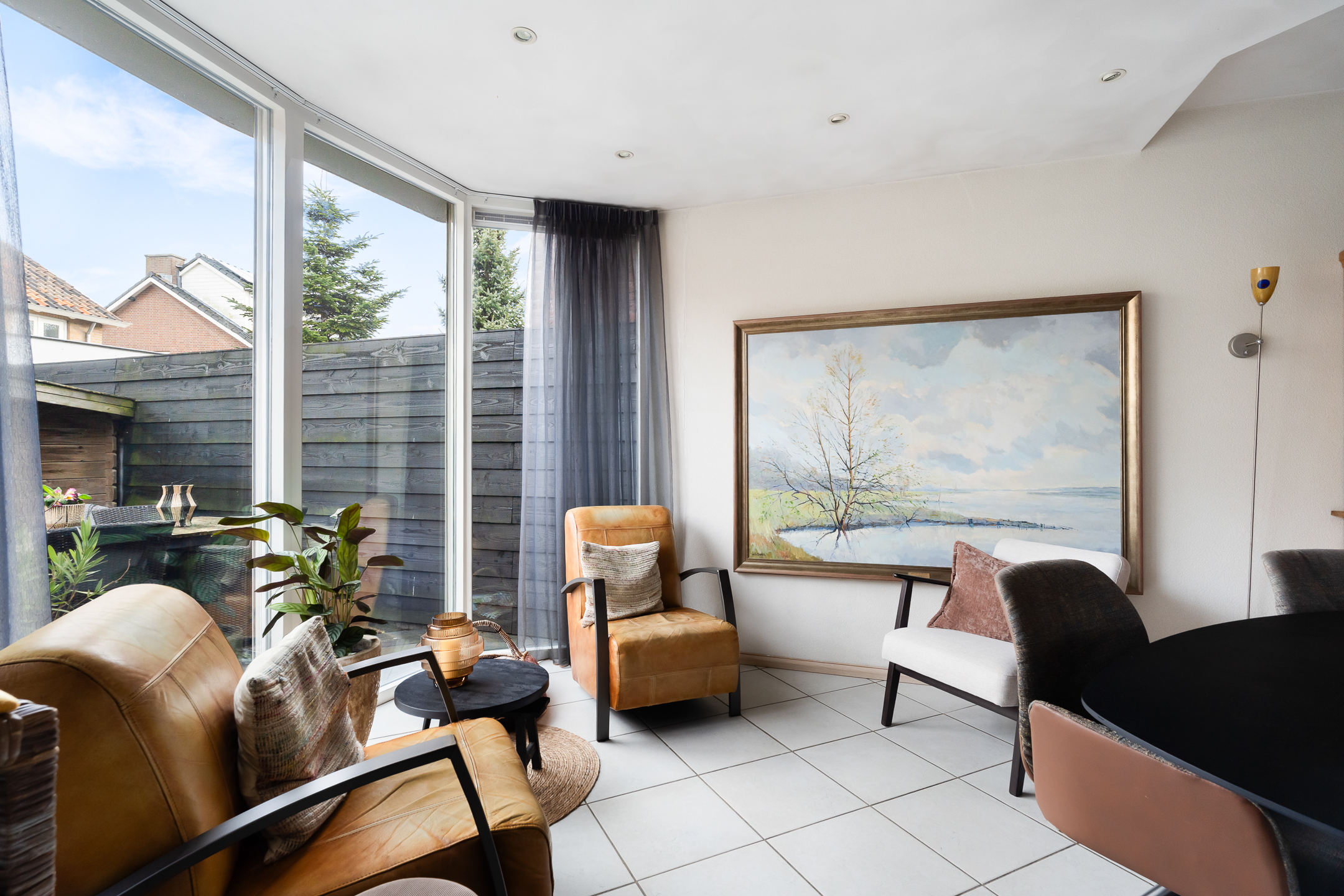 - Ruime uitbouw met natuurlijk lichtinval door de hoge ramen.