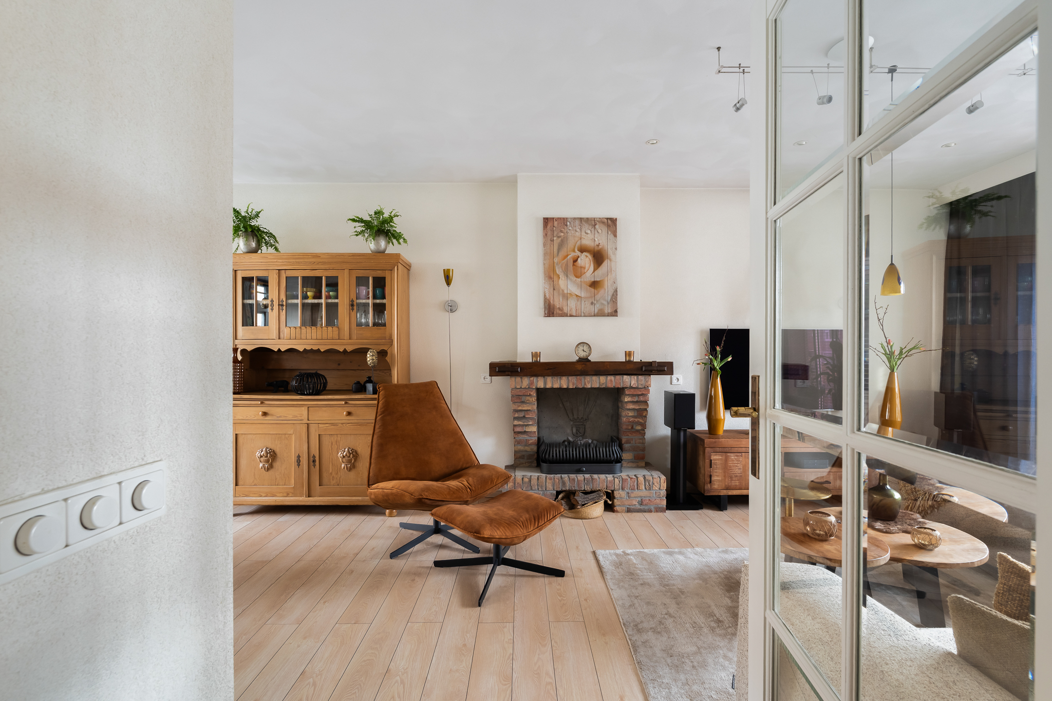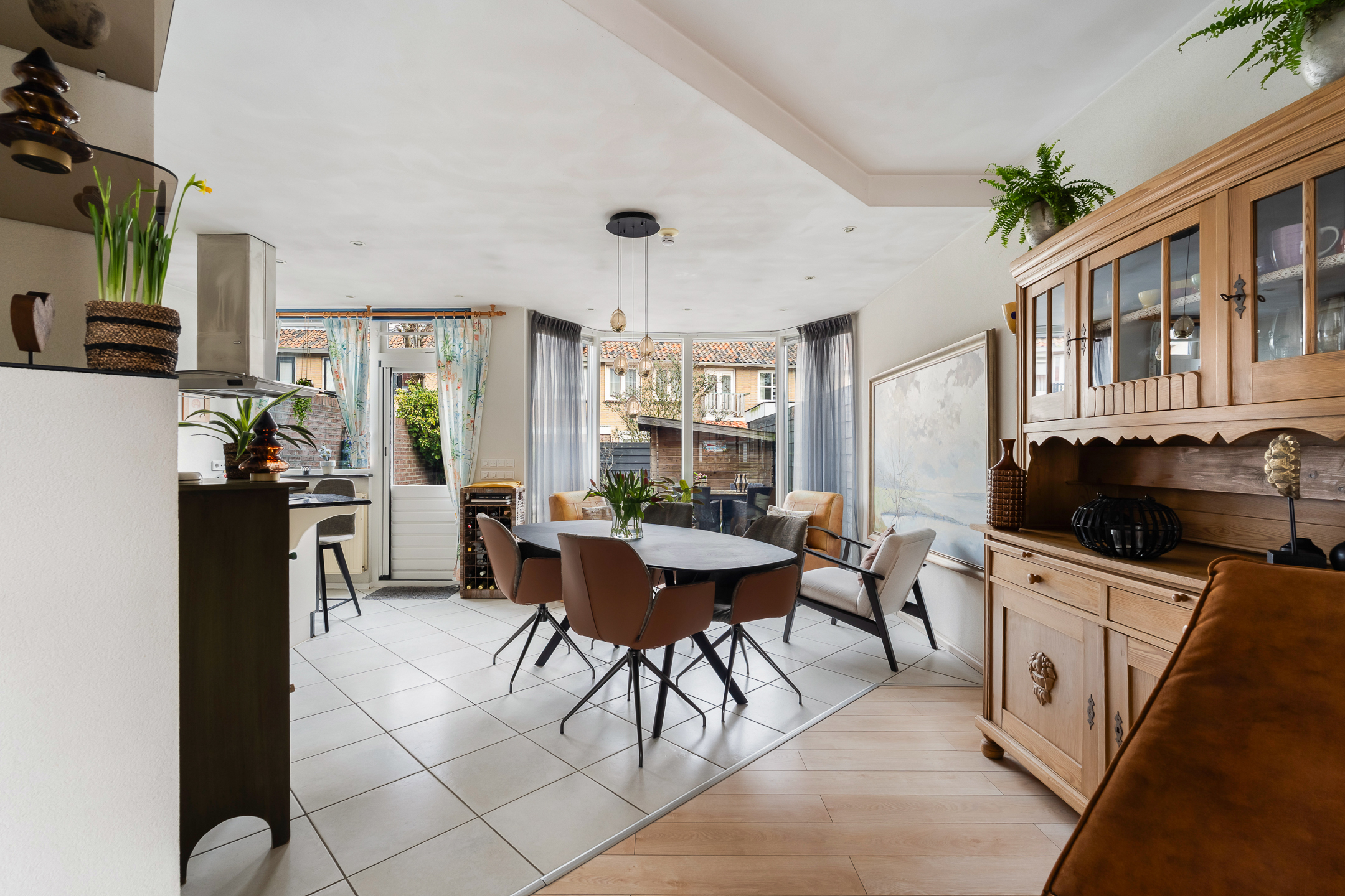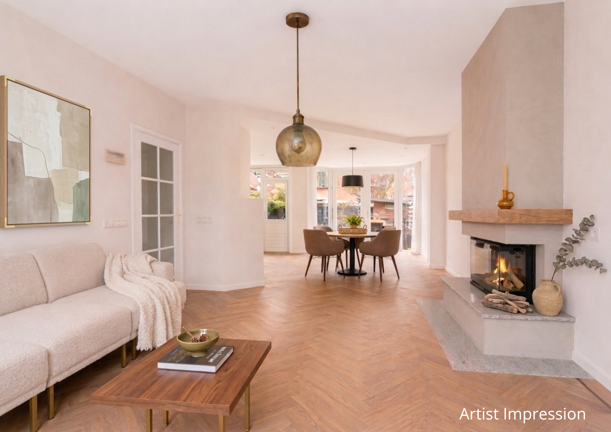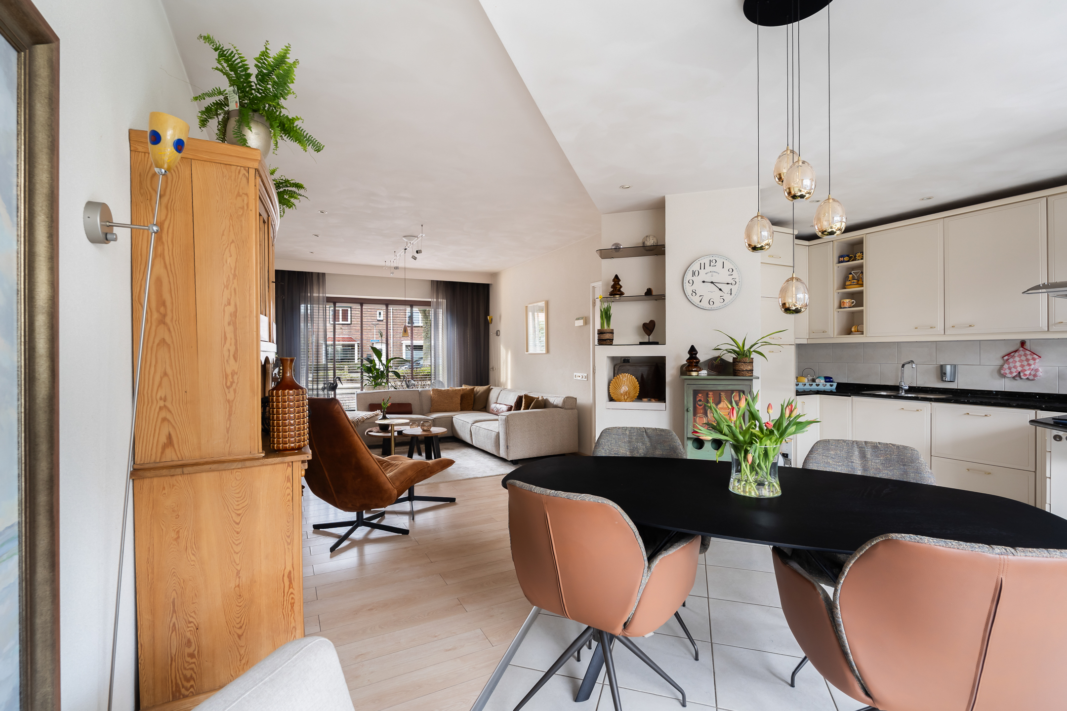 - Ruime uitbouw met natuurlijk lichtinval door de hoge ramen.