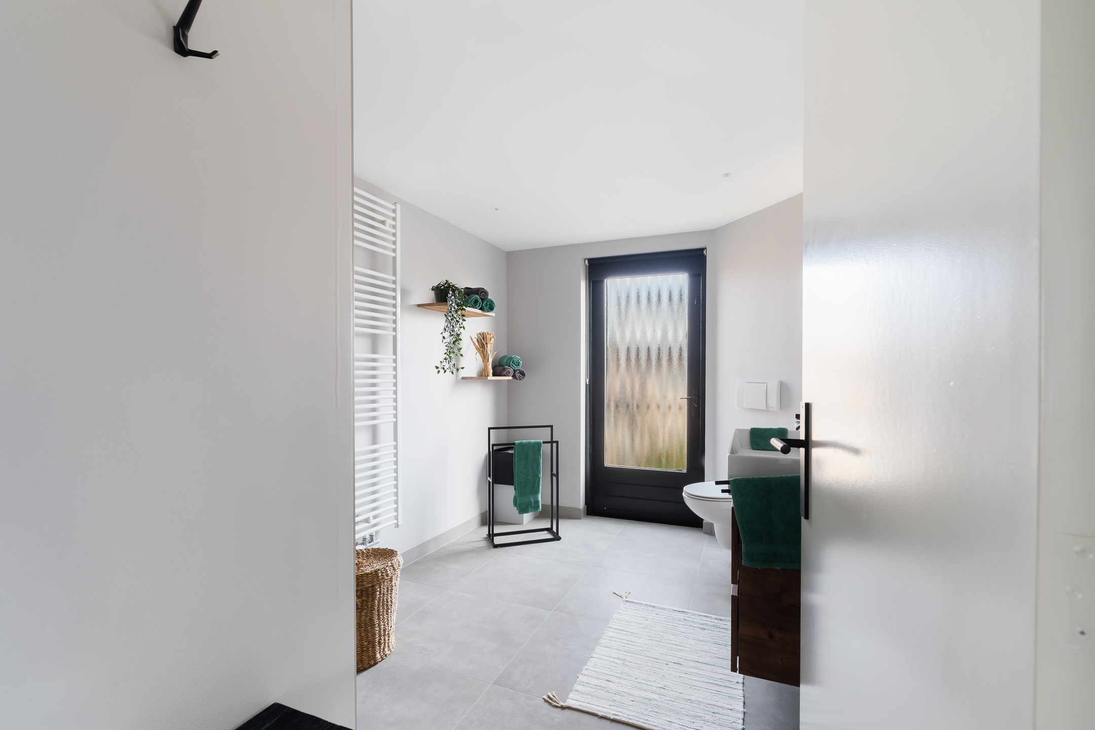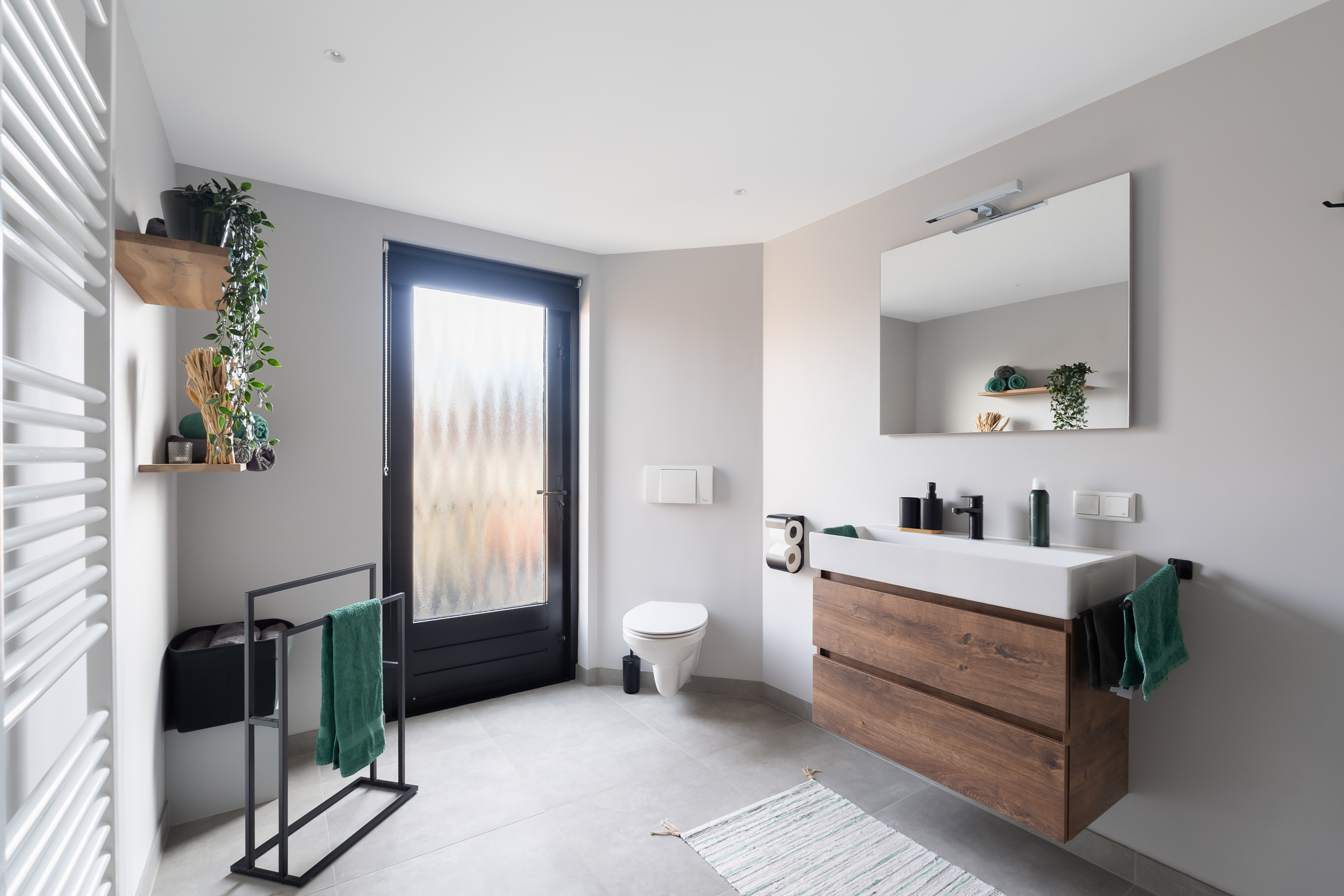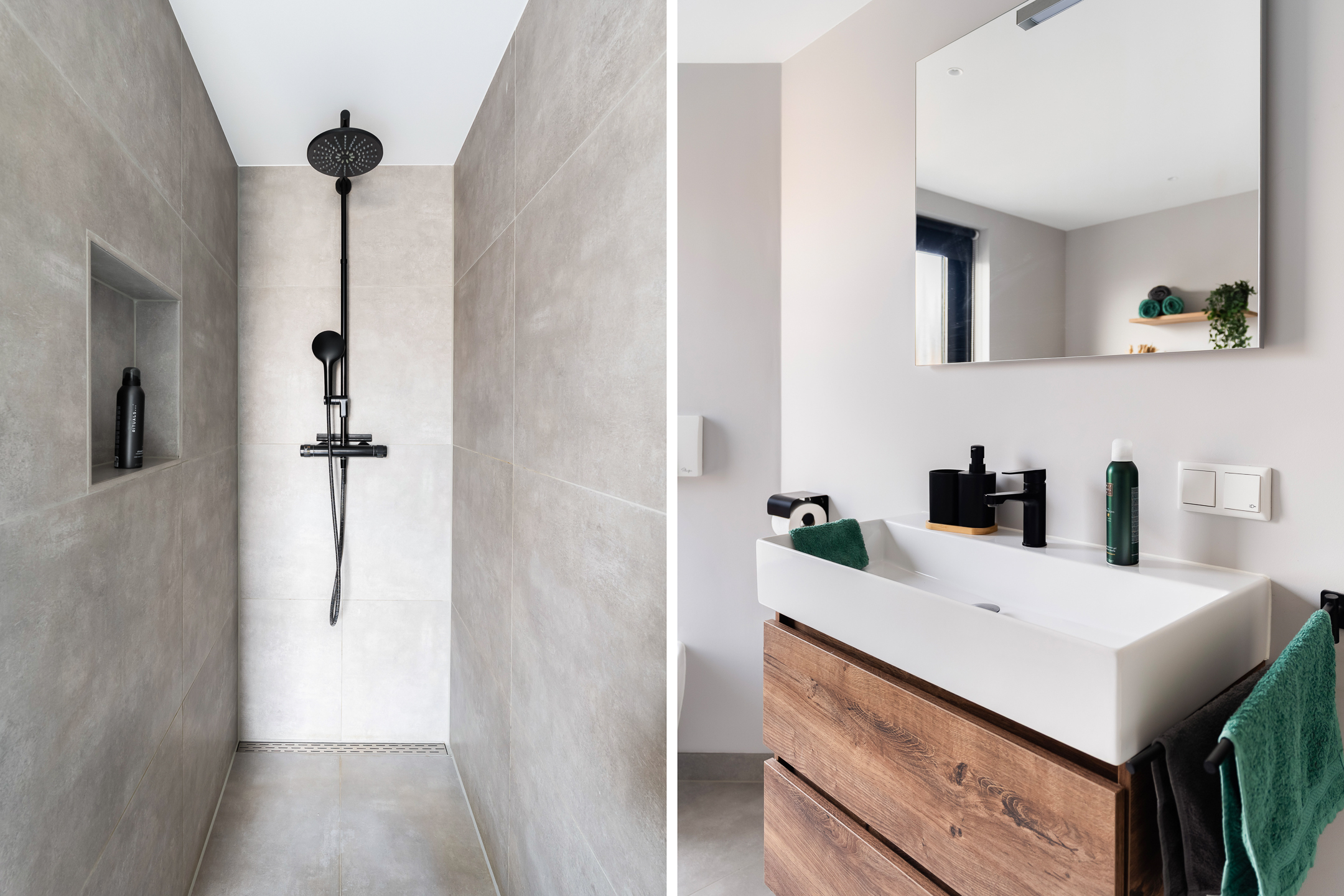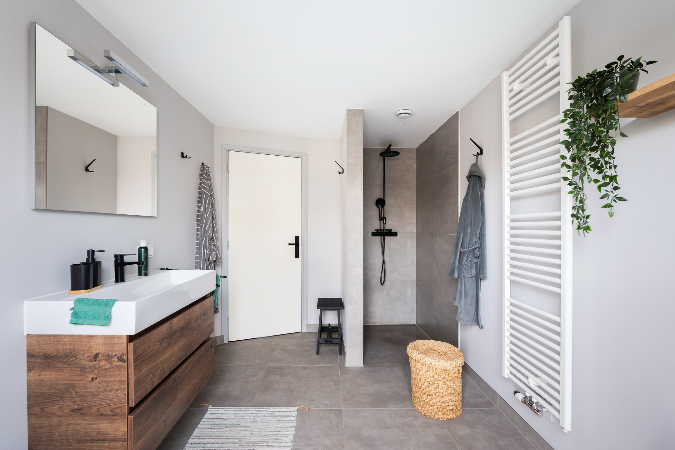 - Ruime badkamer (2023) ,met vloerverwarming, aan de achterzijde van de woning voorzien van inloopdouche, wastafelmeubel en toilet en toegang tot het balkon.