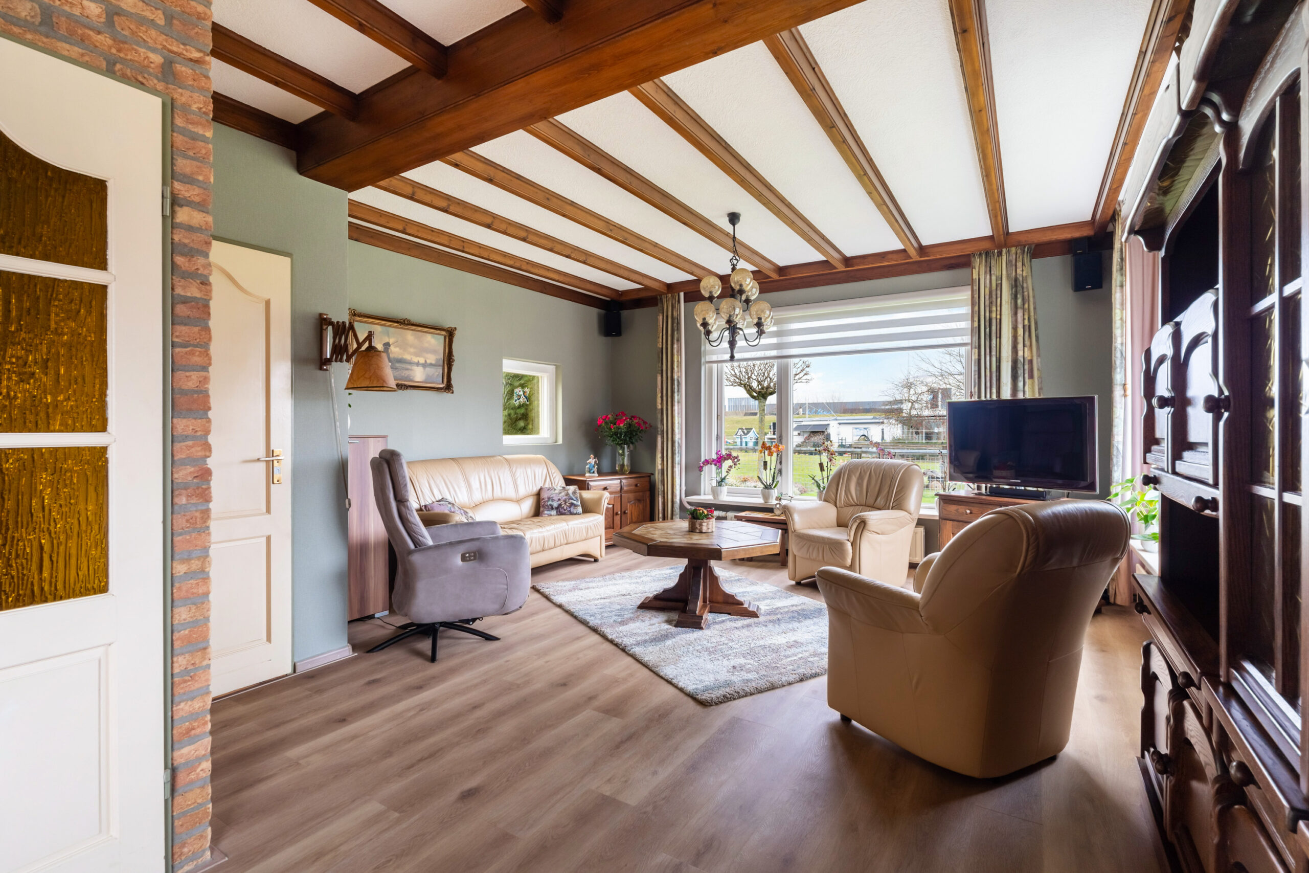 - Lichte woonkamer met rondom ramen en trapkast. De woonkamer is voorzien van elektrische vloerverwarming;