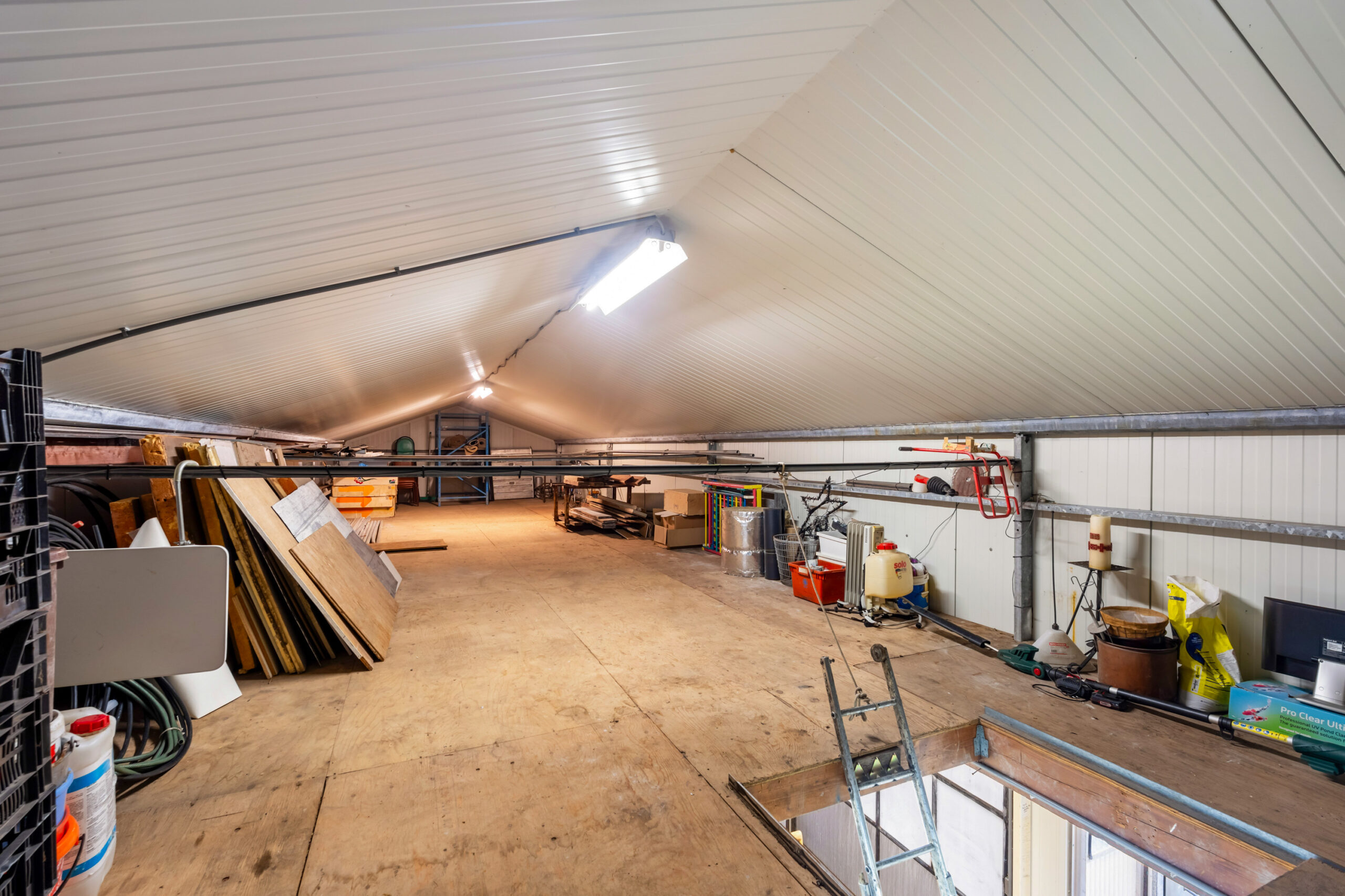 Aan de achterzijde bevindt zich een royale schuur/garage van maar liefst 159 m², verdeeld over twee verdiepingen en voorzien van een overkapping. De garage schuur is opgebouwd uit steen en sandwichplaten en is voorzien van een toilet. Deze multifunctionele ruimte biedt tal van mogelijkheden, zoals opslag, een werkplaats, het stallen van voertuigen of het combineren van wonen en werken aan huis.