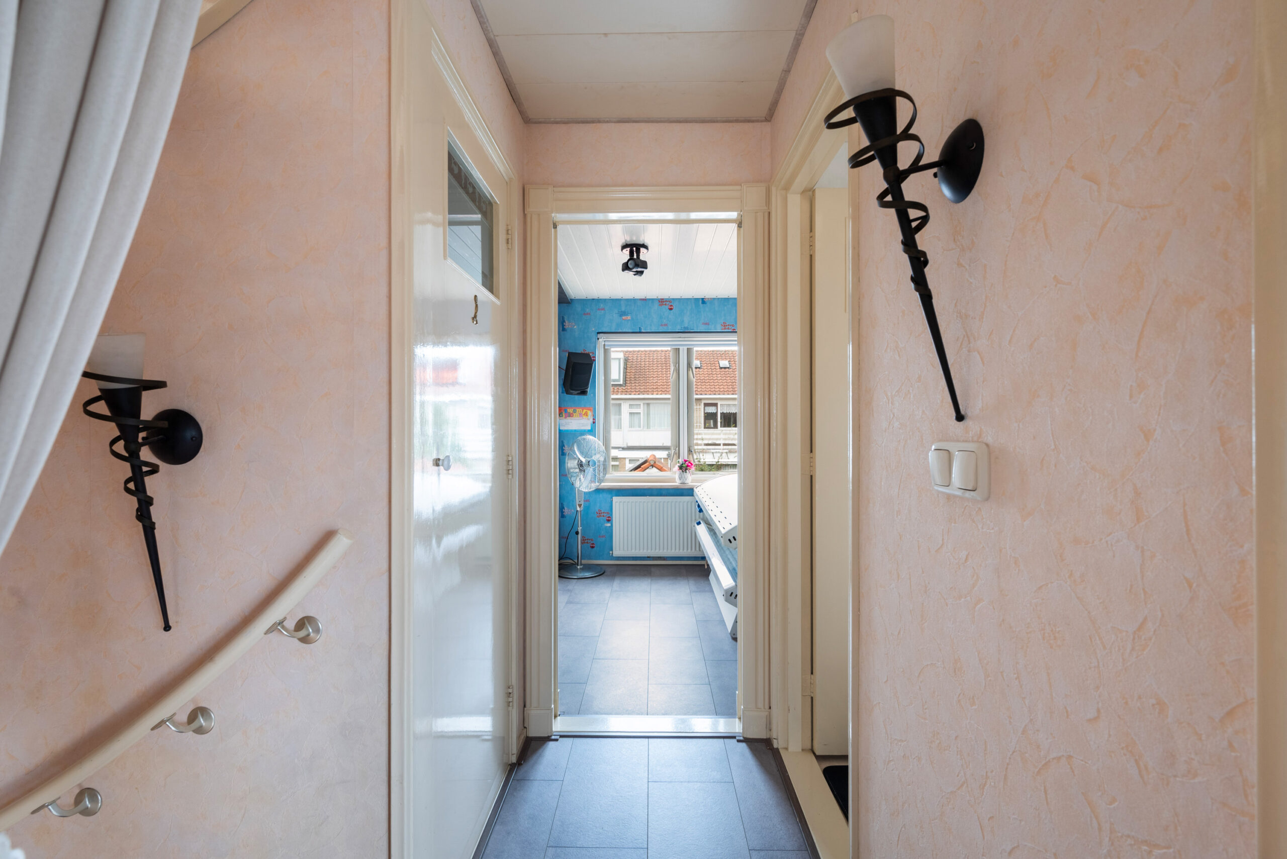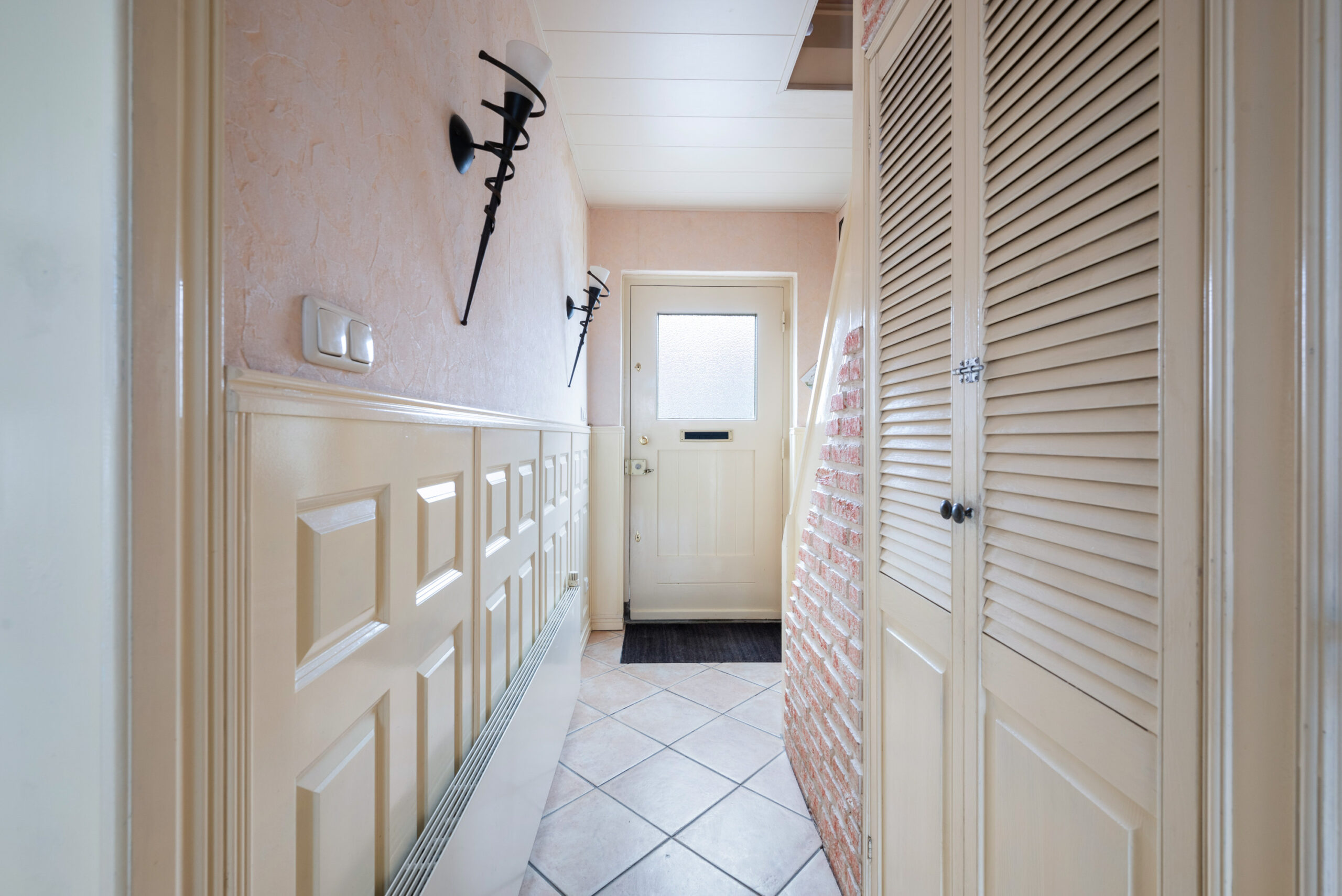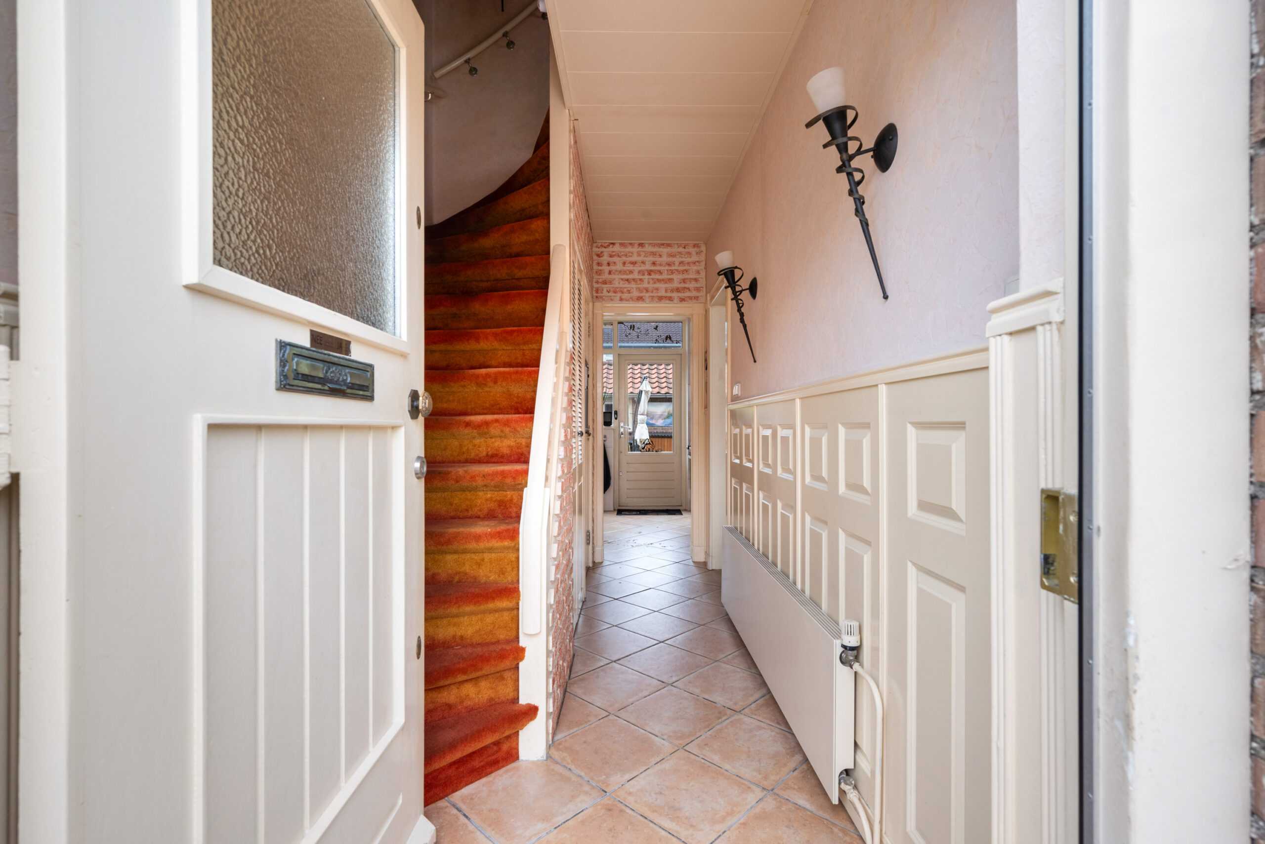 - Entree van de woning, hal met meterkast, trap naar de eerste verdieping, trapkast en toiletruimte;