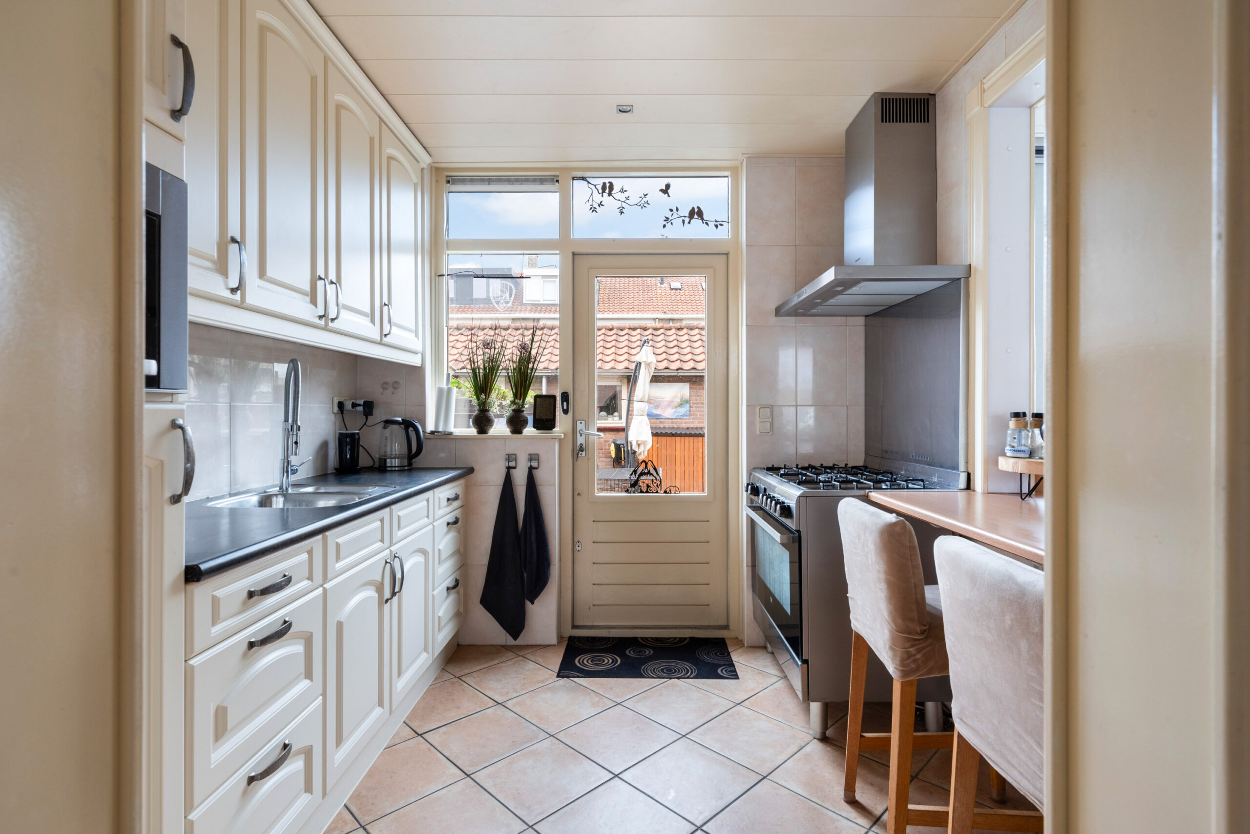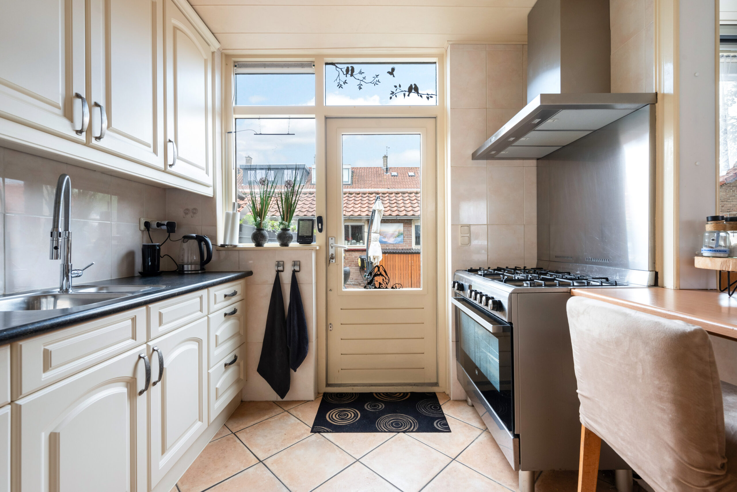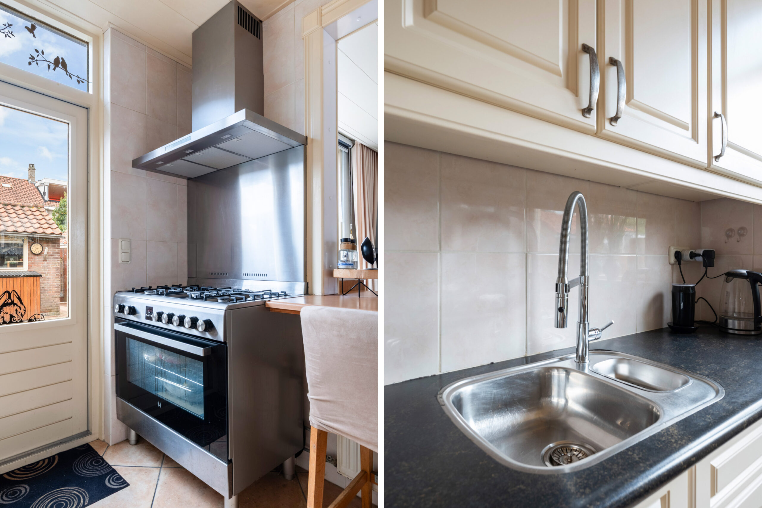 - De half open keuken bevindt zich aan de achterzijde van de woning en biedt via een deur toegang tot de achtertuin. De keuken is voorzien van een keukenblok in rechte opstelling en een bar met opening naar de woonkamer. De keuken is in 2017 geplaatst en voorzien van diverse inbouwapparatuur, waaronder een koelkast met vriesvak (2021), gasfornuis met oven (2021), afzuigkap (2025) en magnetron;