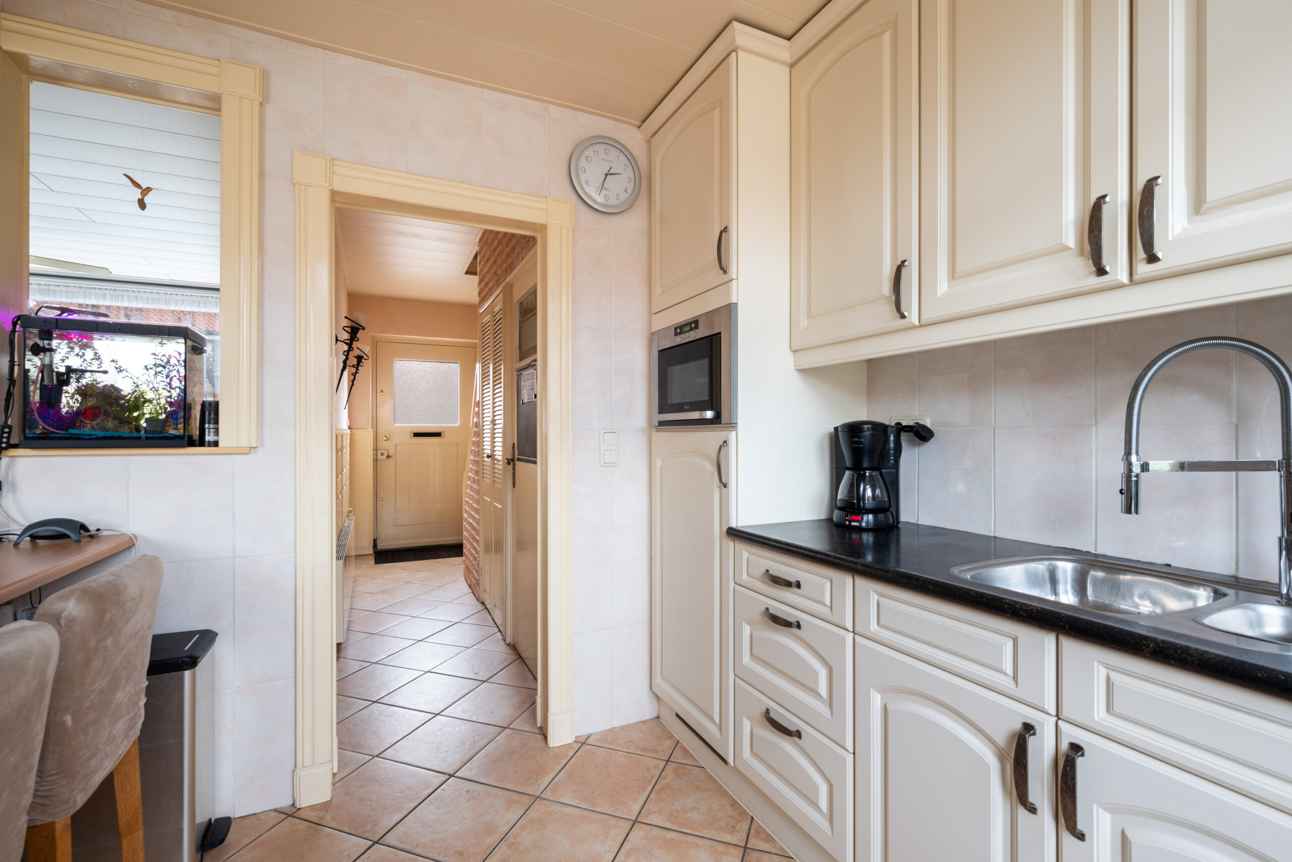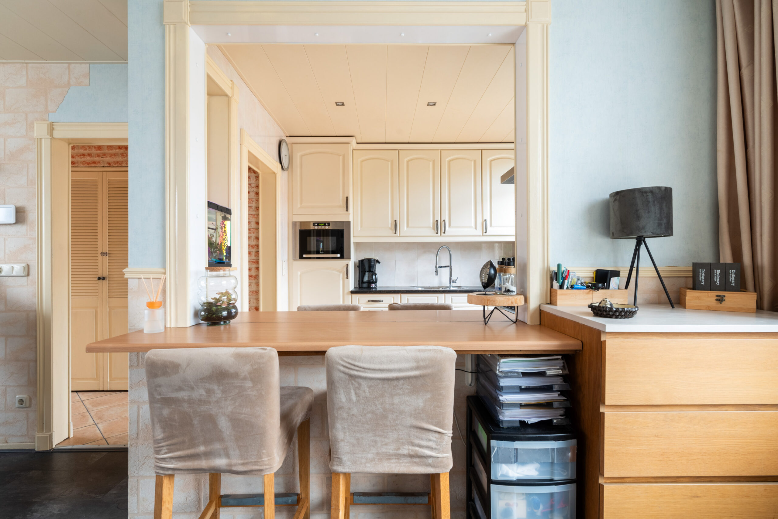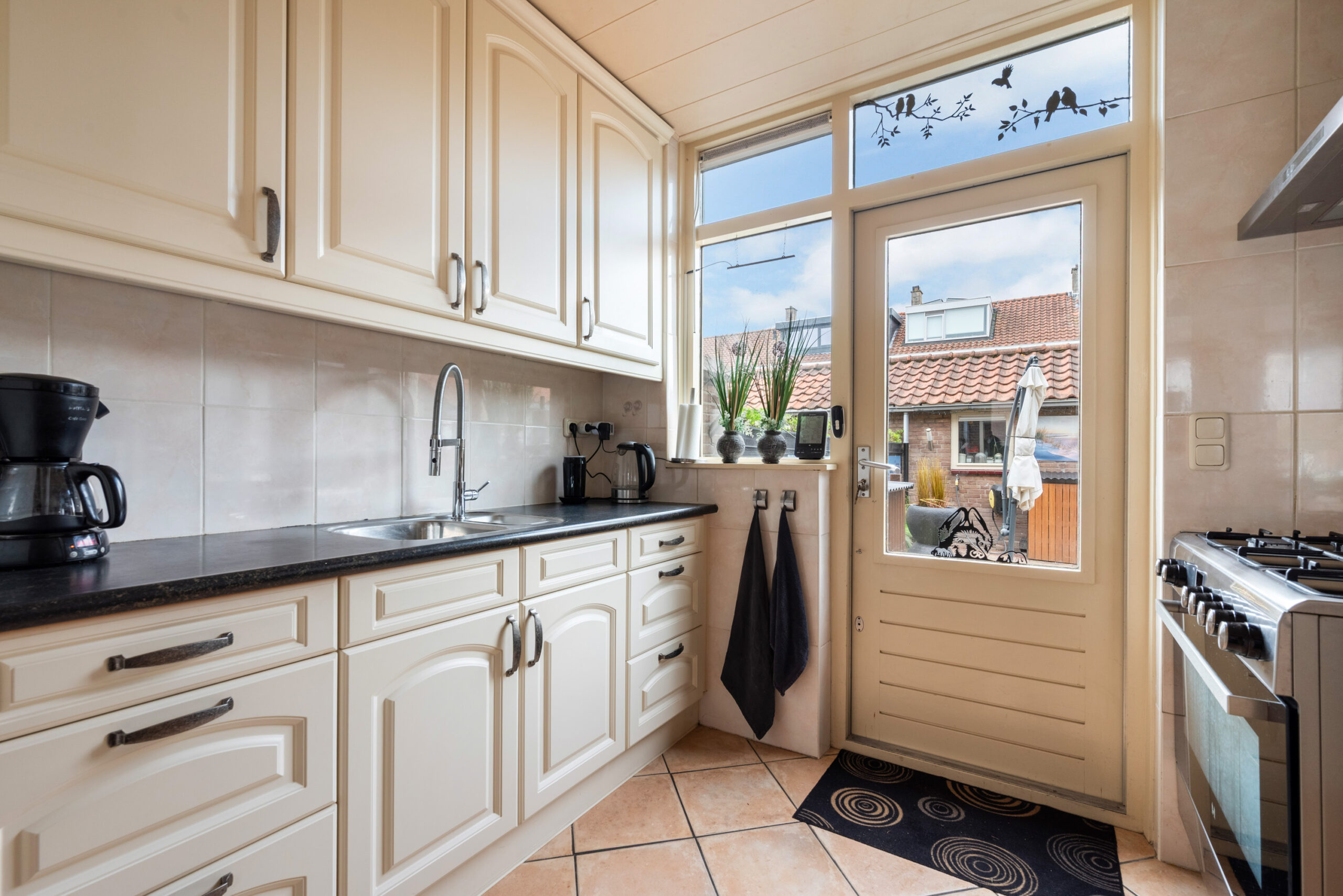 - De half open keuken bevindt zich aan de achterzijde van de woning en biedt via een deur toegang tot de achtertuin. De keuken is voorzien van een keukenblok in rechte opstelling en een bar met opening naar de woonkamer. De keuken is in 2017 geplaatst en voorzien van diverse inbouwapparatuur, waaronder een koelkast met vriesvak (2021), gasfornuis met oven (2021), afzuigkap (2025) en magnetron;