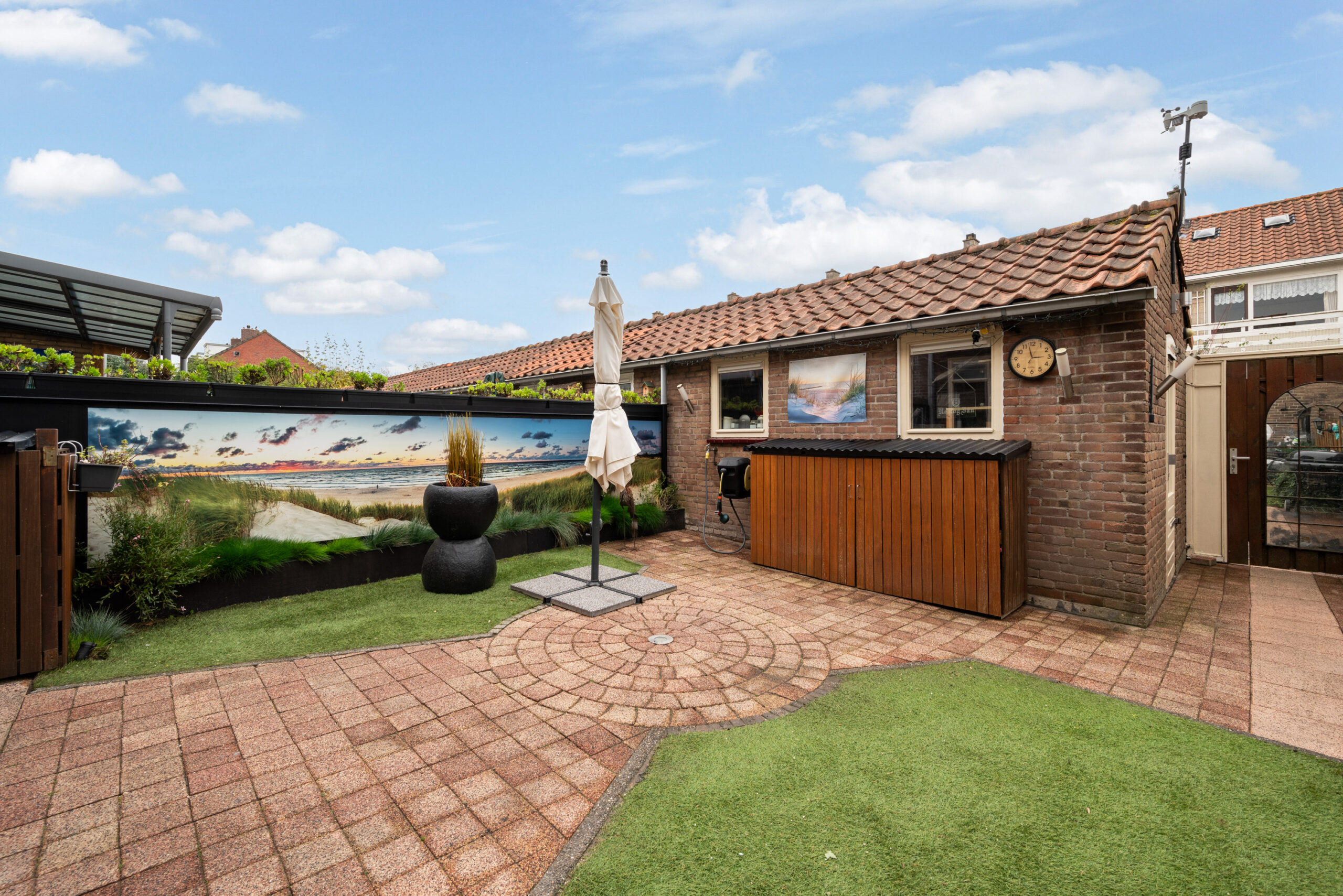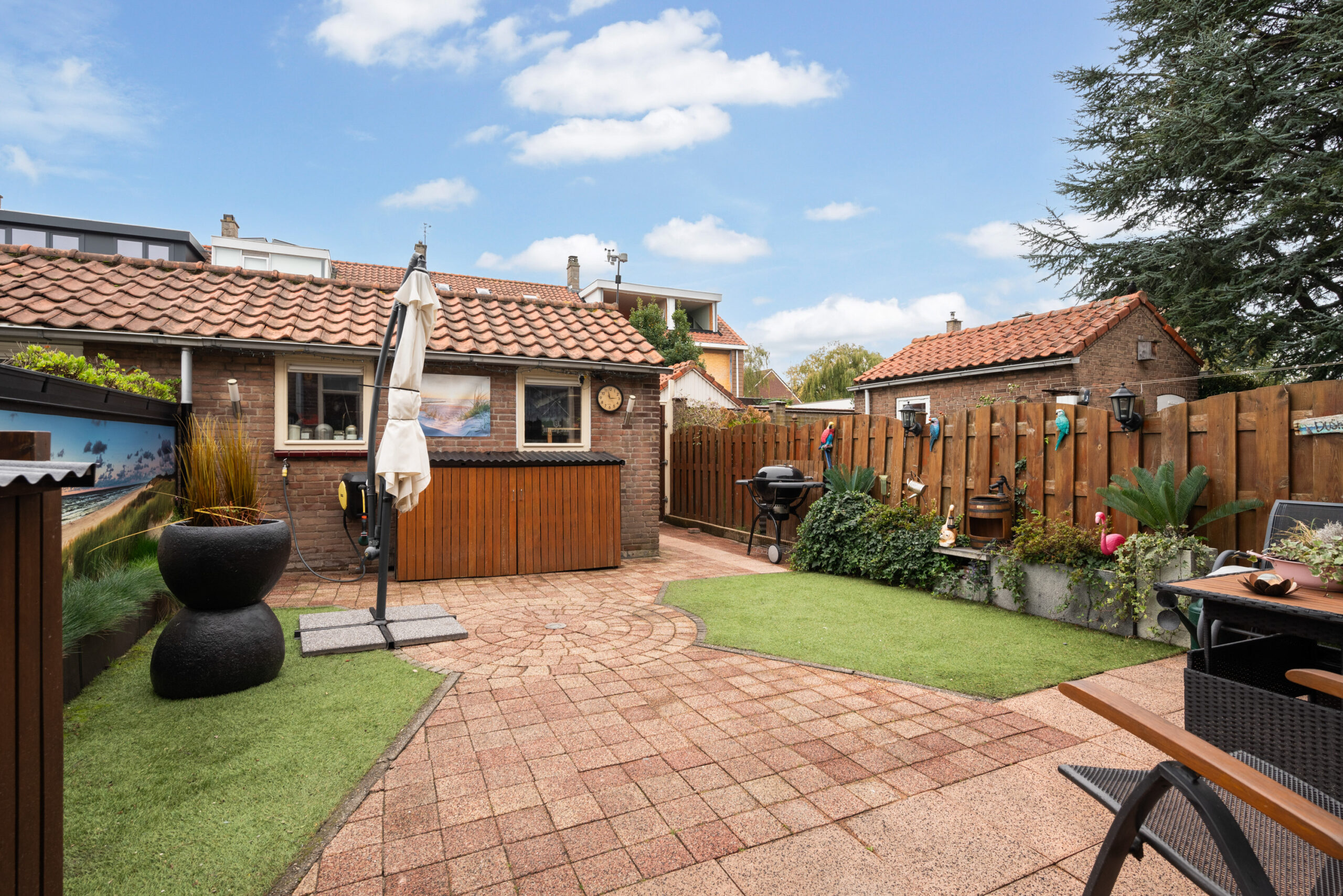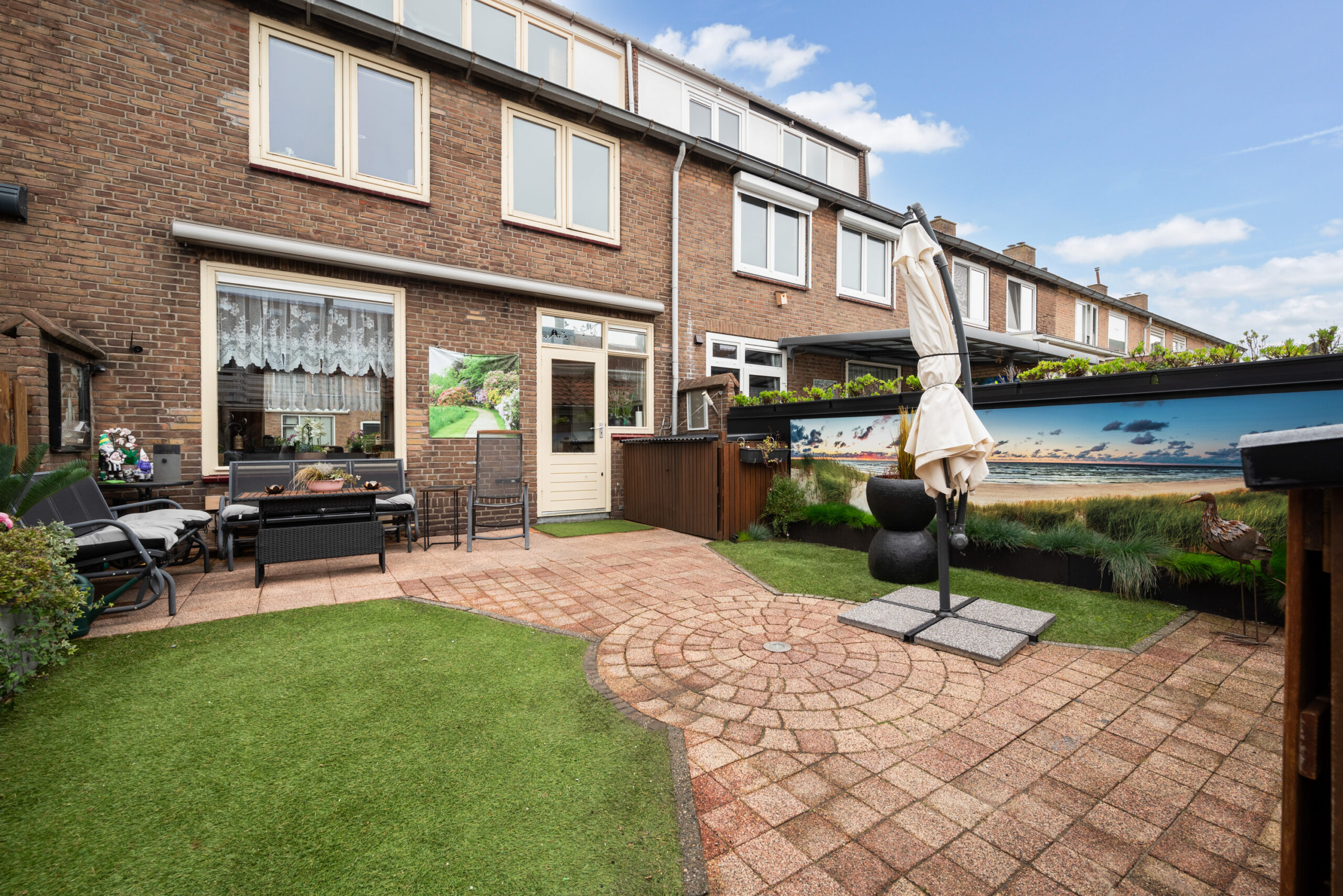 - De zonnige achtertuin is gelegen op het westen, waardoor je hier volop van de zon kunt genieten. De achtertuin is verzorgd aangelegd met kunstgras en sierbestrating en beschikt over een zeer ruime vrijstaande stenen berging (ca. 3,10 x 4,16 m) met elektra en een achterom. In de tuin bevindt zich een nette opbergkast om de containers uit het zicht te kunnen plaatsen. De achtergevel is voorzien van een elektrisch zonnescherm (2025) met verlichting;