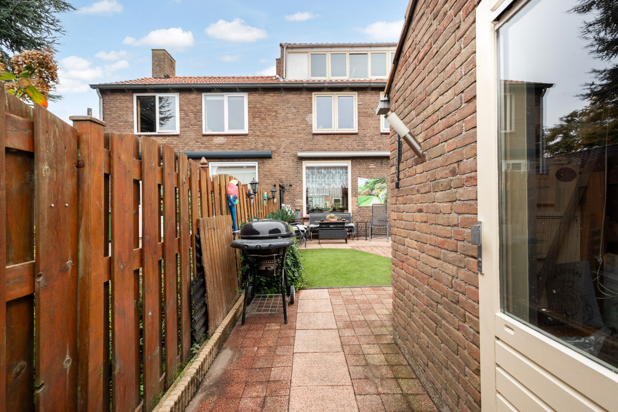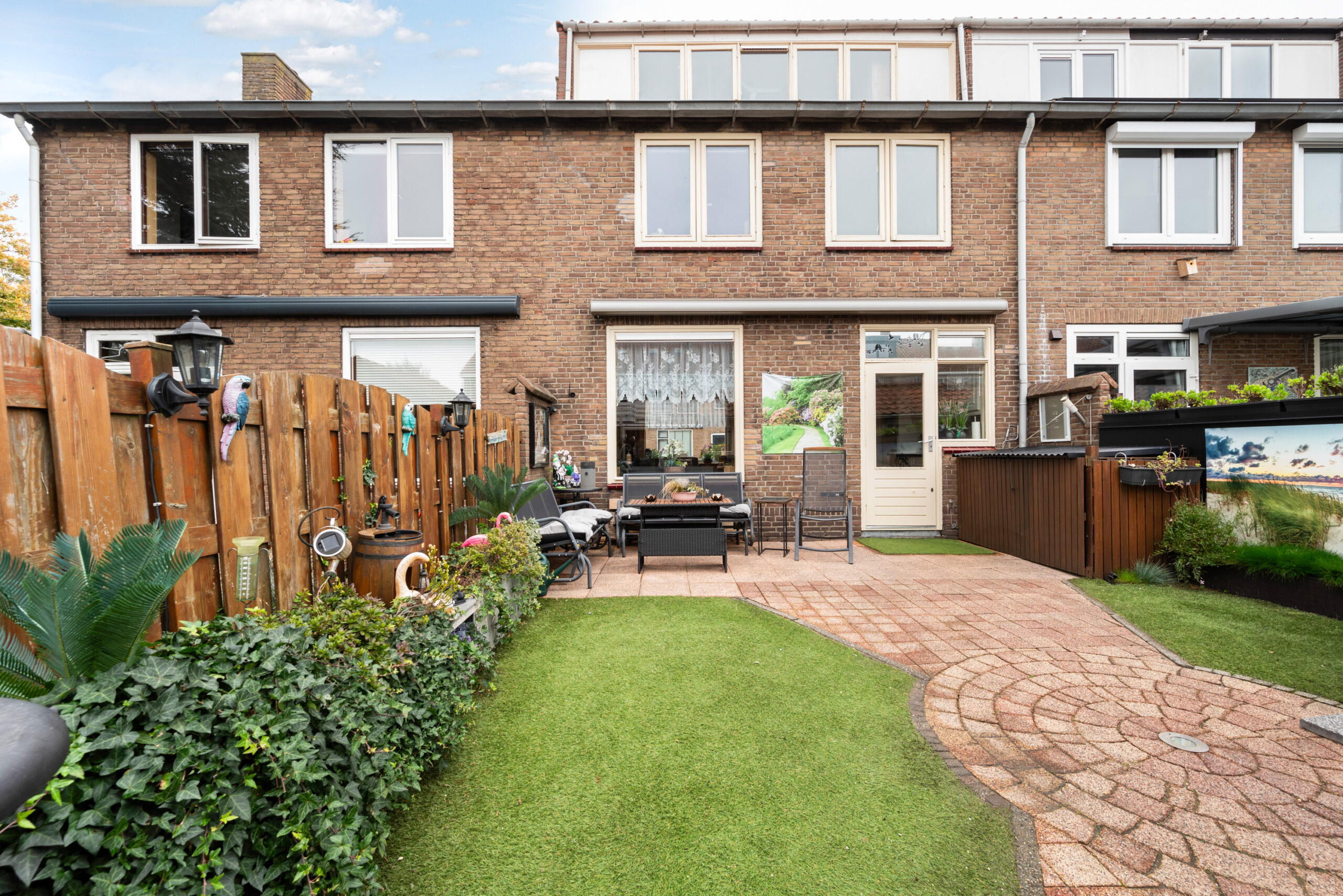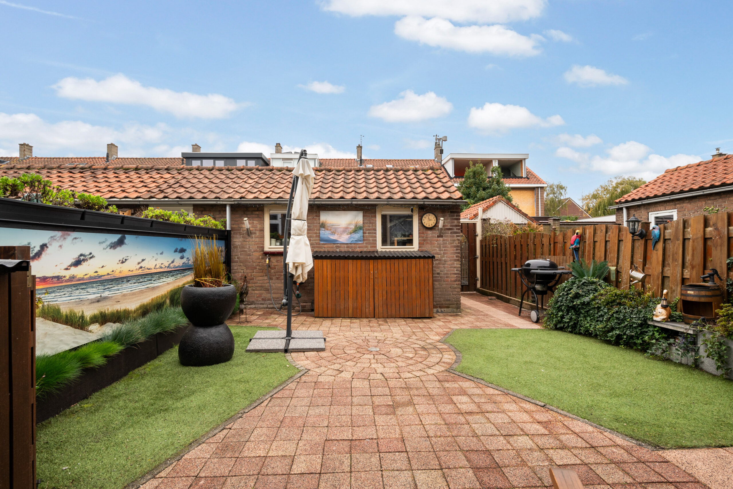 - De zonnige achtertuin is gelegen op het westen, waardoor je hier volop van de zon kunt genieten. De achtertuin is verzorgd aangelegd met kunstgras en sierbestrating en beschikt over een zeer ruime vrijstaande stenen berging (ca. 3,10 x 4,16 m) met elektra en een achterom. In de tuin bevindt zich een nette opbergkast om de containers uit het zicht te kunnen plaatsen. De achtergevel is voorzien van een elektrisch zonnescherm (2025) met verlichting;