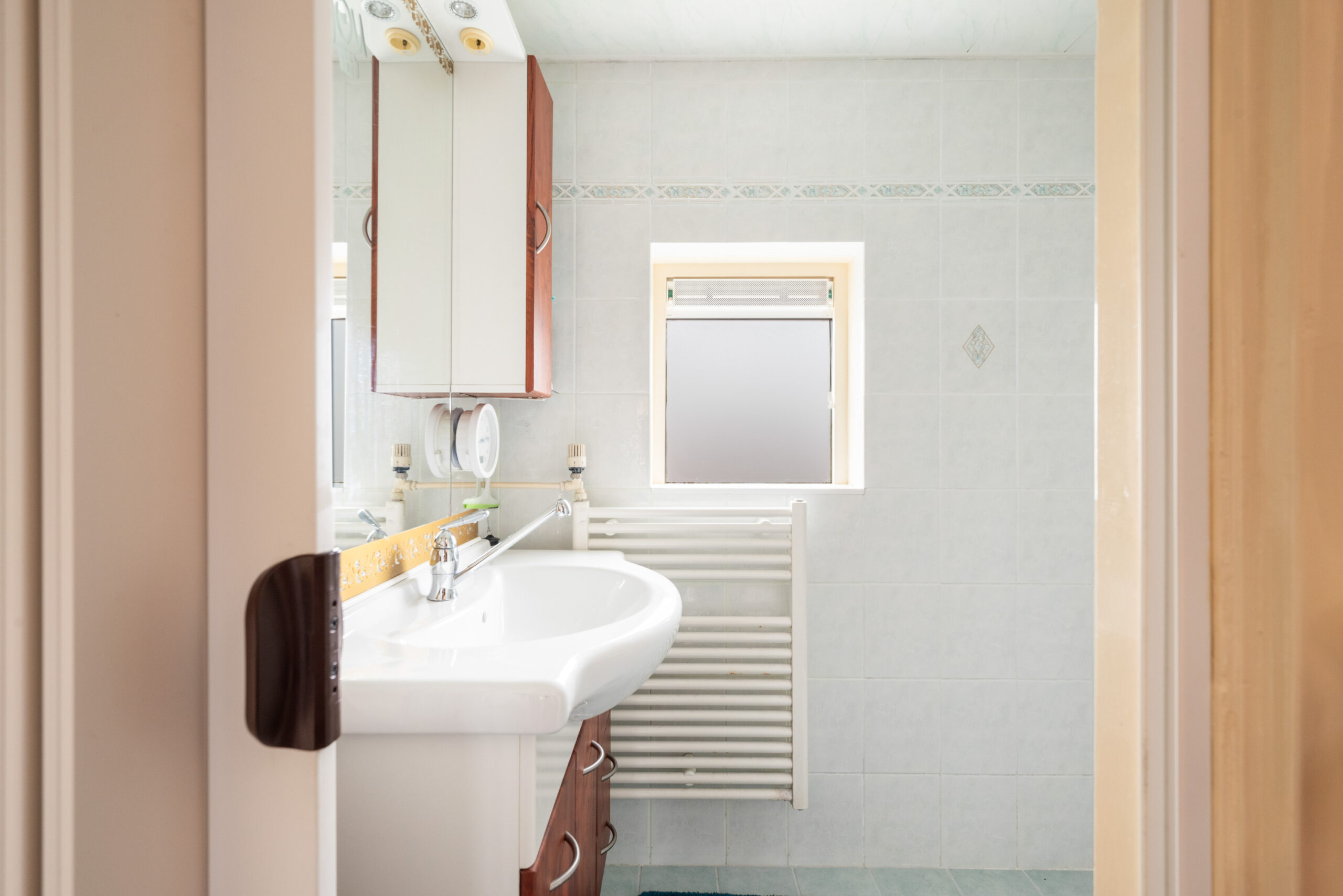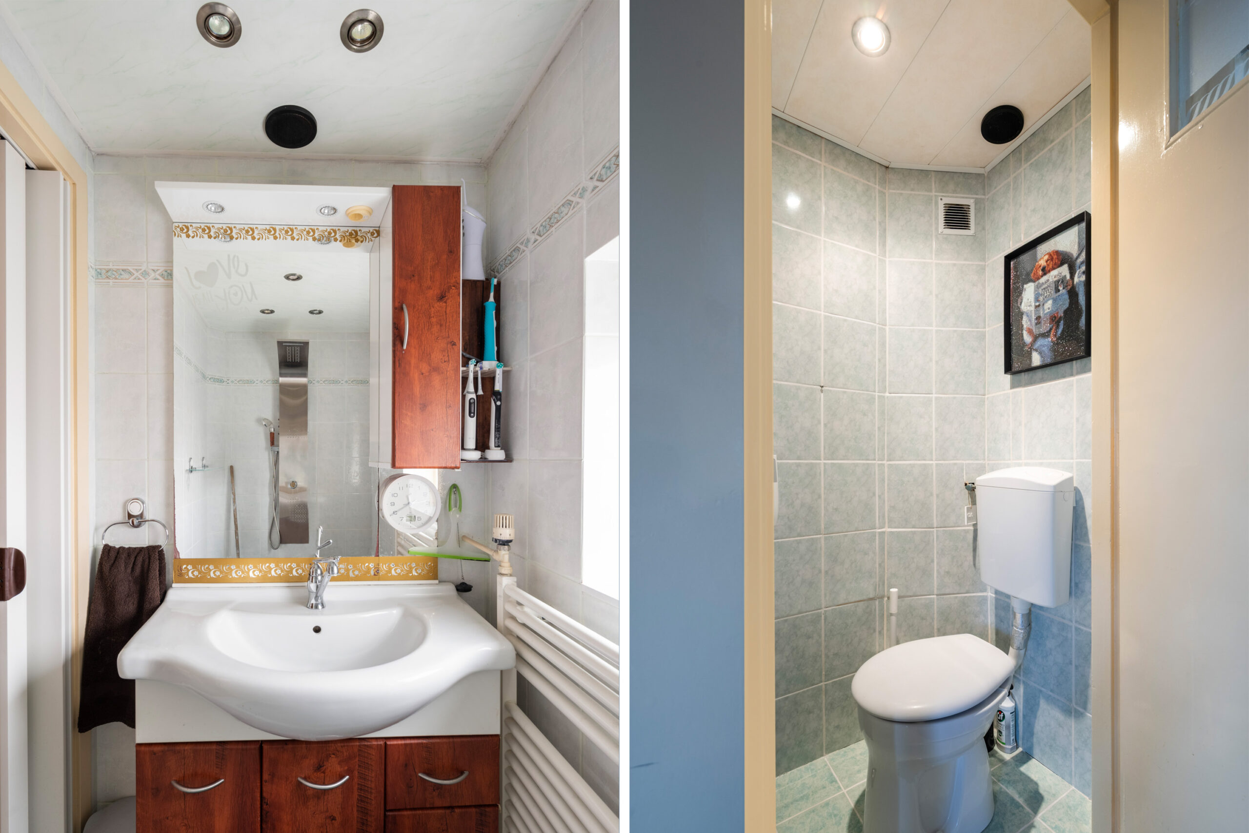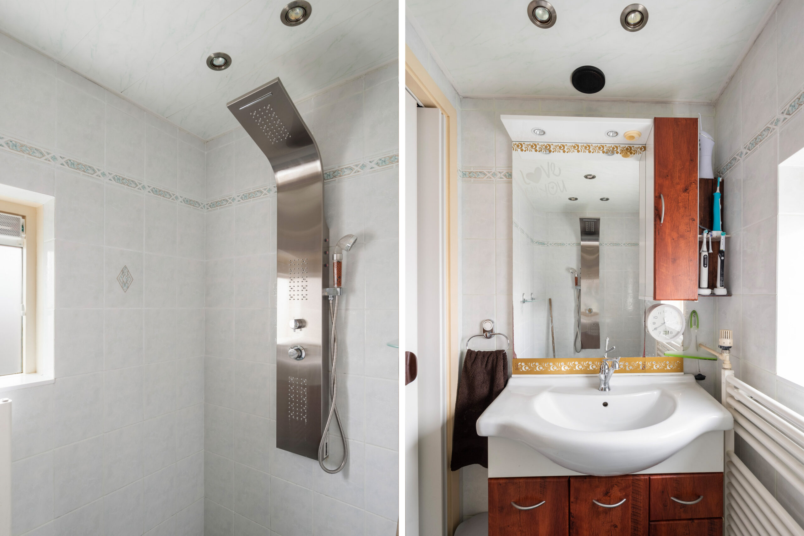 - De badkamer aan de voorzijde is voorzien van een douche, wastafelmeubel, designradiator en raam;