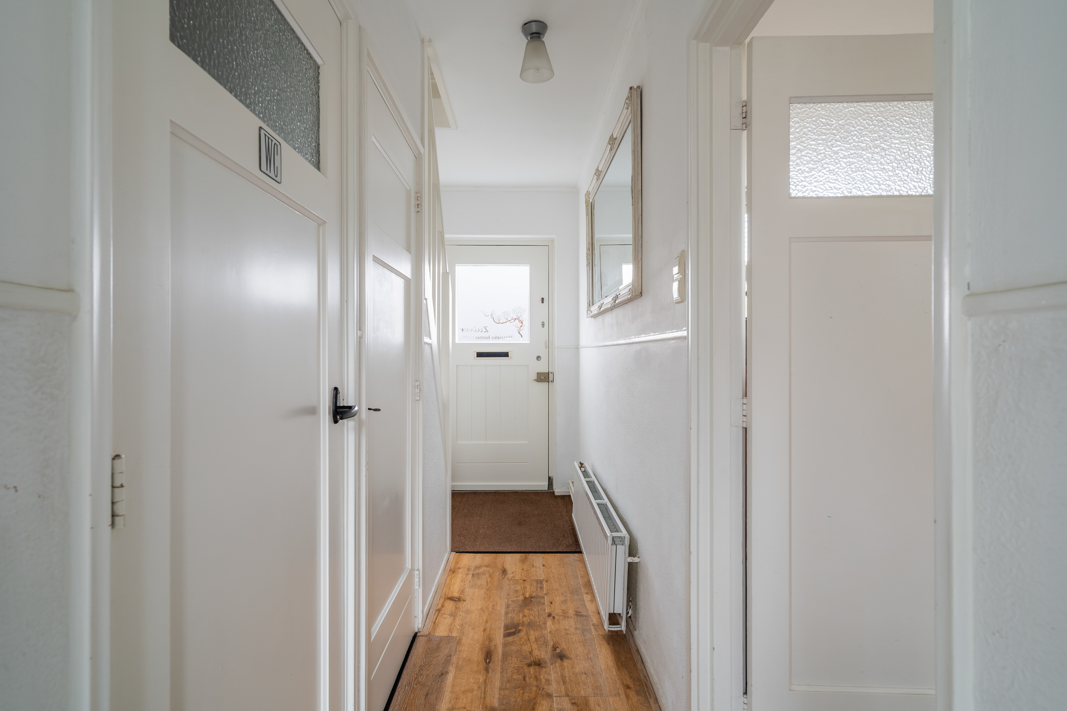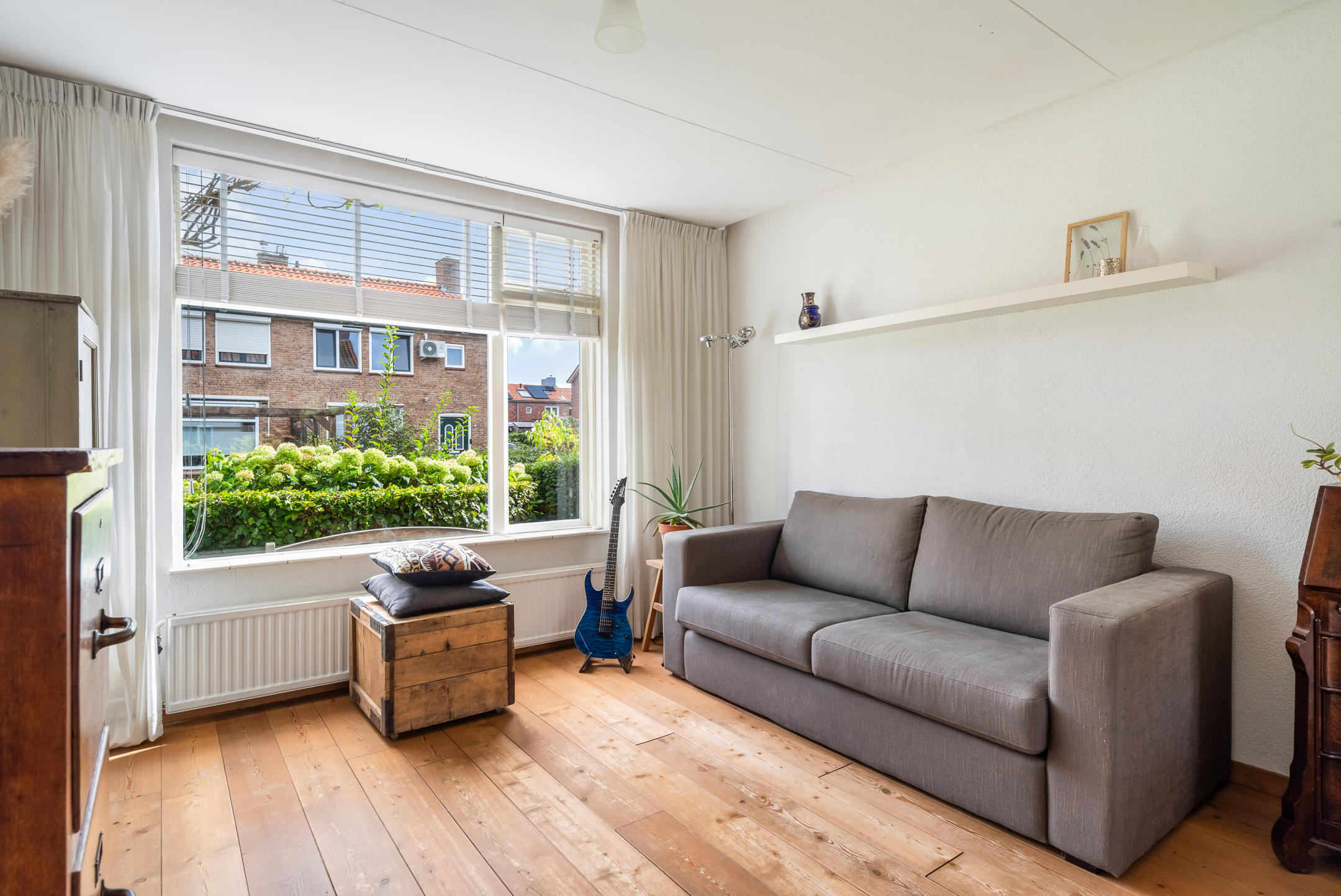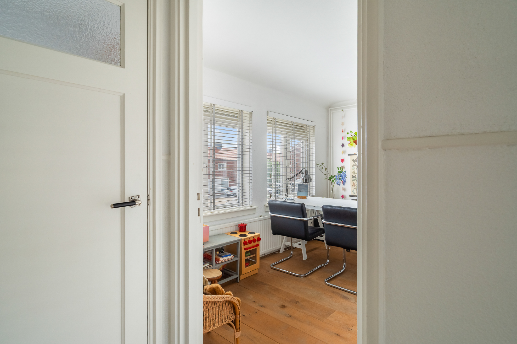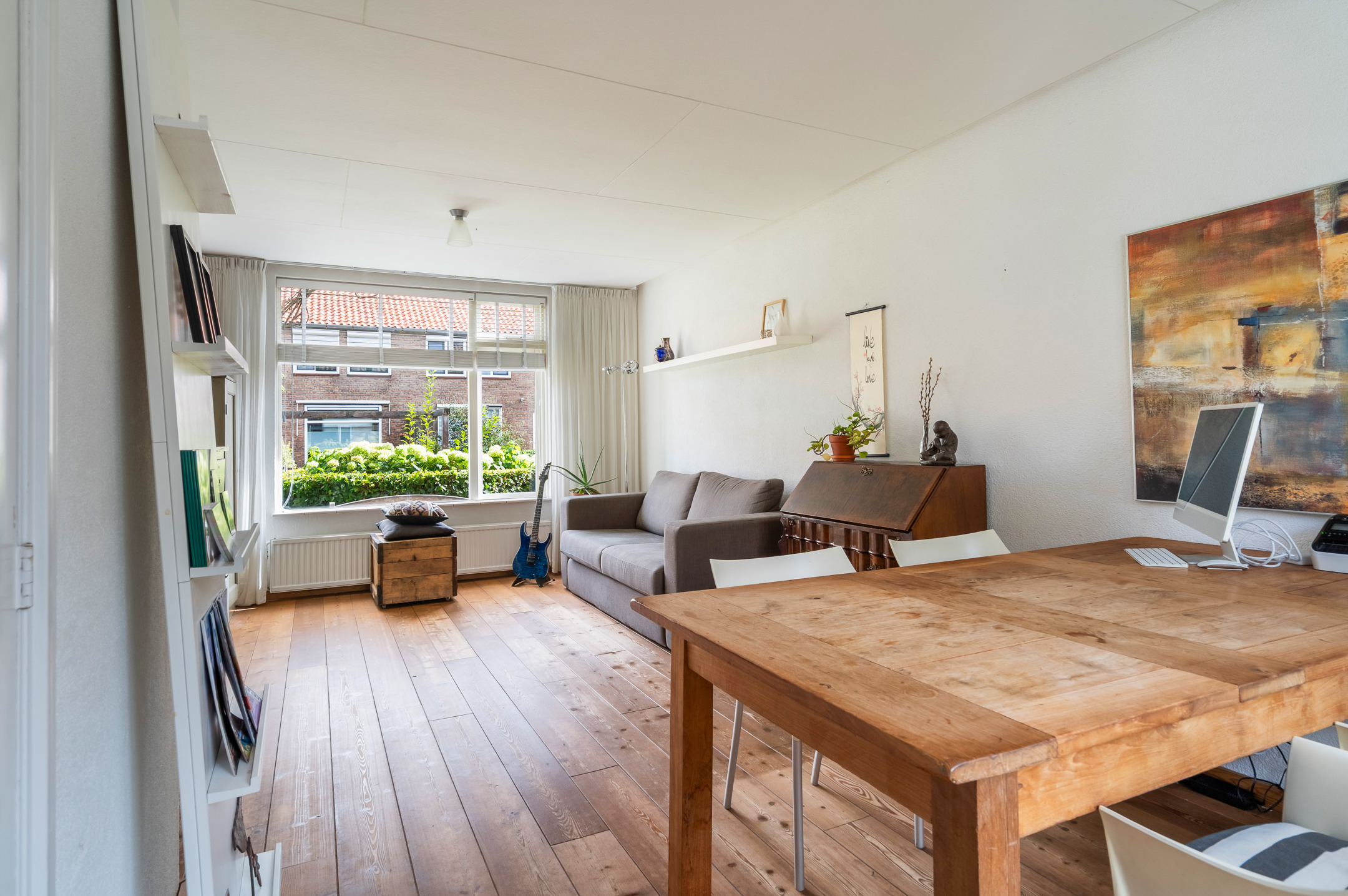 De woning beschikt over een lichte woonkamer met openslaande deuren naar de achtertuin, die is gelegen op het zuidwesten. Verder vindt u een dichte keuken en twee ruime slaapkamers. De karakteristieke jaren ’30 paneeldeuren en houten vloeren geven de woning extra charme en sfeer.