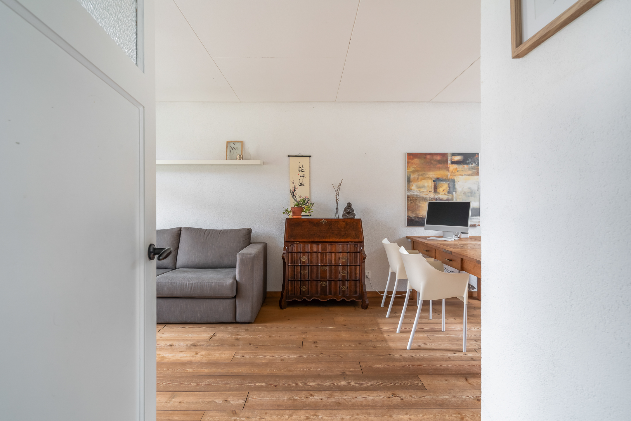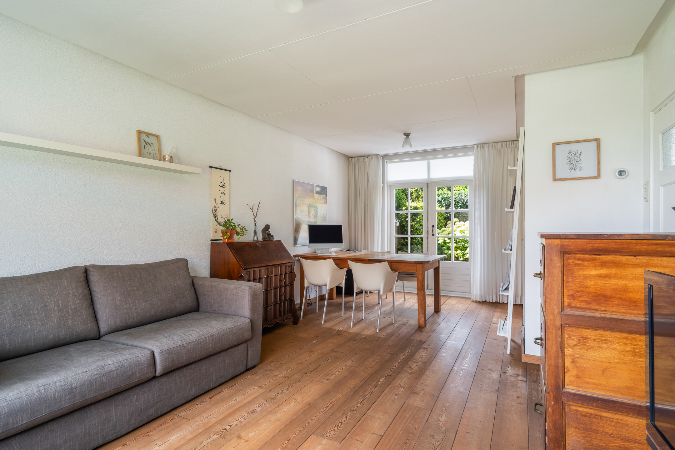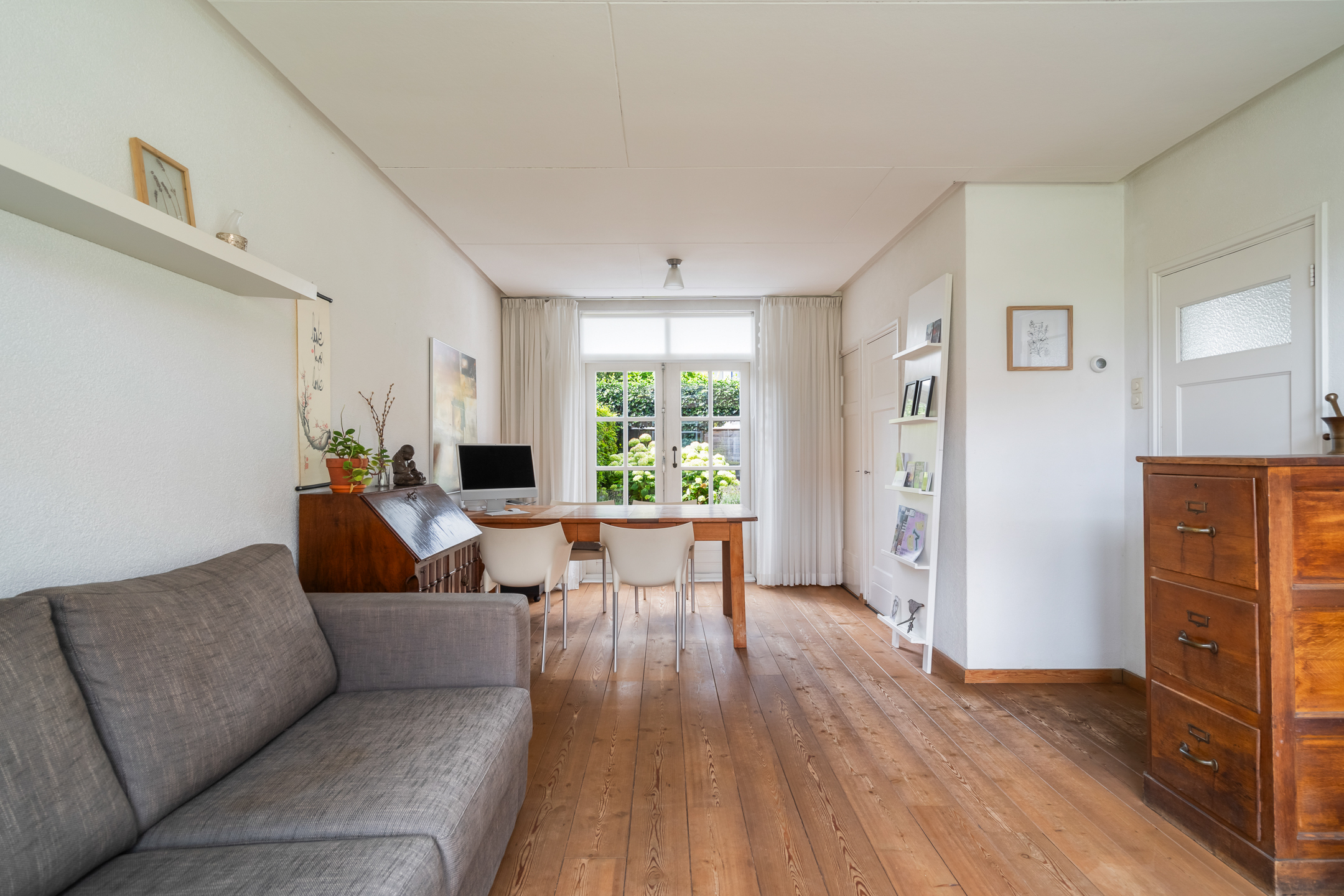 - Lichte doorzonwoonkamer met houten vloer, vaste kast en openslaande deuren naar de achtertuin;