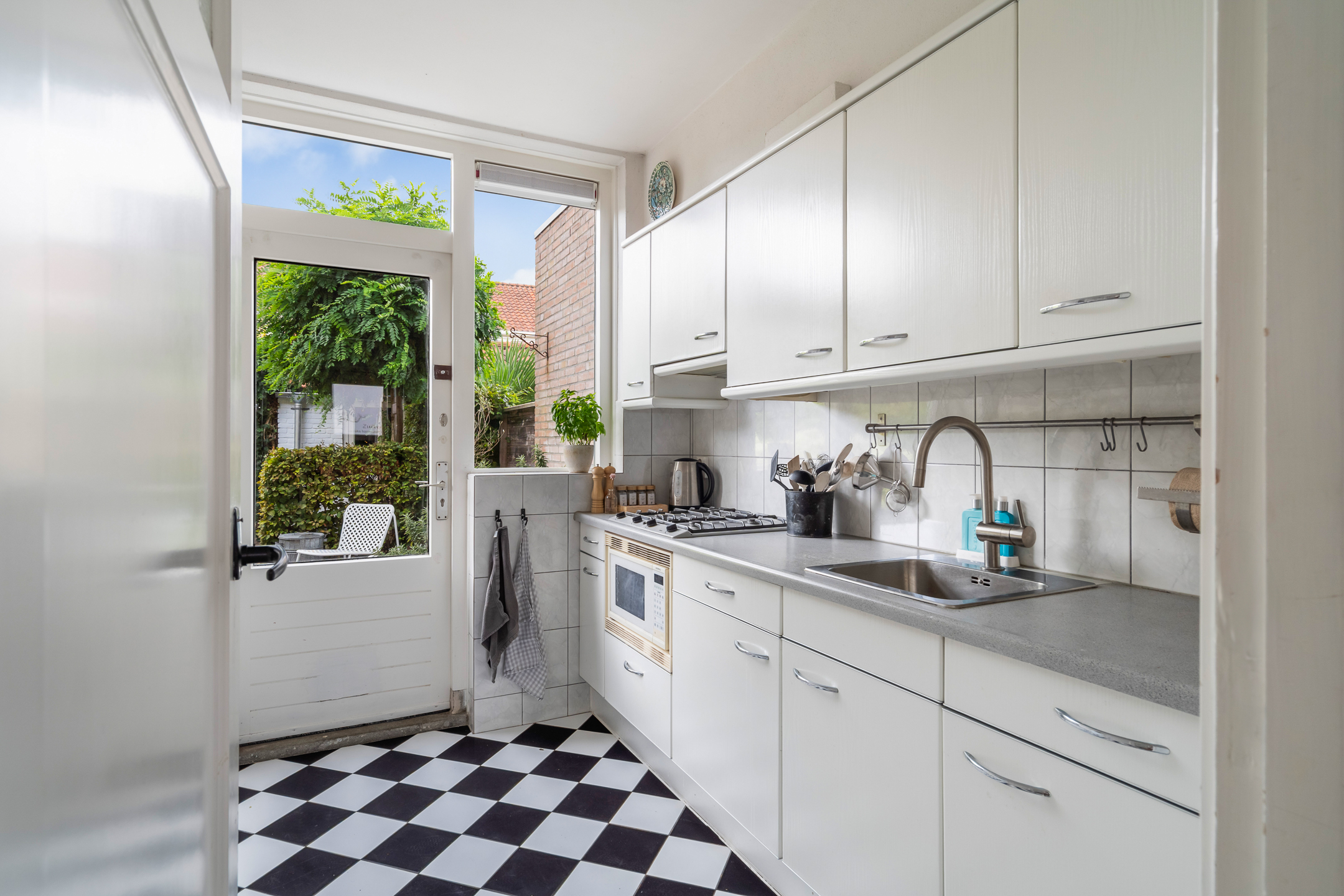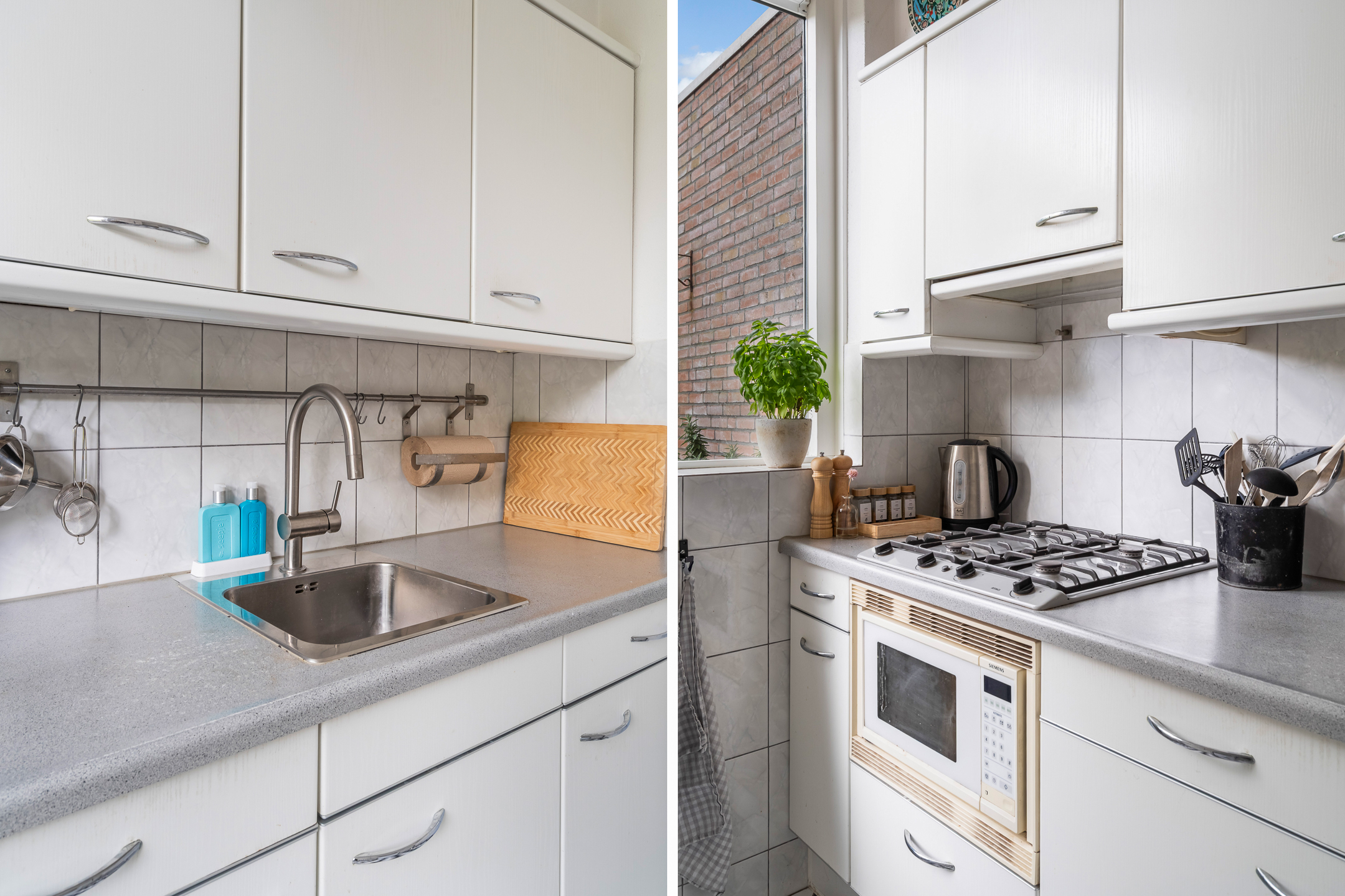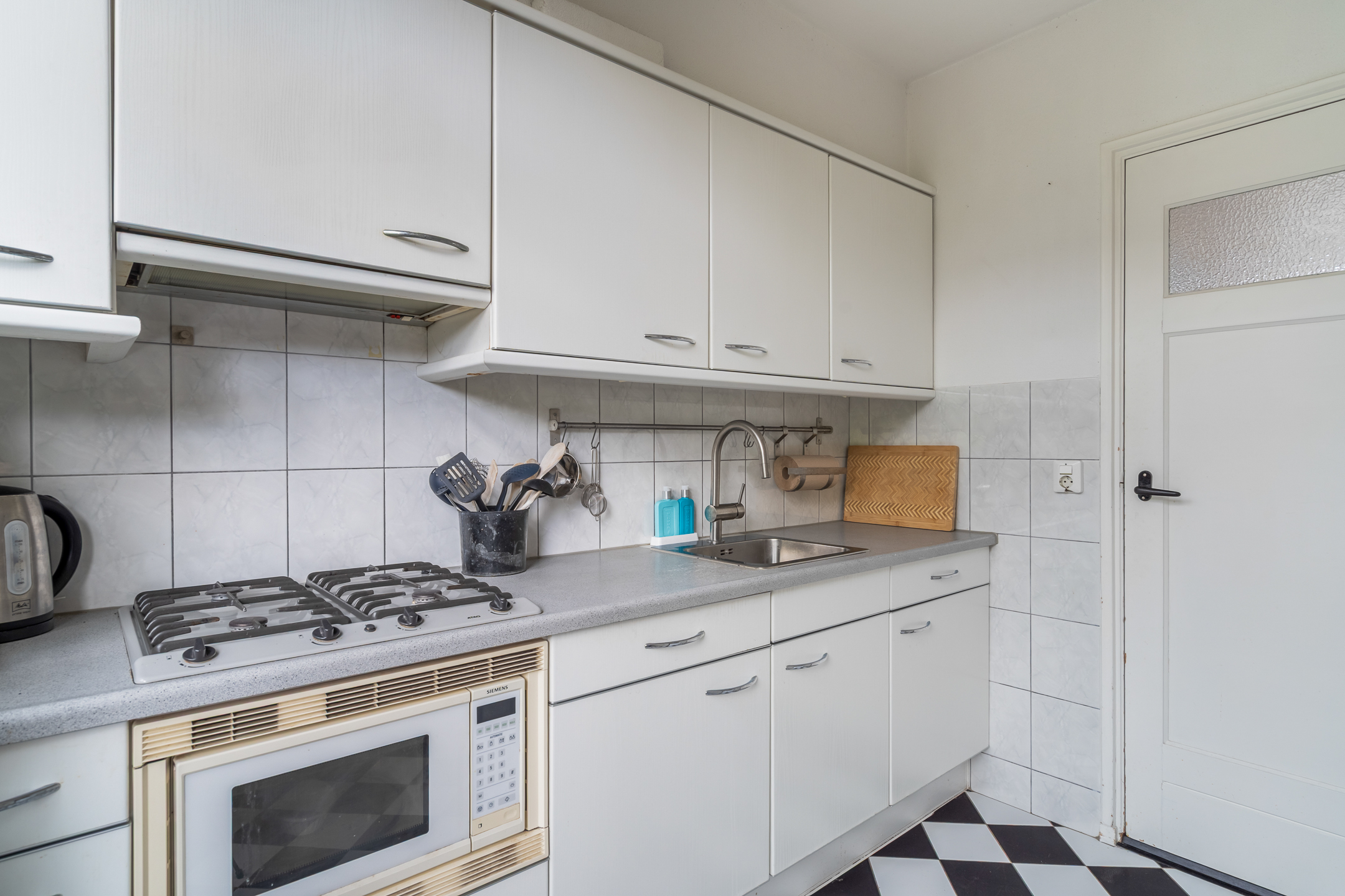 - De gesloten keuken bevindt zich aan de achterzijde van de woning en biedt via een deur toegang tot de achtertuin. De keuken is voorzien van een 4-pits gaskookplaat, afzuigkap, magnetron, losse vaatwasser en losse koel-/vriescombinatie;