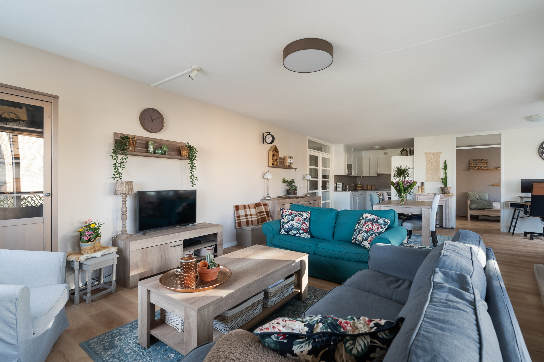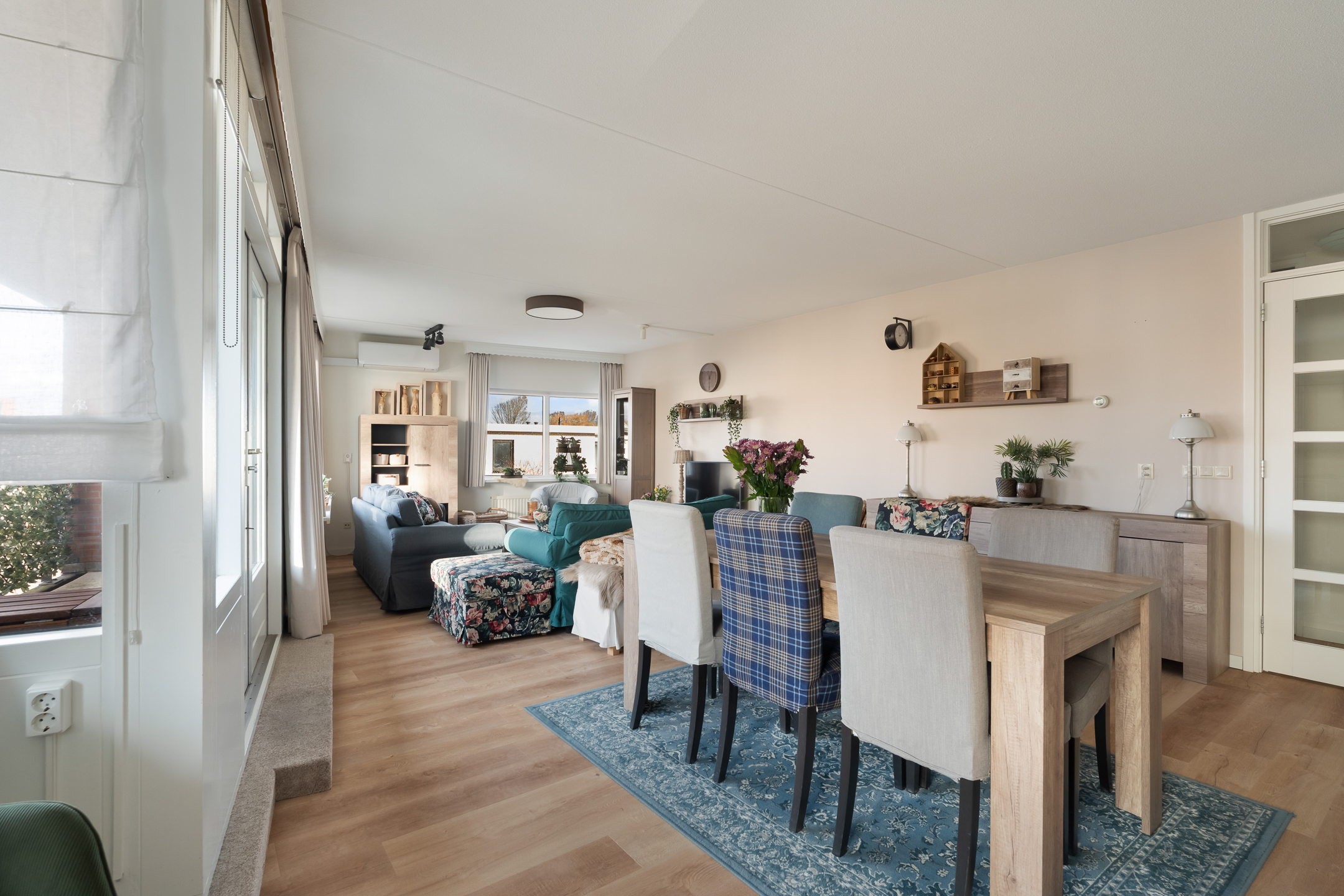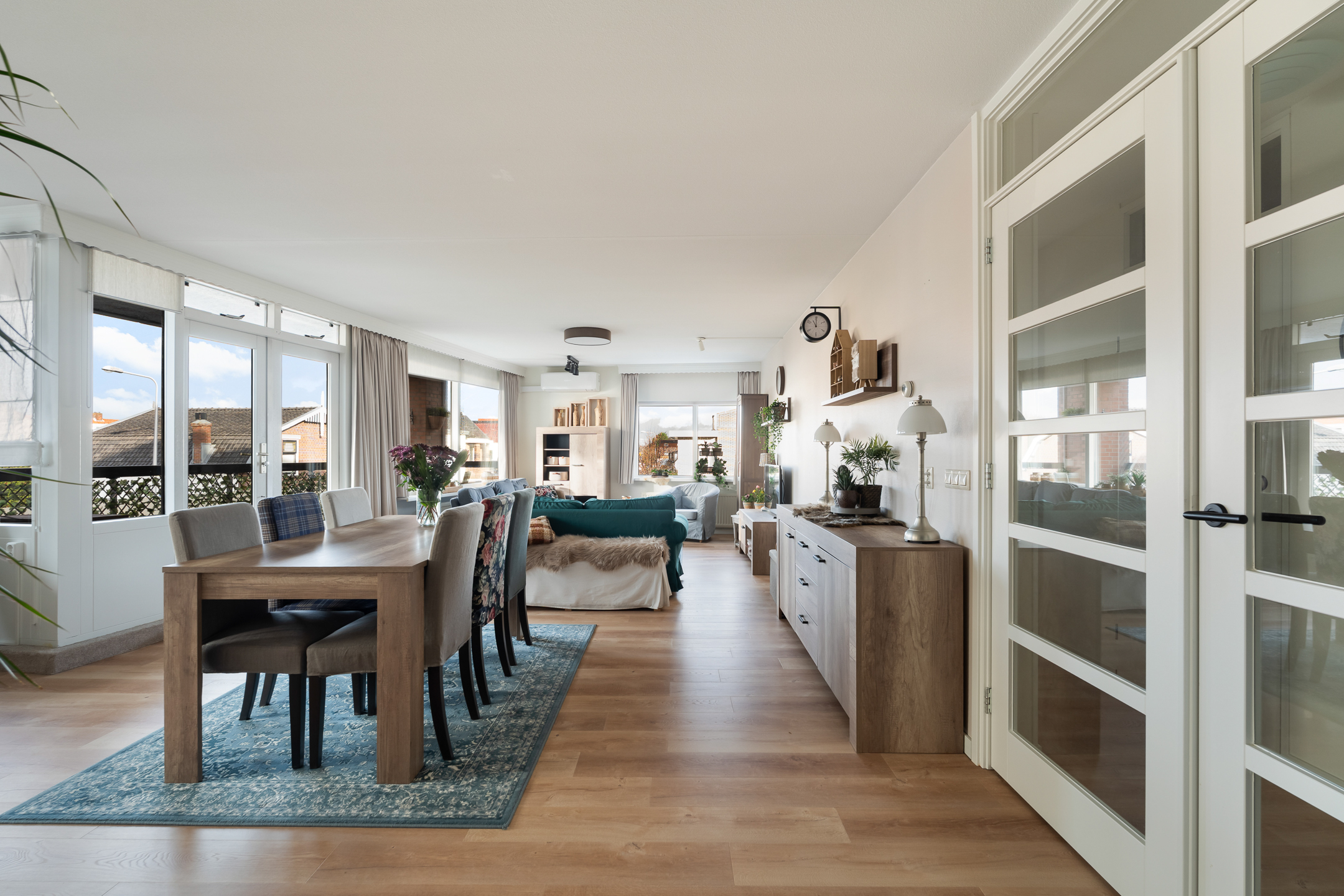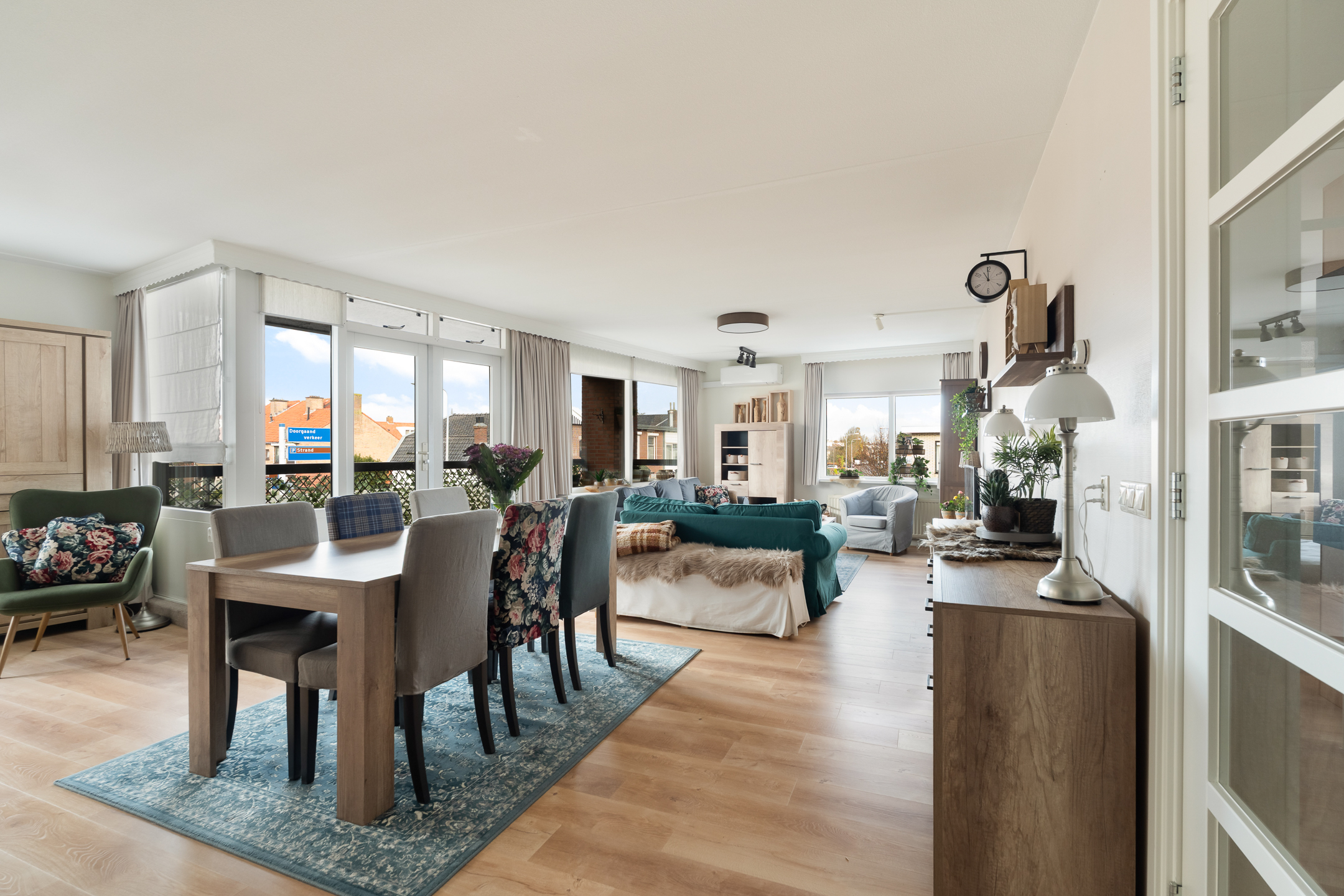 - Ruime en lichte woonkamer met grote raampartijen, laminaatvloer, airco (2024) en de openslaande deuren geven toegang tot het zonnige balkon.