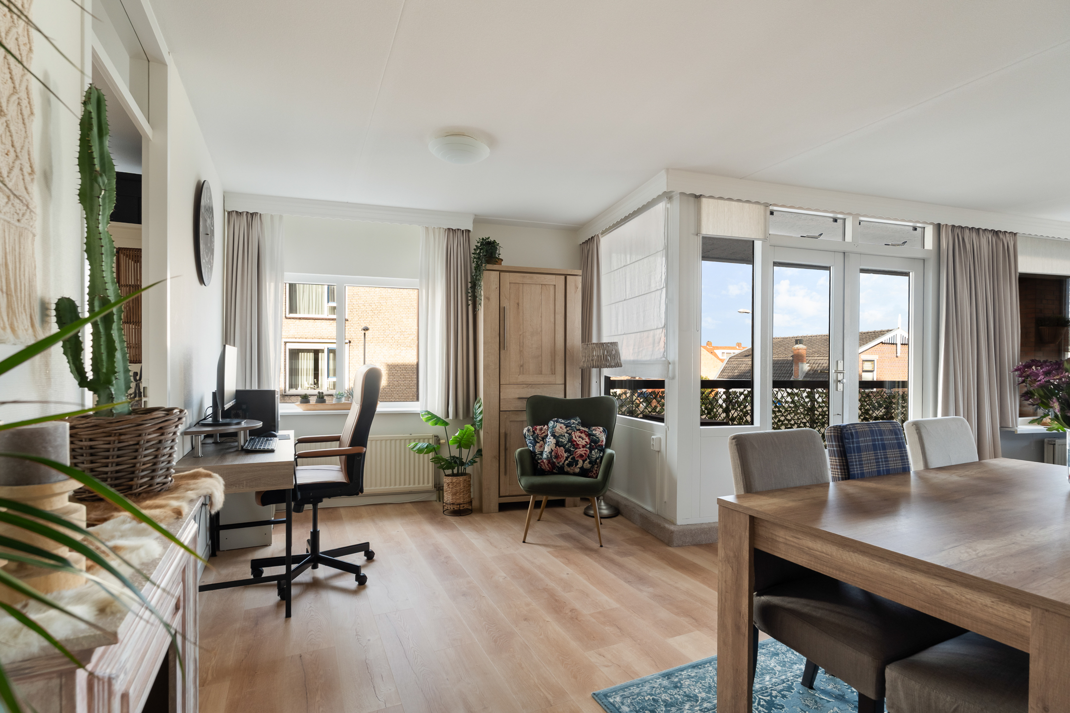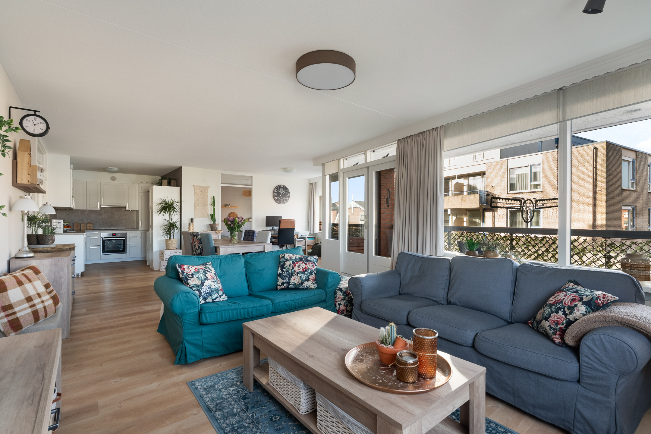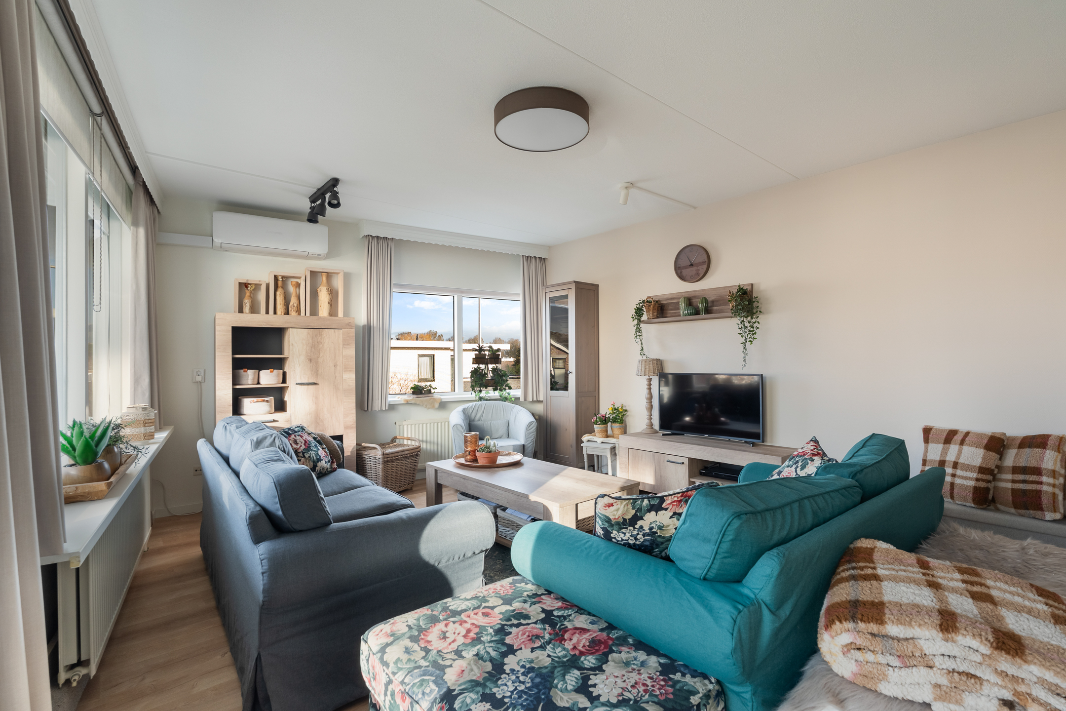 - Ruime en lichte woonkamer met grote raampartijen, laminaatvloer, airco (2024) en de openslaande deuren geven toegang tot het zonnige balkon.