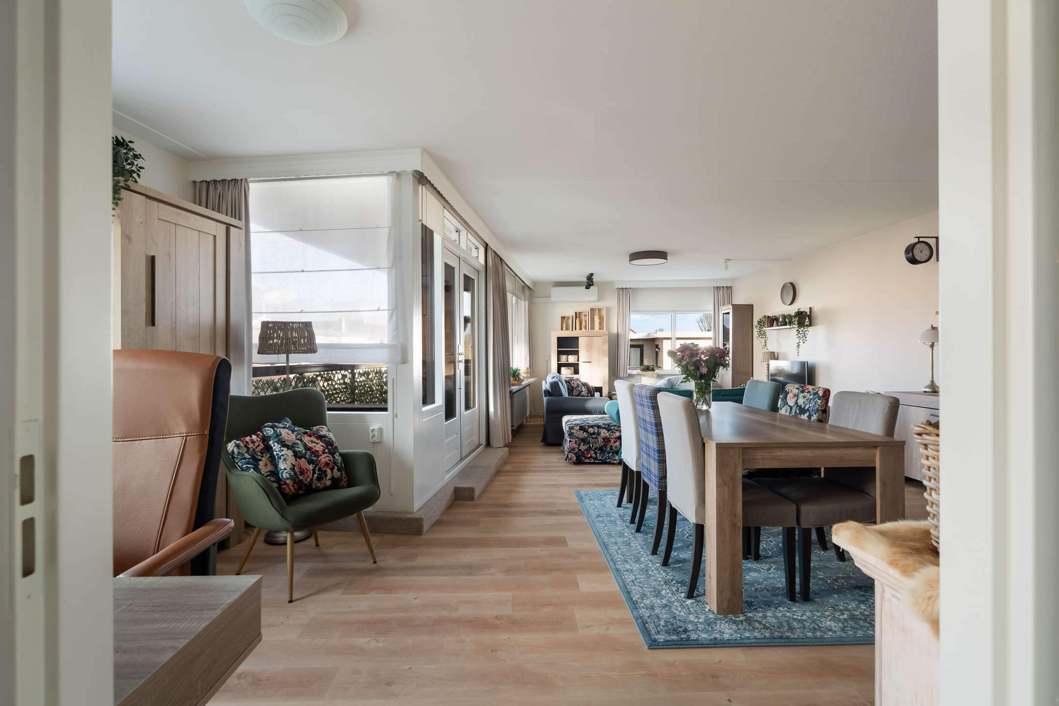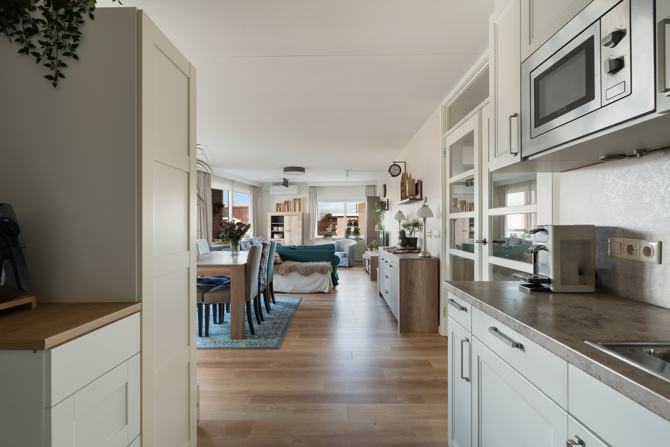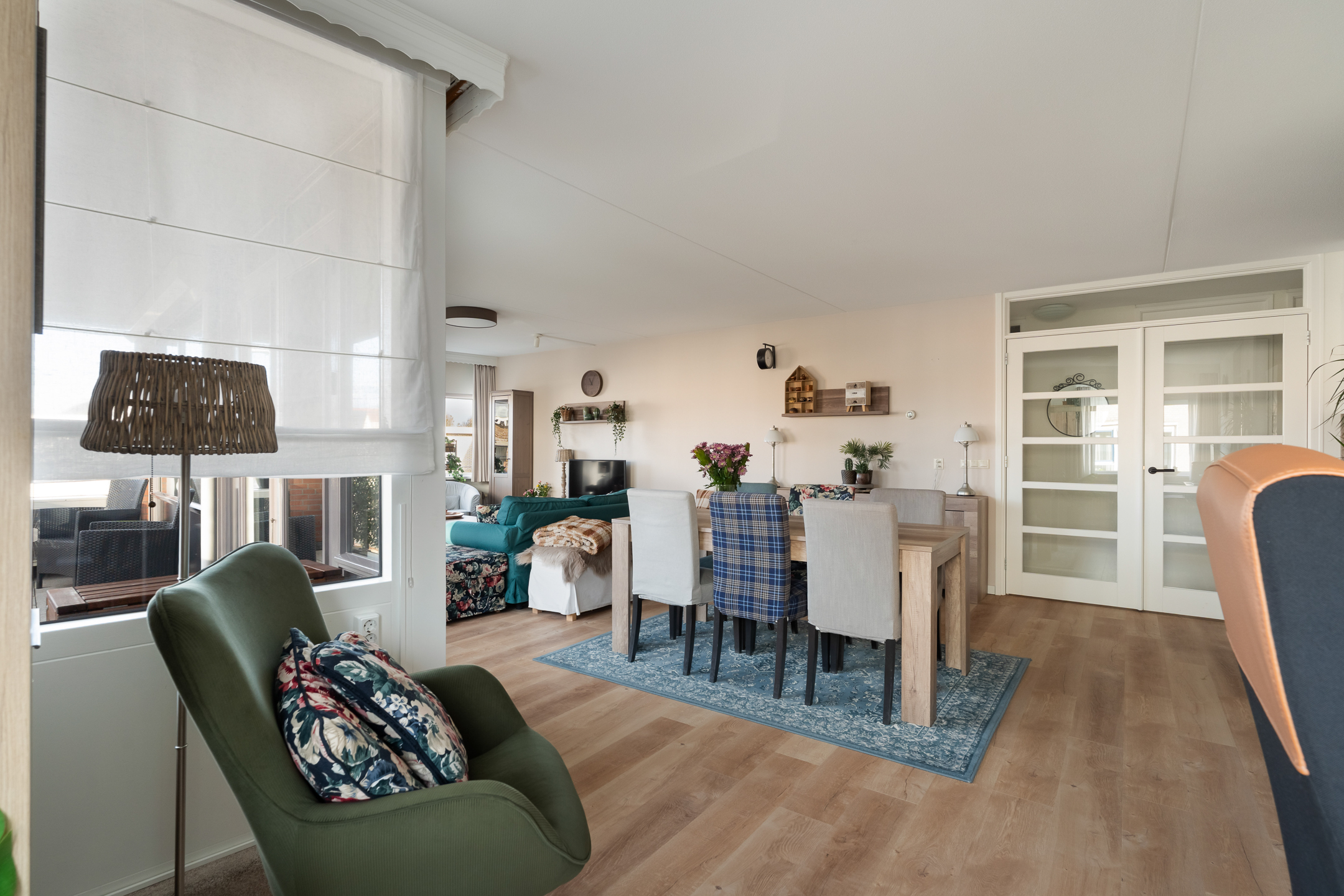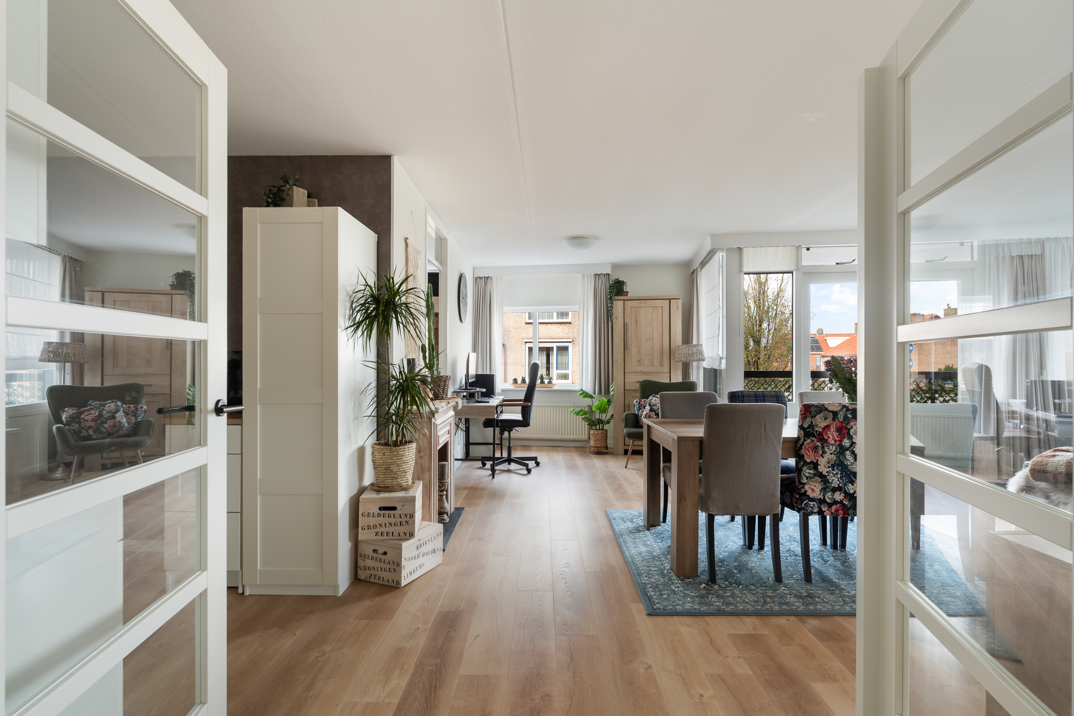 - Ruime en lichte woonkamer met grote raampartijen, laminaatvloer, airco (2024) en de openslaande deuren geven toegang tot het zonnige balkon.