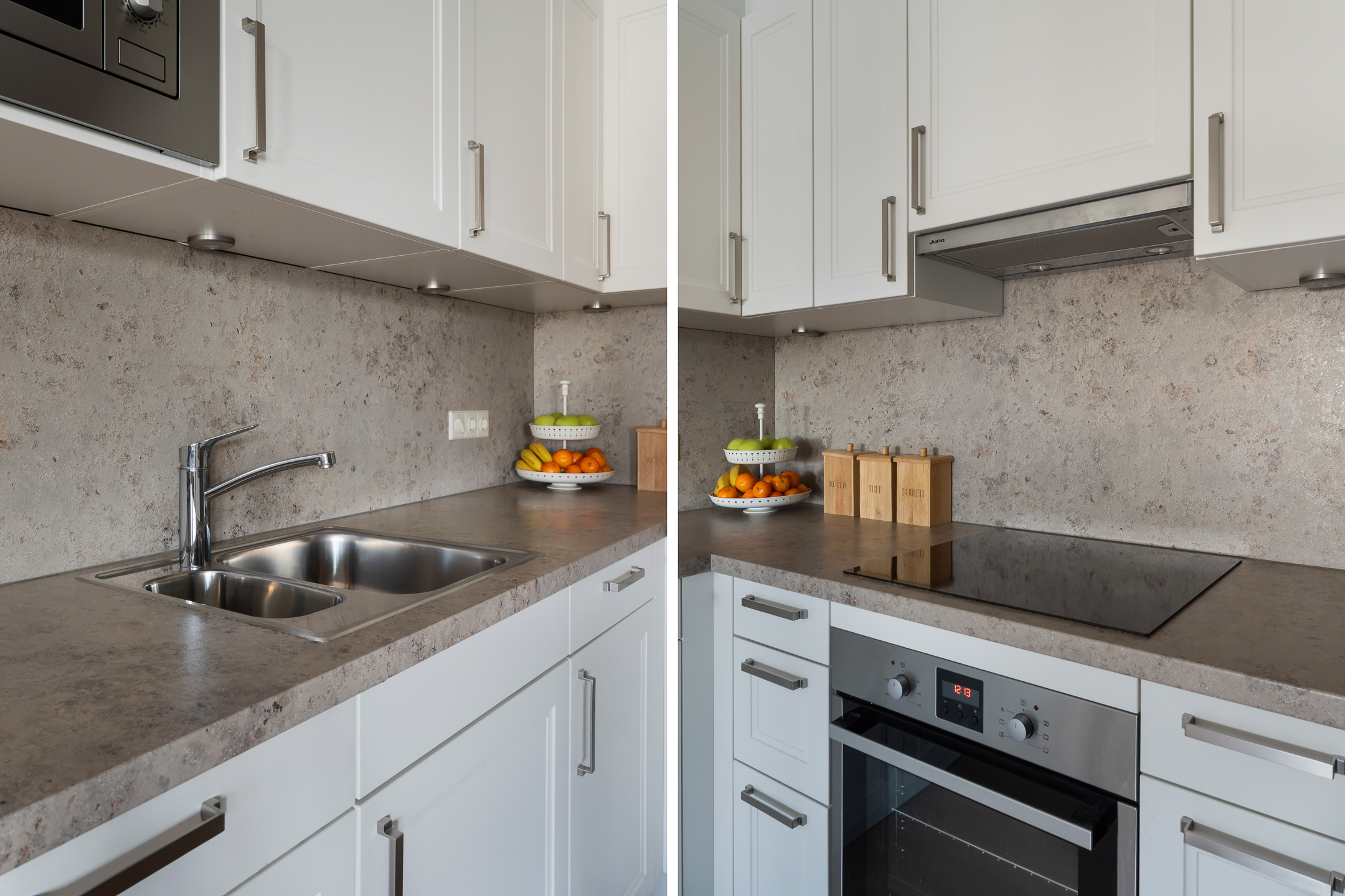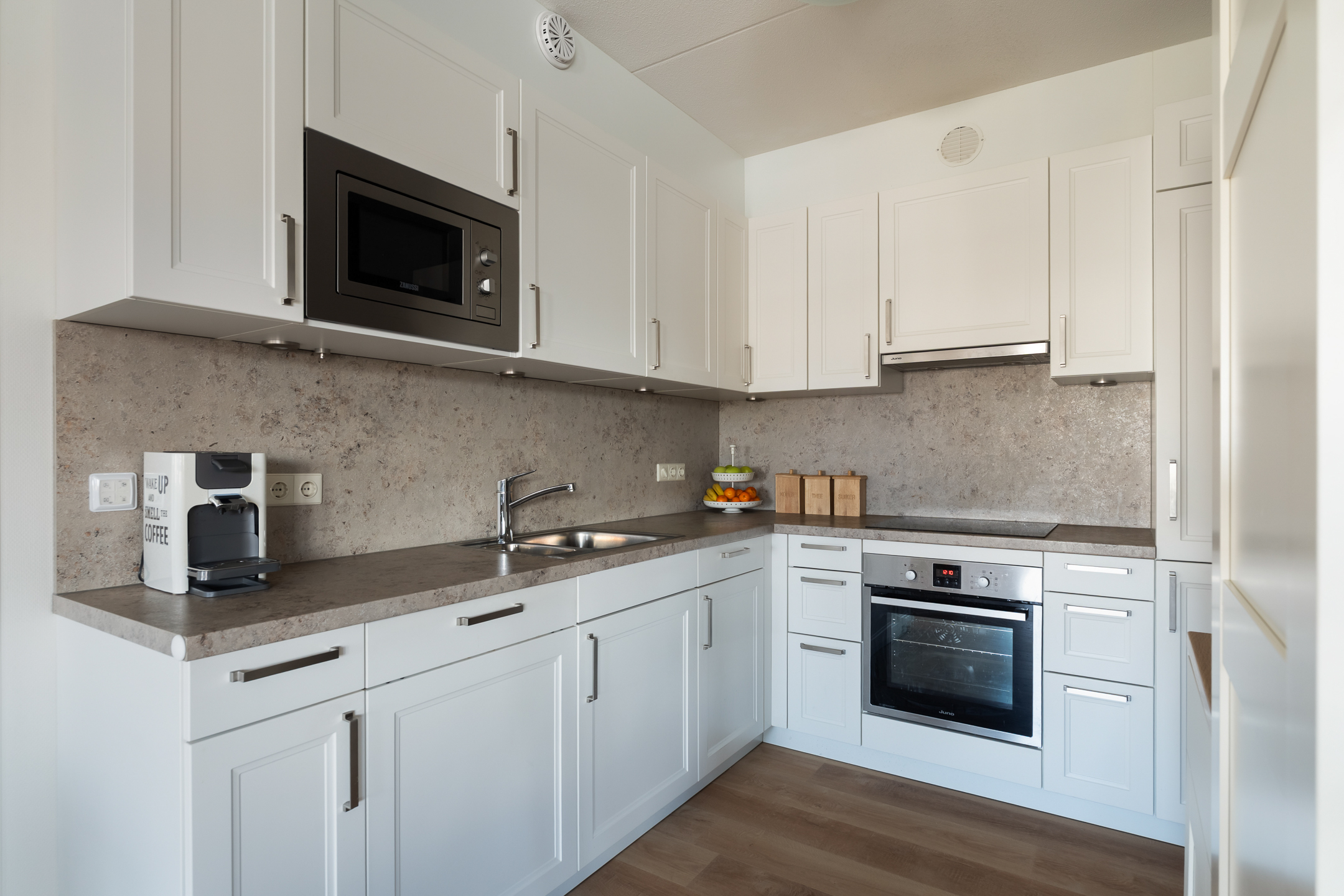- Moderne open keuken in lichte kleurstelling en voorzien van diverse inbouwapparatuur.