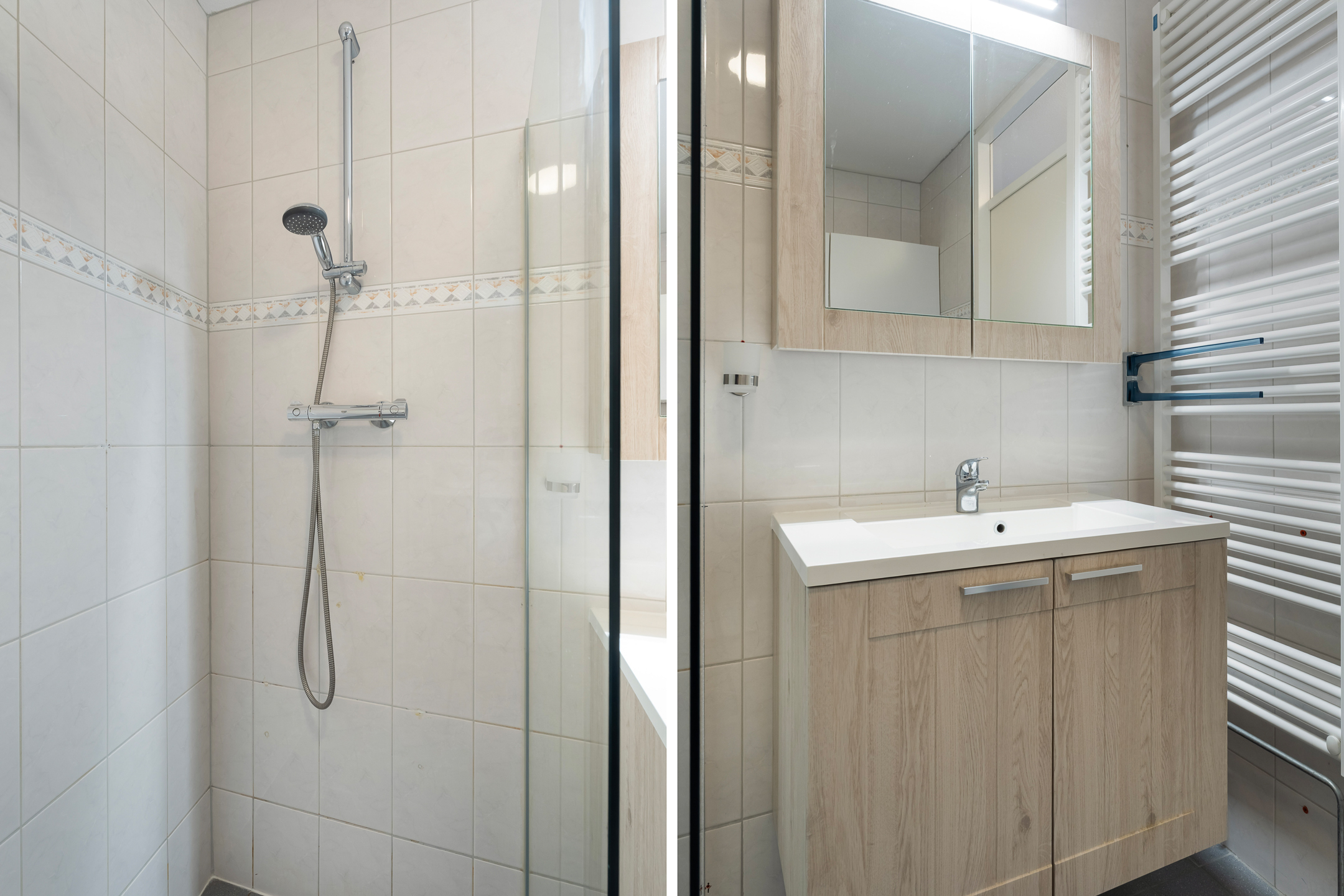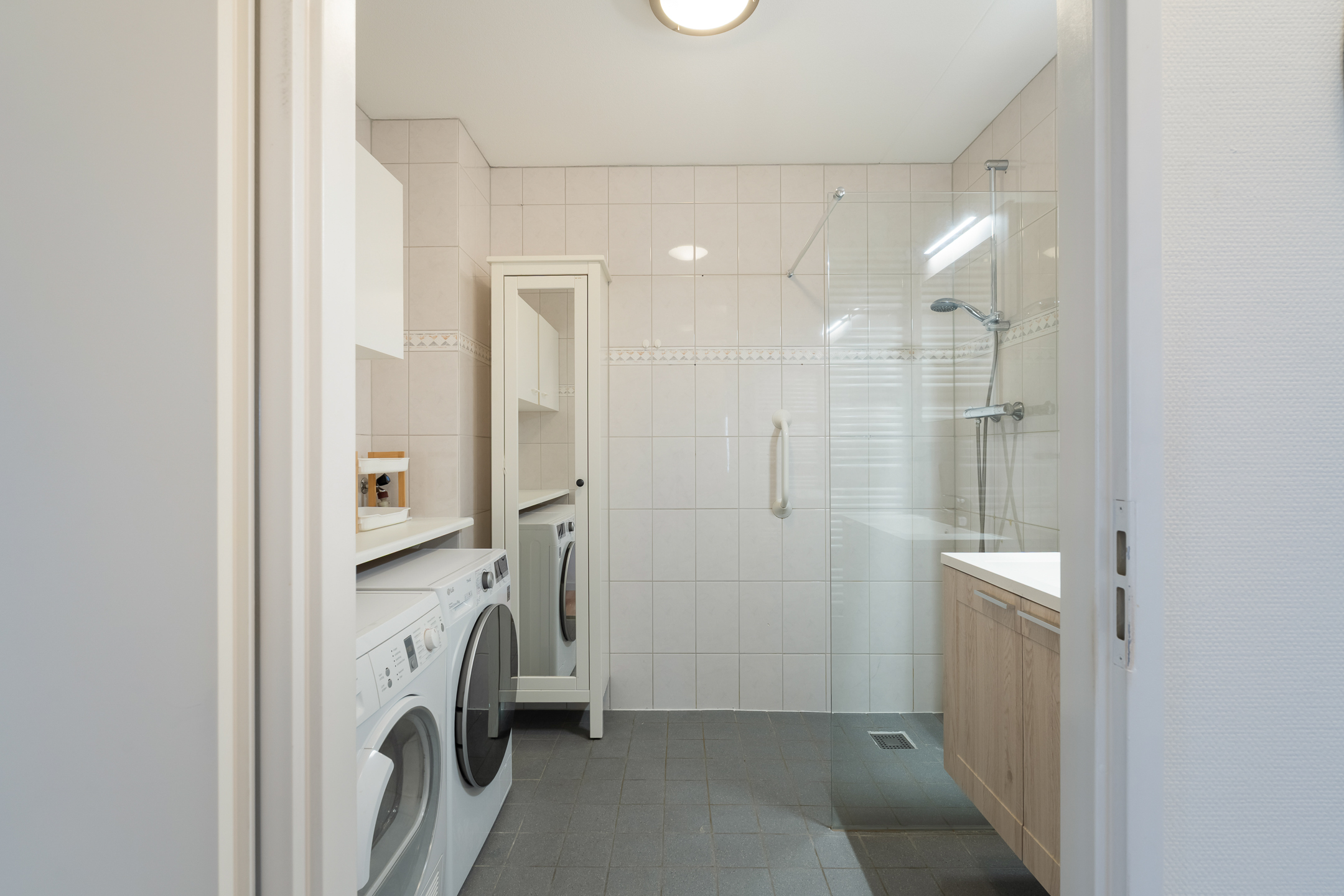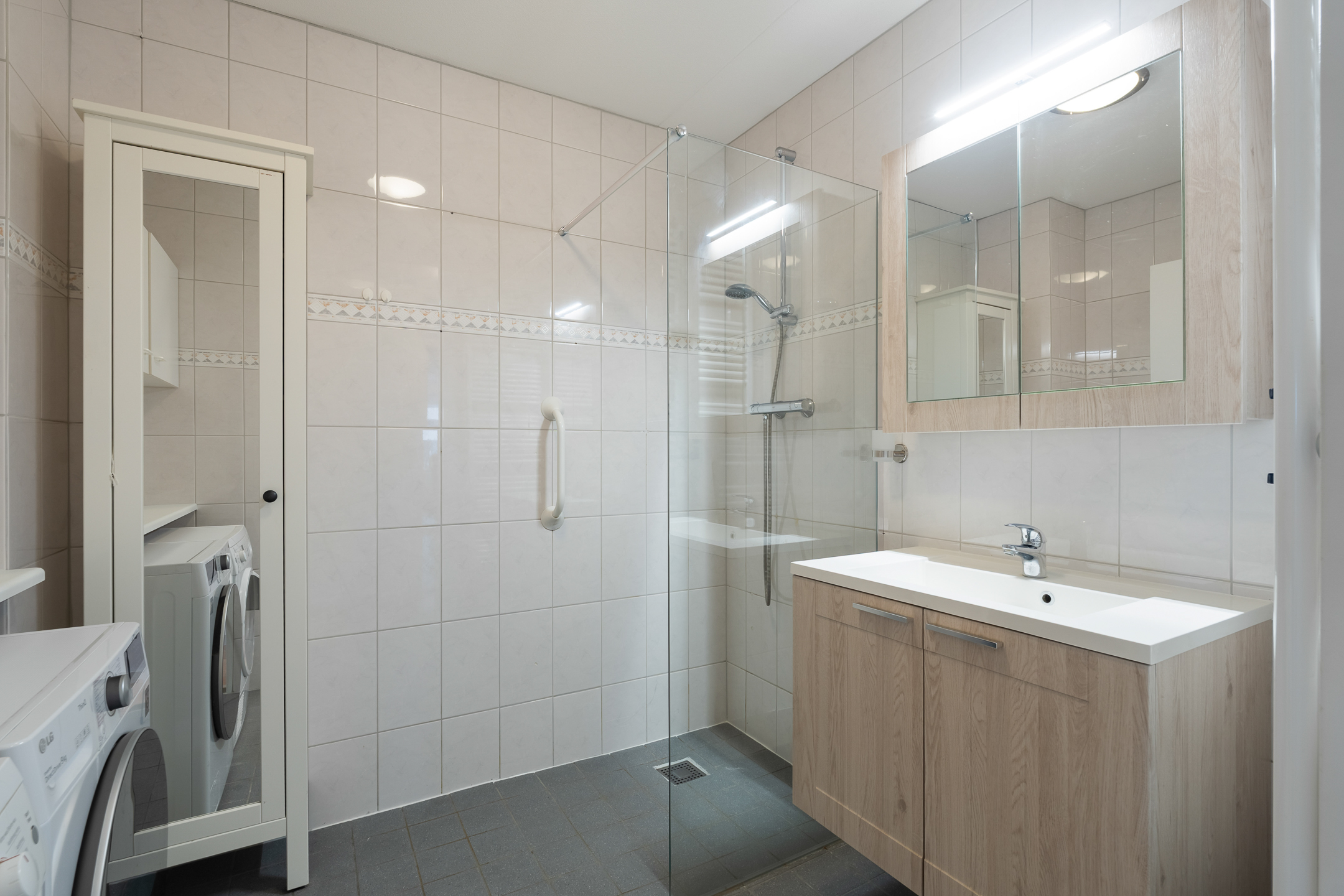 - Nette geheel betegelde inpandige badkamer met inloopdouche, wastafelmeubel en wasmachine-aansluiting.