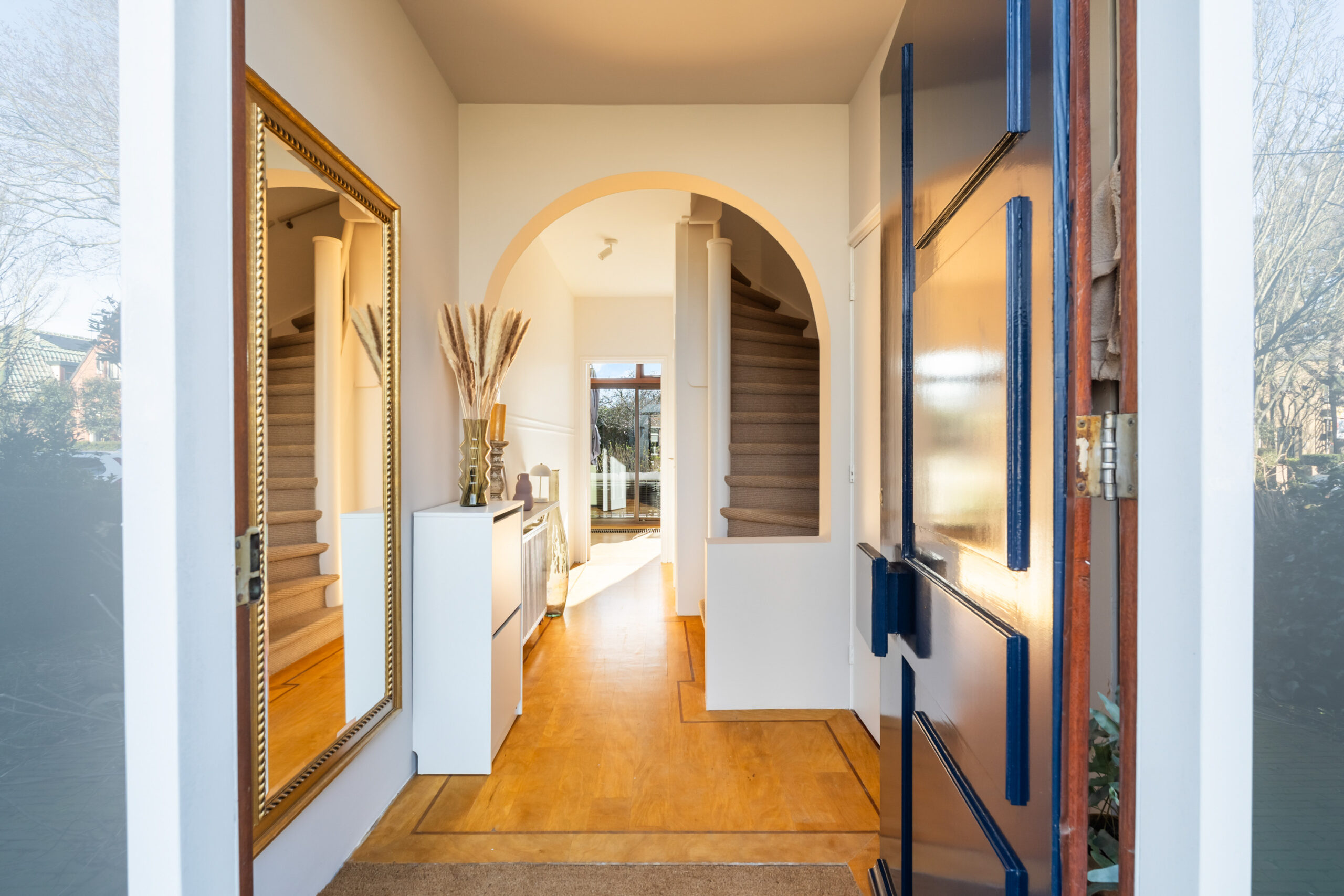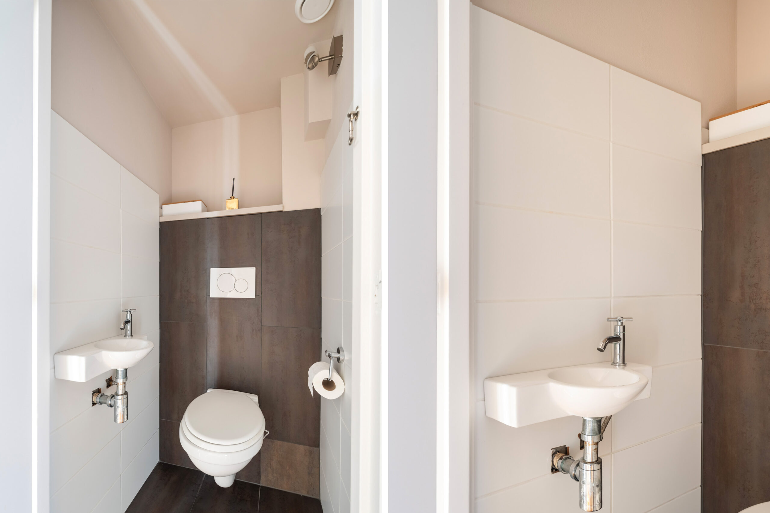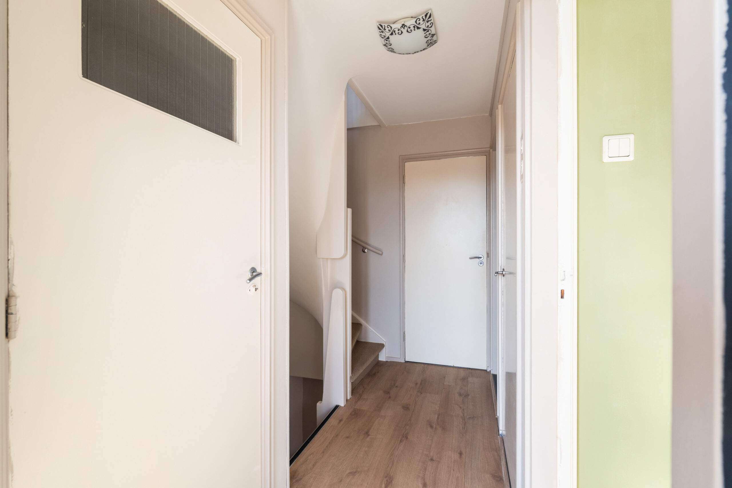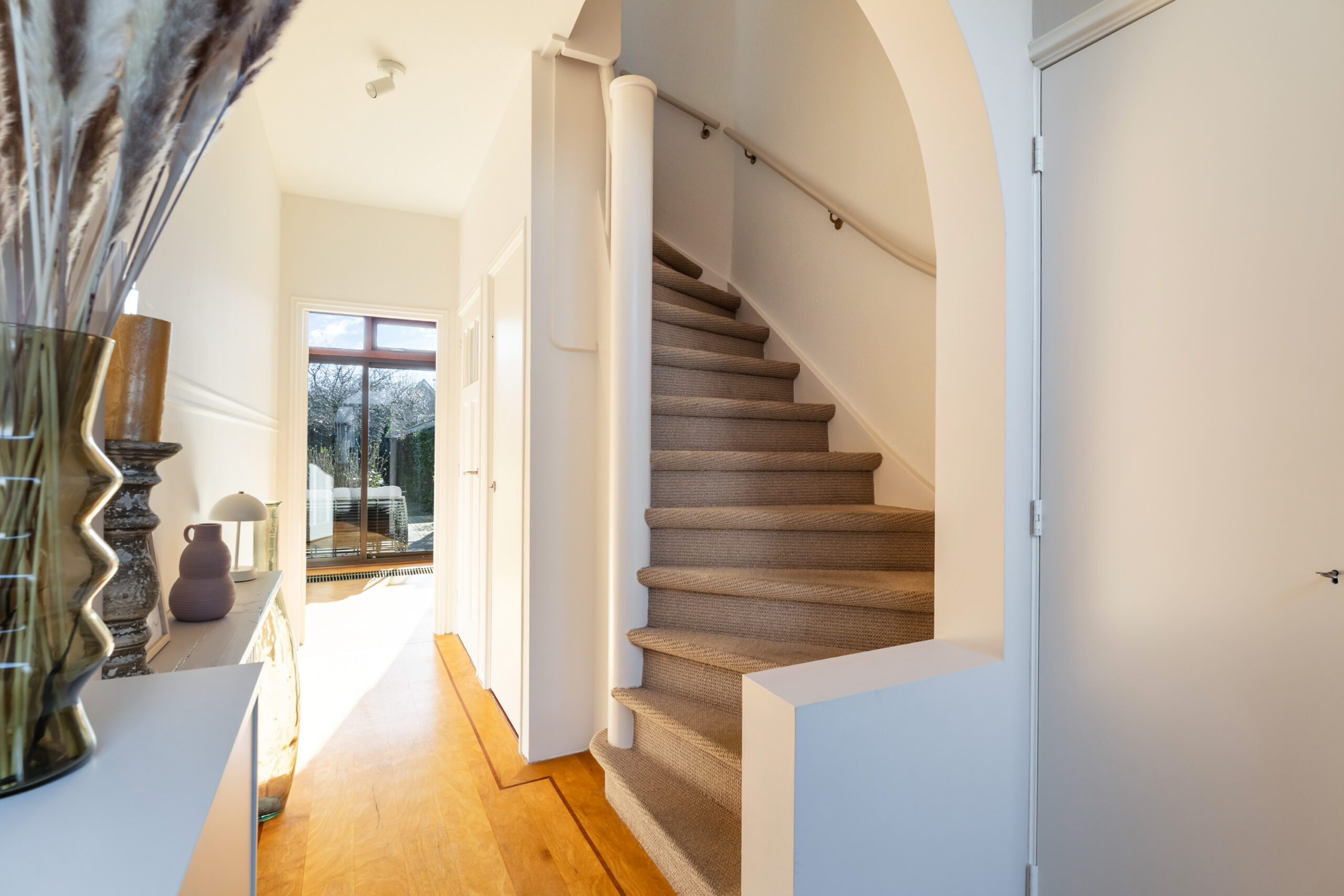 - Lichte hal met trapopgang naar de eerste verdieping, trapkast en hangend toilet met fonteintje.