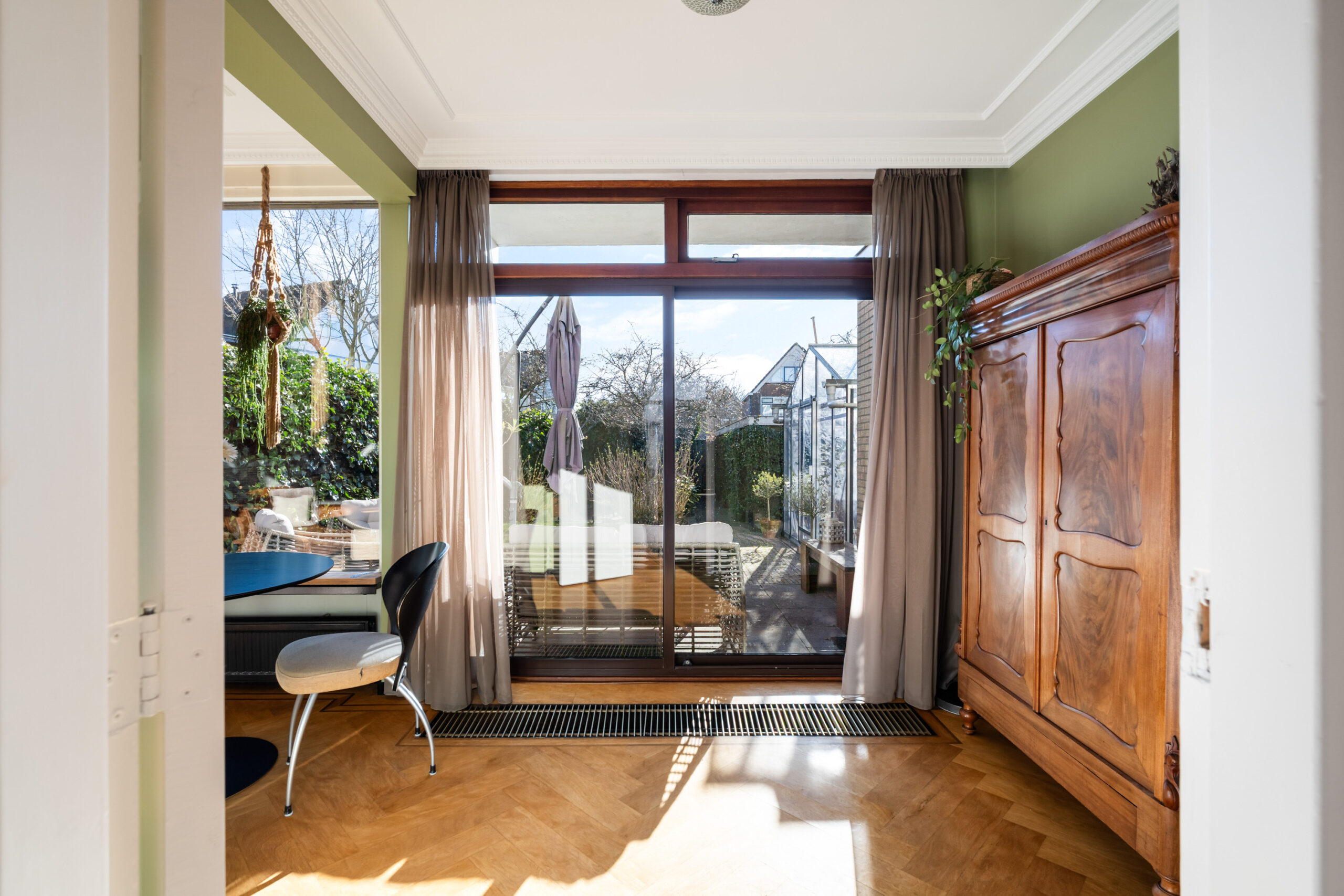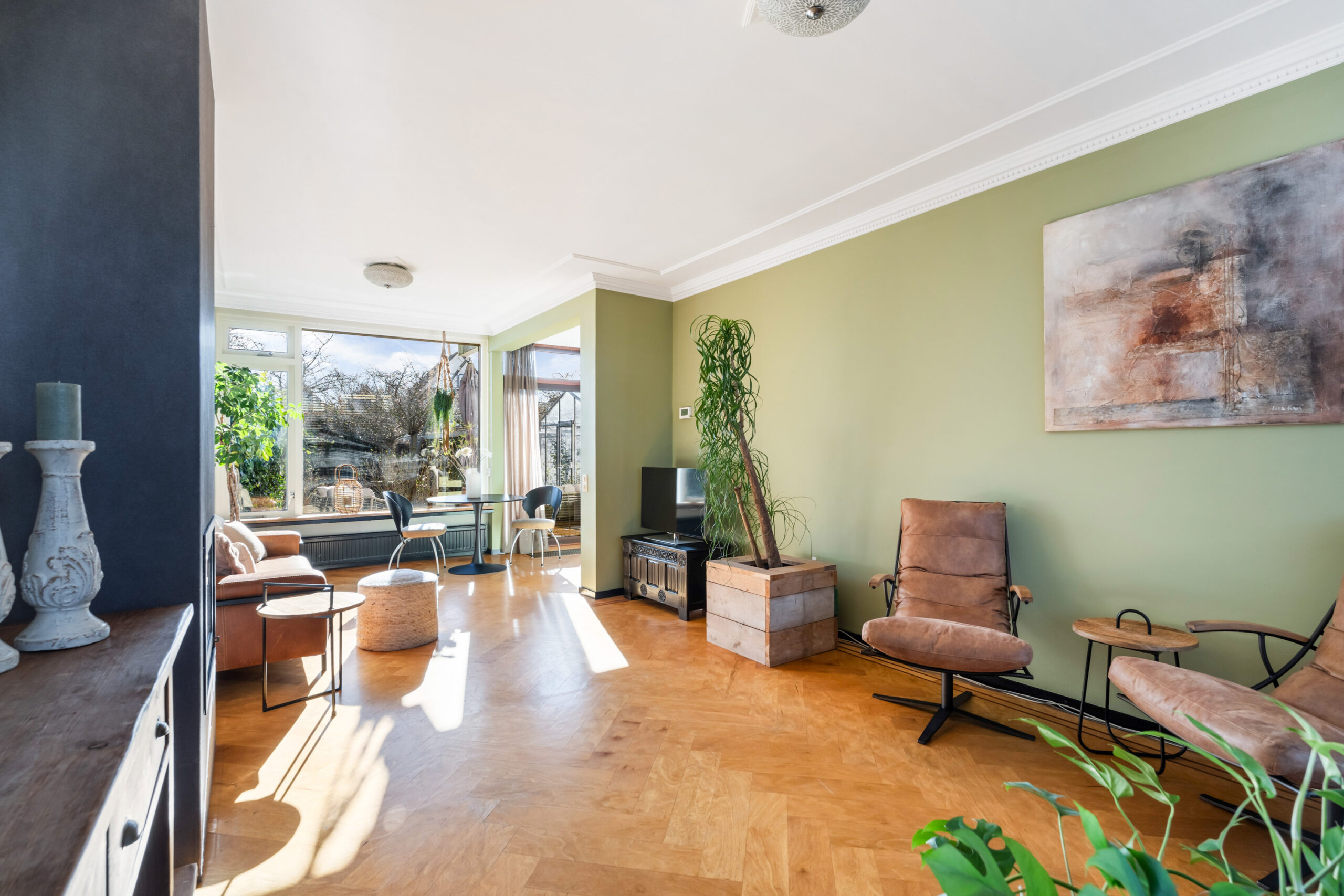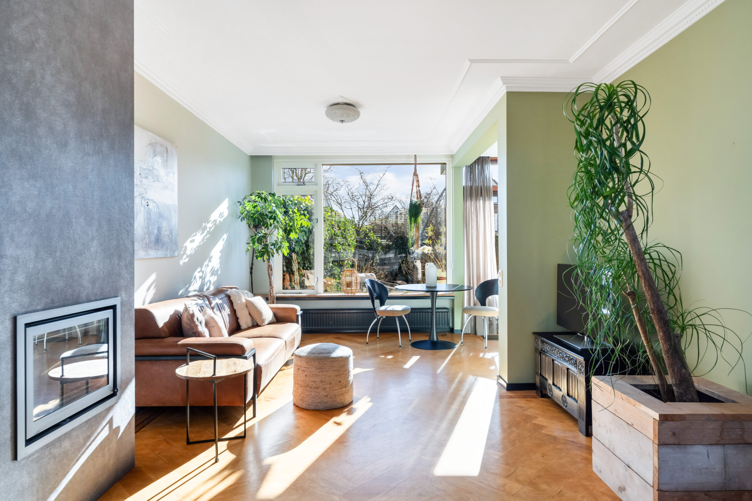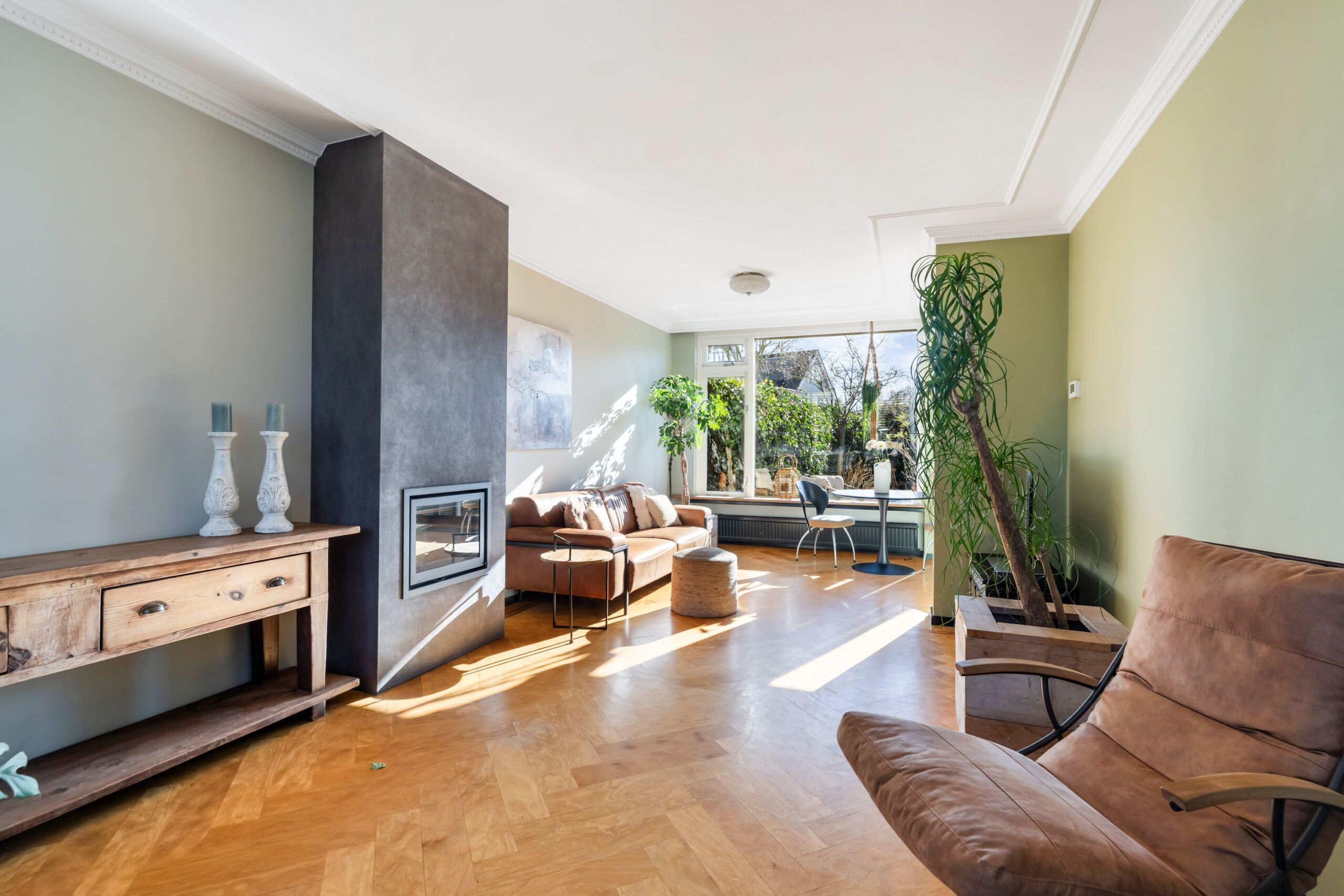 - Bijzonder sfeervolle en ruime doorzonwoonkamer met prachtig gestuct plafond met sierlijsten, fraaie visgraat parketvloer, houtkachel en schuifpui naar de royale achtertuin van ca. 22 meter diep. Door de grote raampartijen (met screens) is er veel lichtinval in de woning.