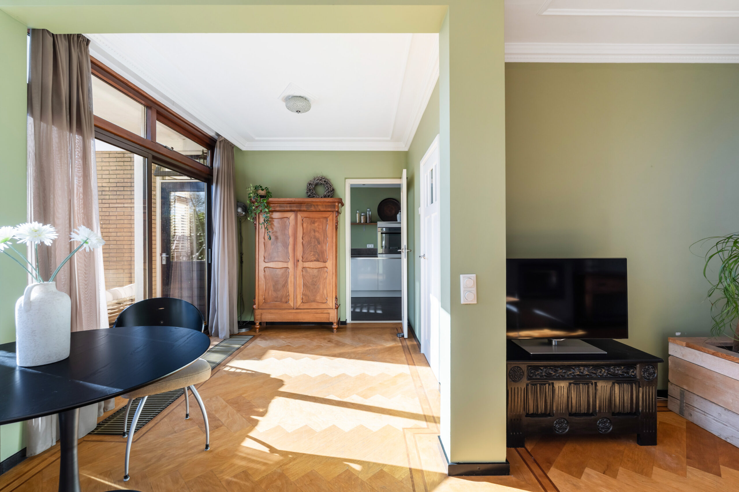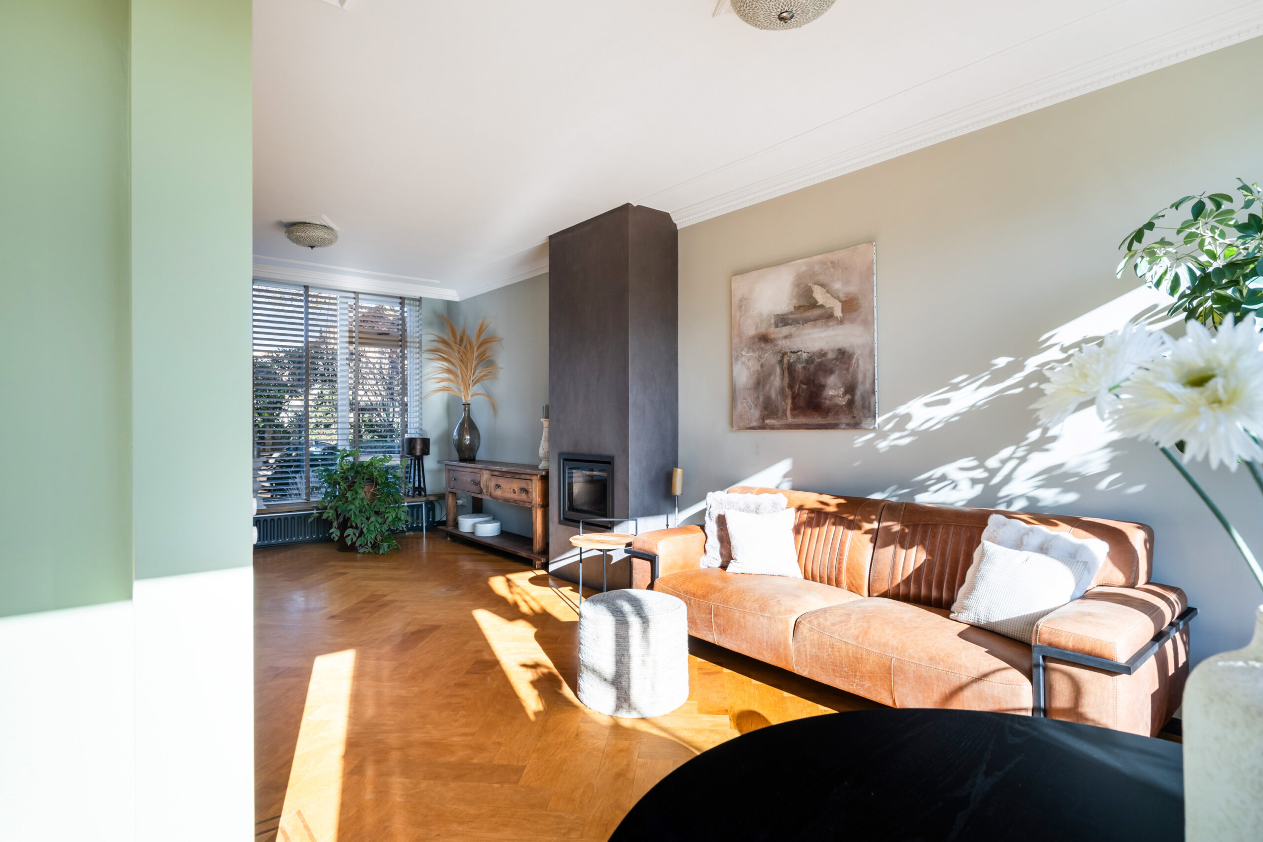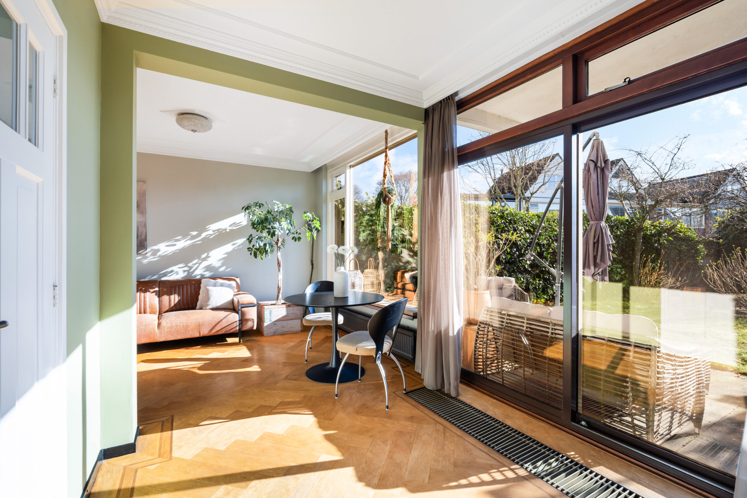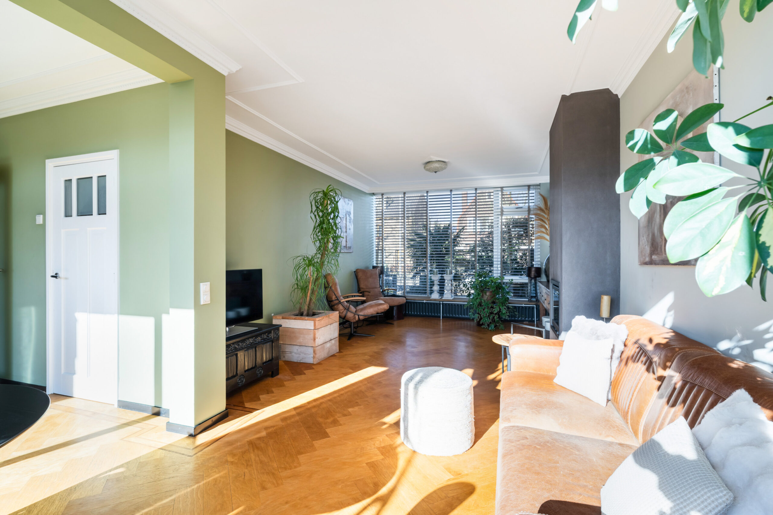 - Bijzonder sfeervolle en ruime doorzonwoonkamer met prachtig gestuct plafond met sierlijsten, fraaie visgraat parketvloer, houtkachel en schuifpui naar de royale achtertuin van ca. 22 meter diep. Door de grote raampartijen (met screens) is er veel lichtinval in de woning.