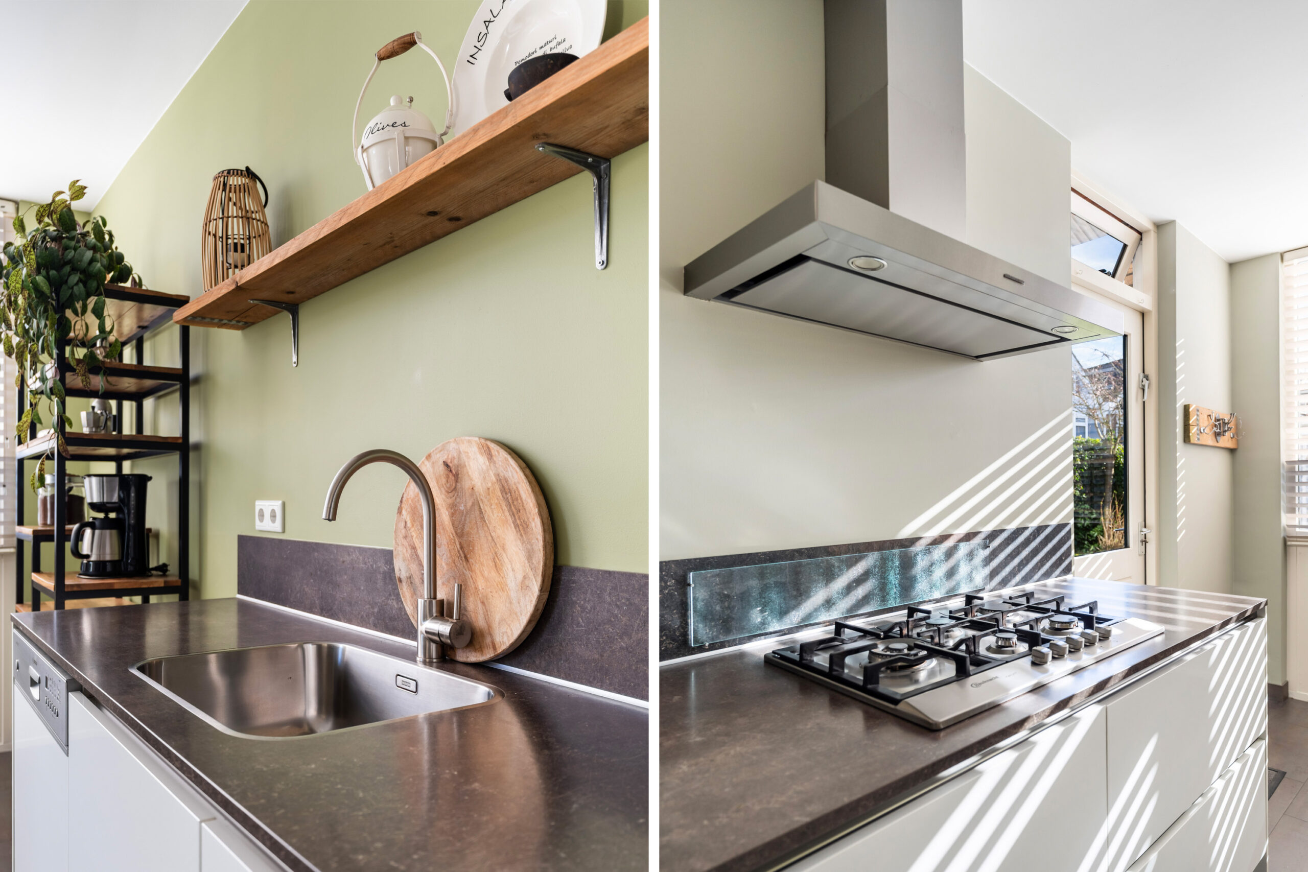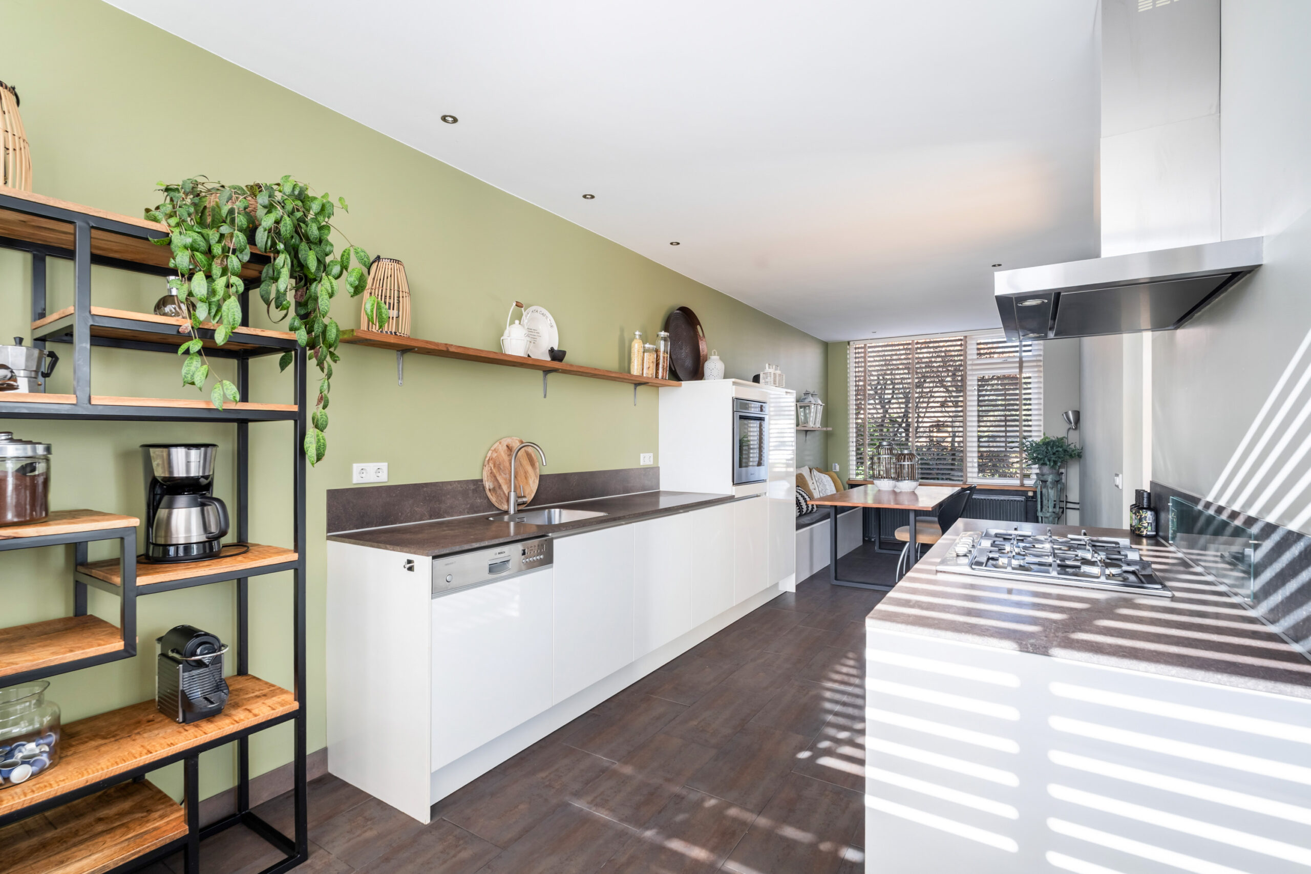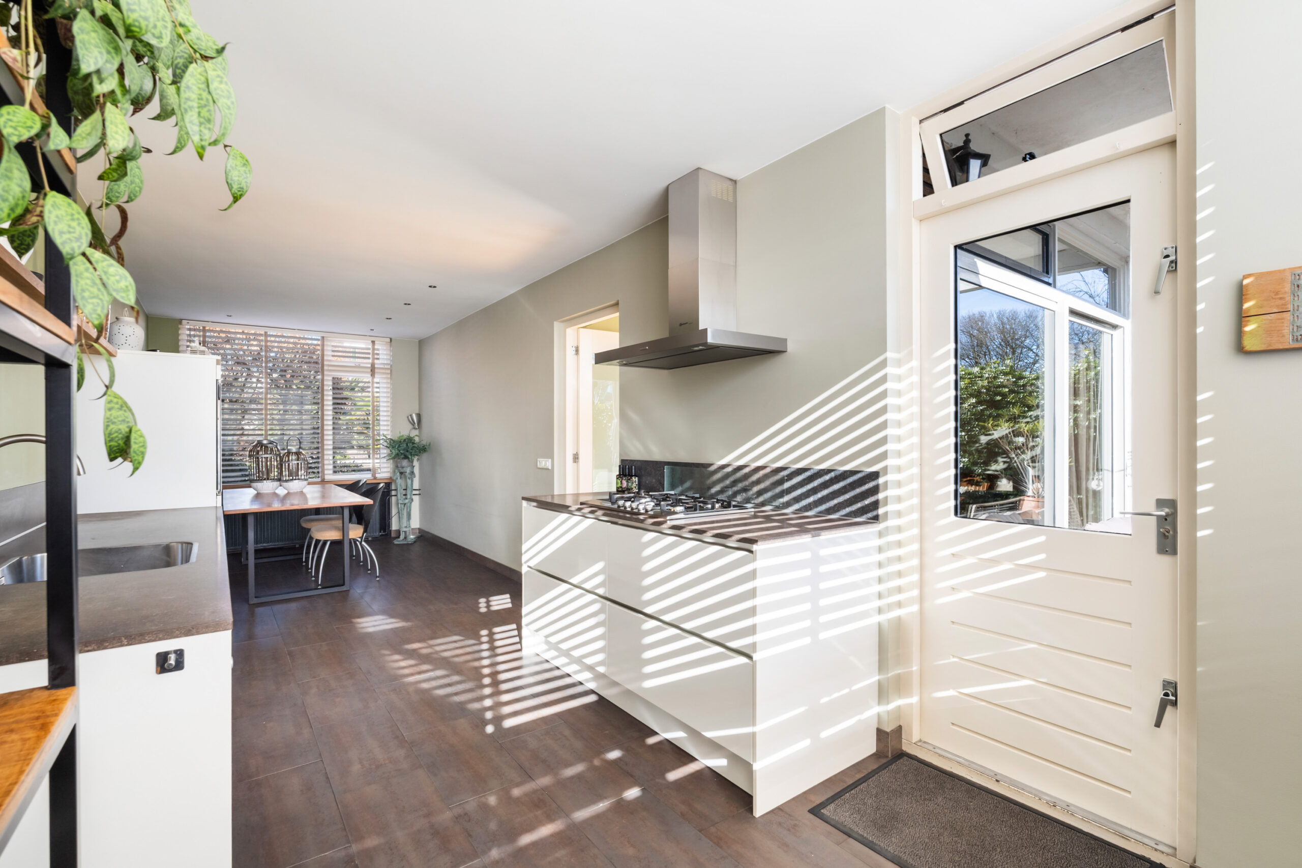 - Moderne woonkeuken voorzien van vloerverwarming en aan beide zijden aanrechtblad. De keuken is voorzien van diverse inbouwapparatuur, waaronder een 5-pits gasfornuis, afzuigkap, vaatwasser, combi-oven en koel-vries combinatie. Via de loopdeur bereikt u de zeer diepe en zonnige achtertuin gelegen op het zuidoosten.