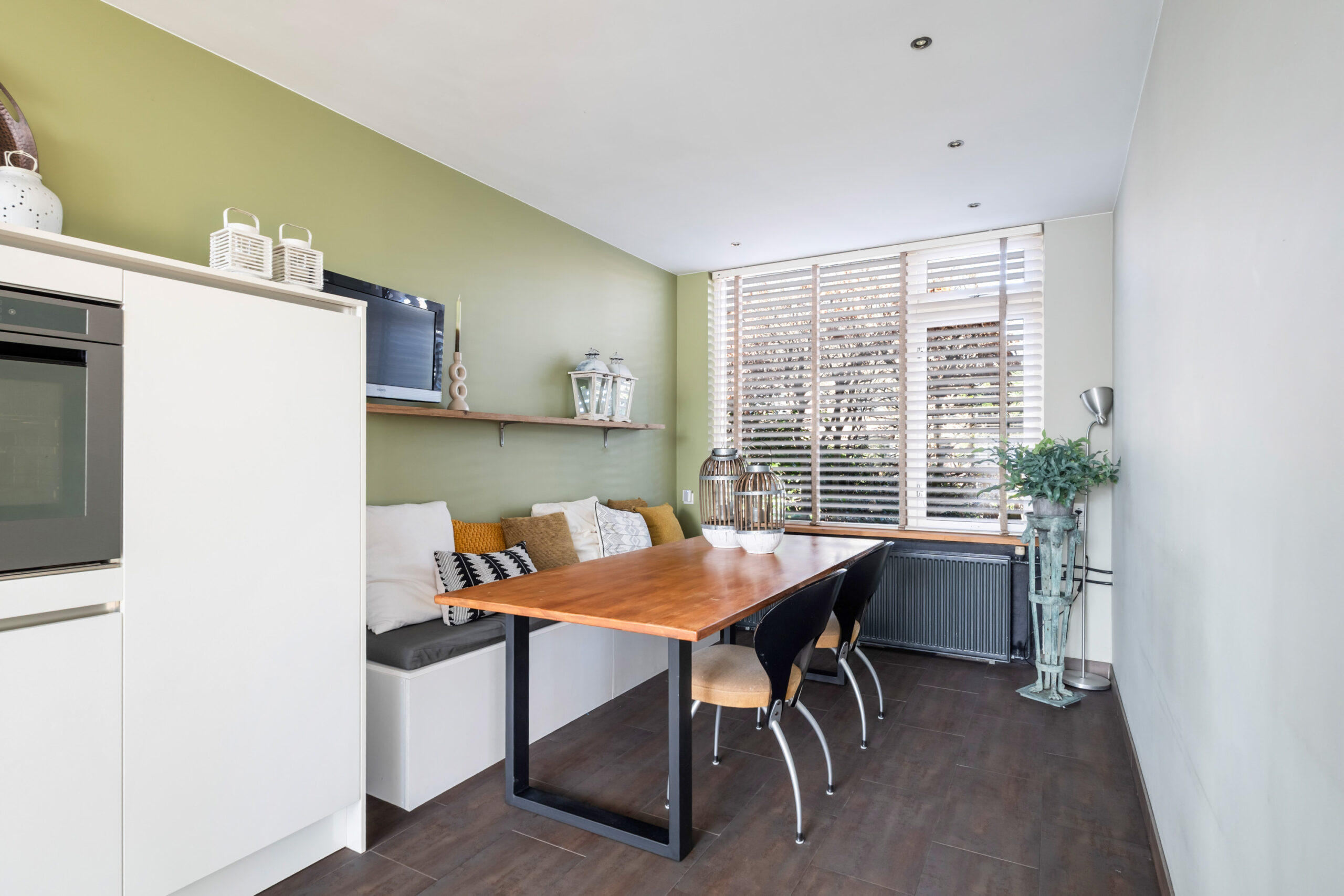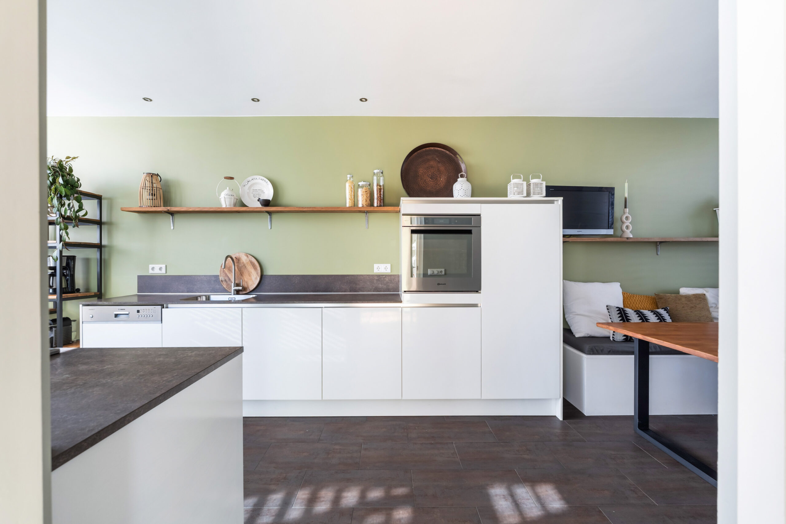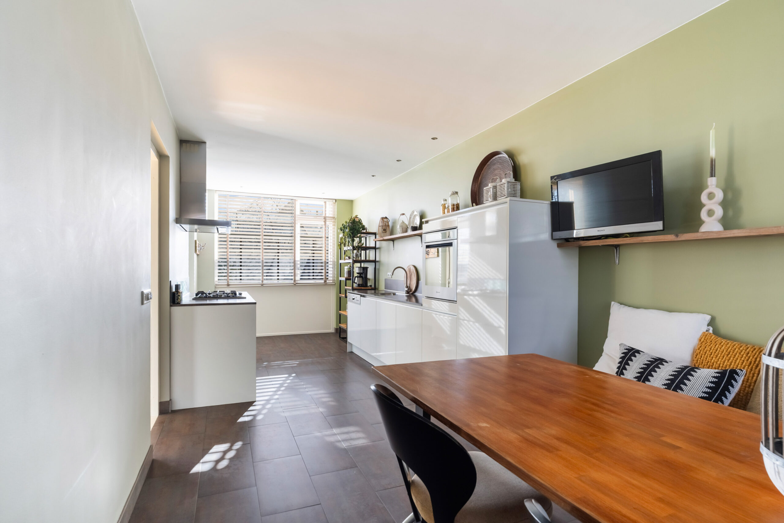- Moderne woonkeuken voorzien van vloerverwarming en aan beide zijden aanrechtblad. De keuken is voorzien van diverse inbouwapparatuur, waaronder een 5-pits gasfornuis, afzuigkap, vaatwasser, combi-oven en koel-vries combinatie. Via de loopdeur bereikt u de zeer diepe en zonnige achtertuin gelegen op het zuidoosten.