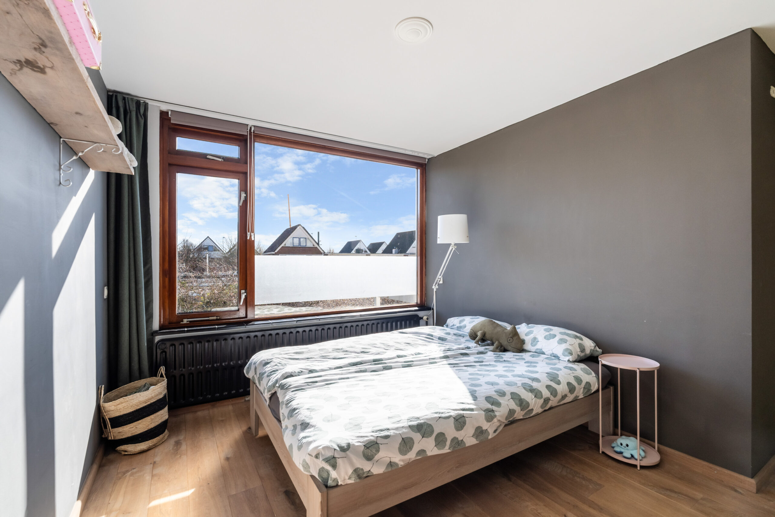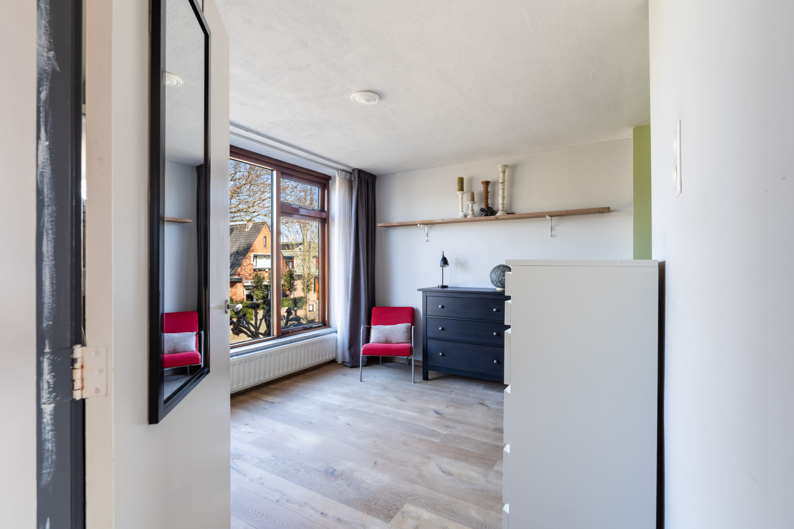 - Ruime slaapkamer (ca. 15 m2) aan de voorzijde van de woning gelegen, voorzien van houten kozijnen met dubbel glas.